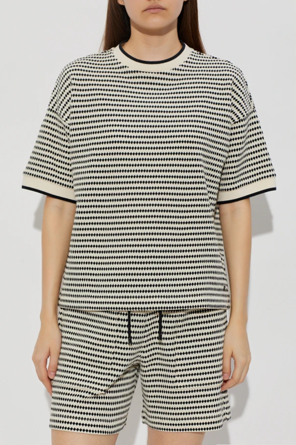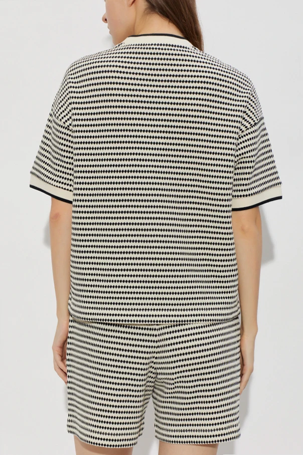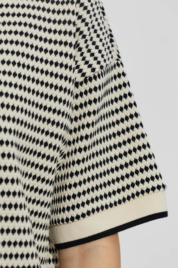 The entire surface is adorned with a refined pattern of petite black rhombuses, forming a dense geometric motif against the graceful cream background. Meticulous detailing includes wide ribbed trims at the sleeves and hem, finished with a delicate black stripe, bestowing a subtly sporty, modern edge upon this essential piece.