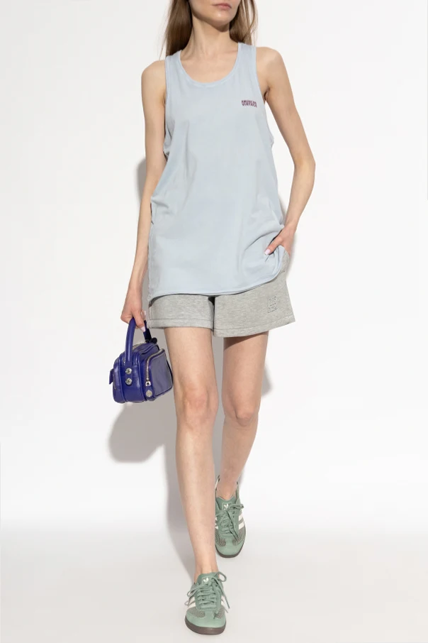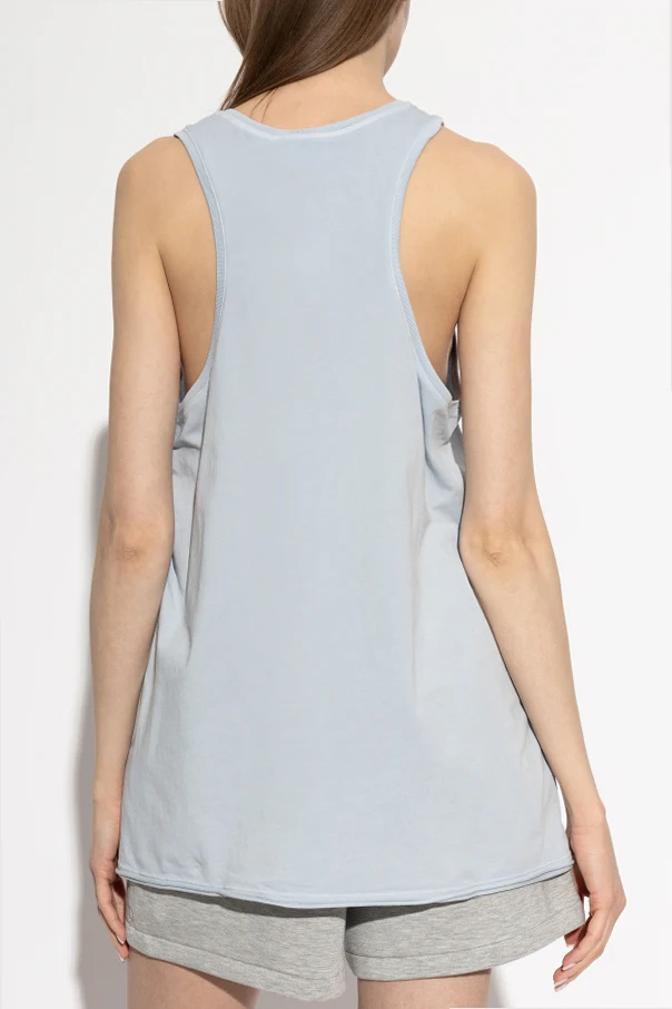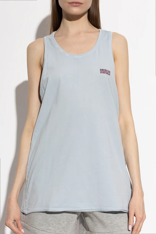 Exude understated sophistication with this light blue women's tank top , artfully crafted by American Vintage . The silhouette embodies relaxed elegance—a straight, slightly loose cut complemented by wide straps and a racerback design, providing both comfort and effortless style. The round neckline adds versatility, making it an impeccable choice for refined casual ensembles.