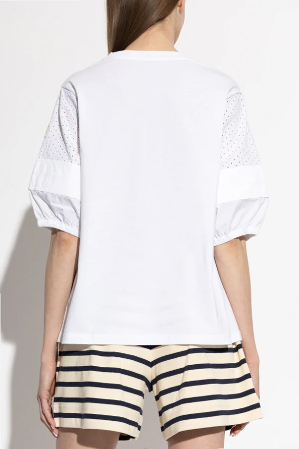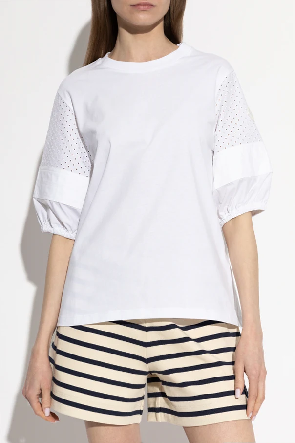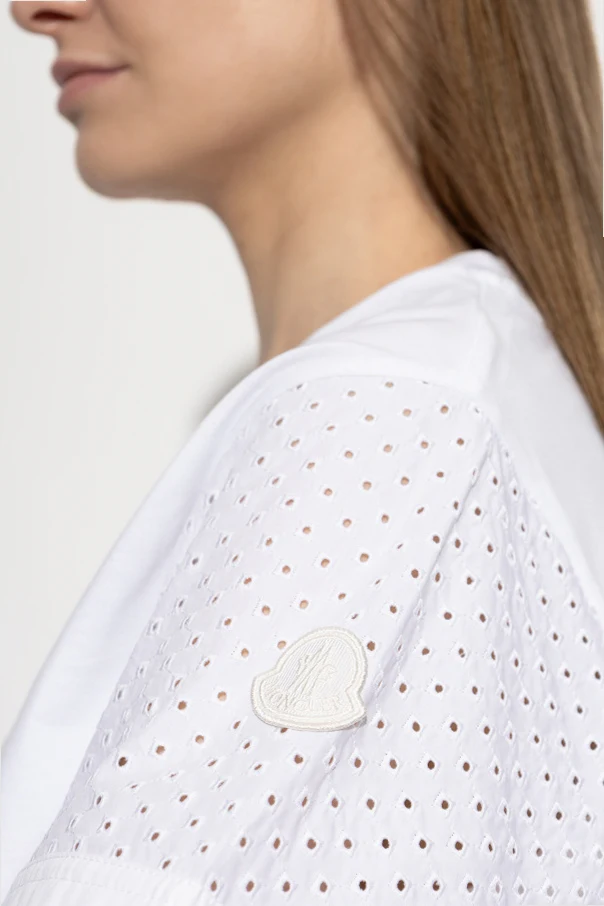 The true hallmark of this exquisite piece lies in its elbow-length voluminous sleeves , finished with delicate gathers at the hem and rendered in perforated, airy fabric for subtle texture and dimension. The sleeve is adorned with a subtle white designer emblem, a discreet nod to Moncler’s storied heritage.
