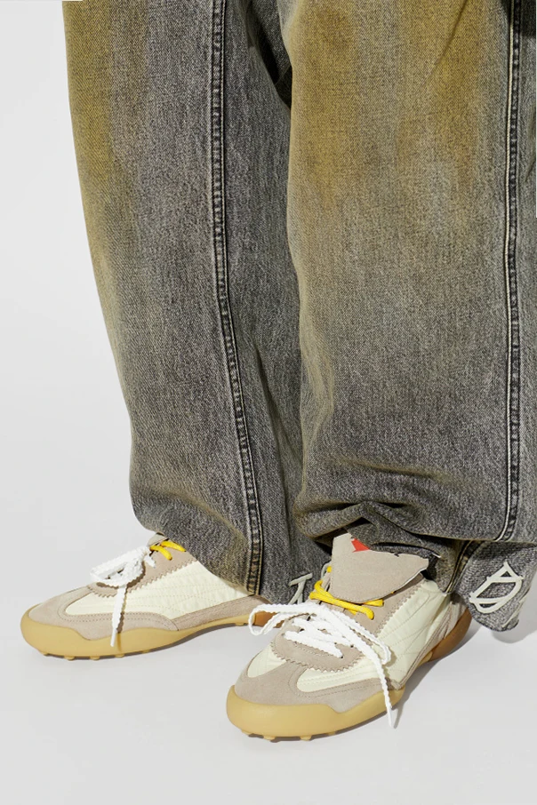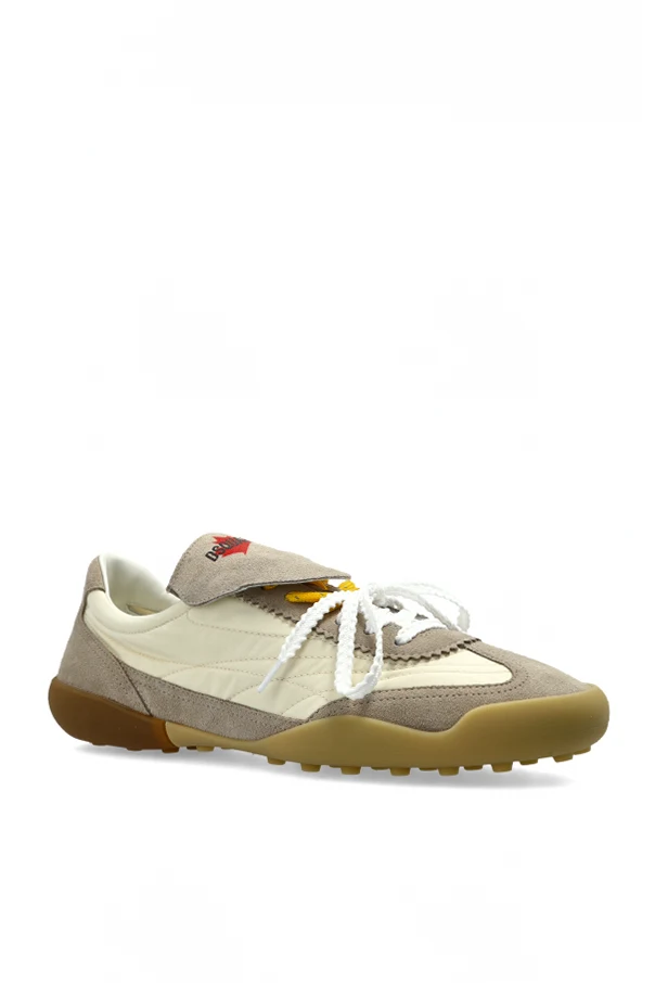 The ‘Soccer’ Low-Top Sneakers from Dsquared2 expertly blend classic athletic aesthetics with refined modernity. The subtly rounded toe and robust, contoured sole evoke enduring style, while the luxurious combination of smooth and suede leather in elegant beige tones adds a sophisticated dimension.