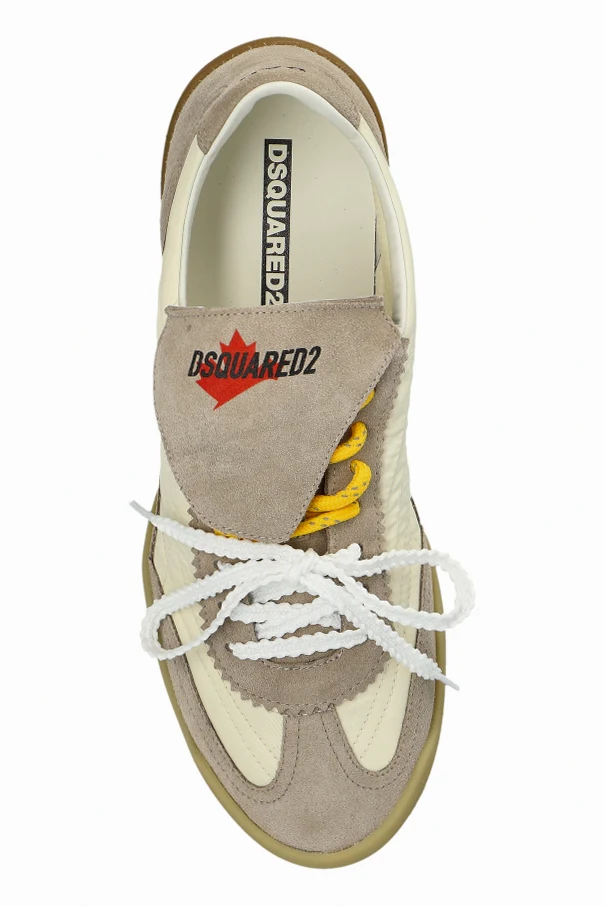 Distinctive features include a signature tongue patch adorned with a bold red maple leaf and the ‘DSQUARED2’ logo, complemented by pristine white laces and an eye-catching yellow underlay. Minimalist stitching and discreet embossing on the side panels further emphasize their unique character. The interior, lined with supple materials, ensures superior comfort, while the light brown, durable rubber outsole provides steadfast support.