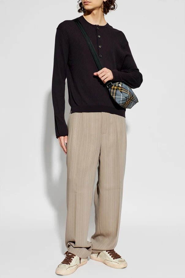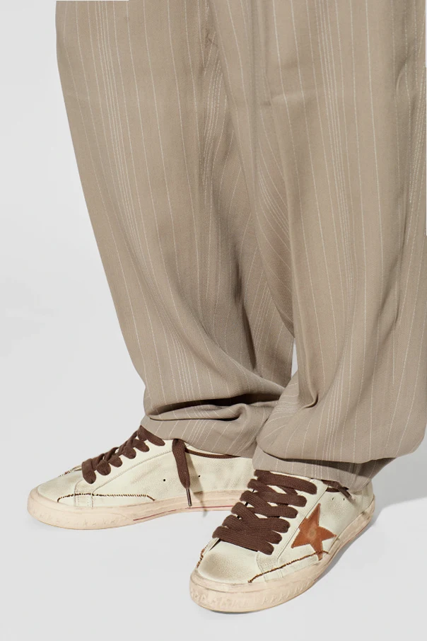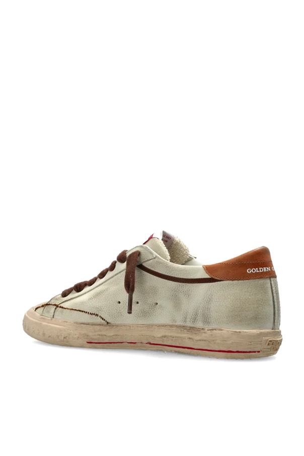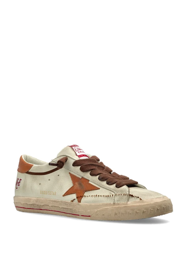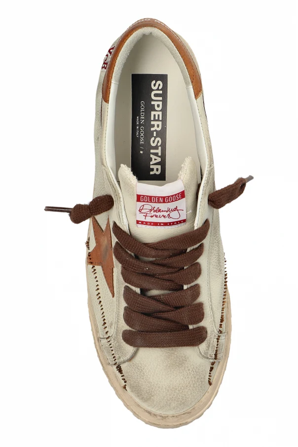 Elevate your footwear collection with the Super-Star With List Destroyed sneakers by Golden Goose. These sophisticated low-top sneakers showcase a timeless silhouette, featuring a gently rounded toe and exquisite craftsmanship. The upper is meticulously crafted from premium, textured natural leather in a refined cream hue, contrasted tastefully with warm brown leather accents on the heel and side details.