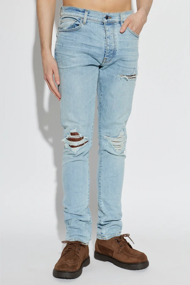 Introducing the Amiri Skinny Jeans , a sartorial statement of modern sophistication. Crafted from supple, stretch-infused denim in a refined light blue hue, these jeans are tailored with a close-fitting, skinny silhouette—elegantly contouring the body for an effortlessly sleek appearance. Subtle fading and artfully placed distressing at the knees and thighs evoke a tasteful vintage allure, exuding both edge and timeless appeal.