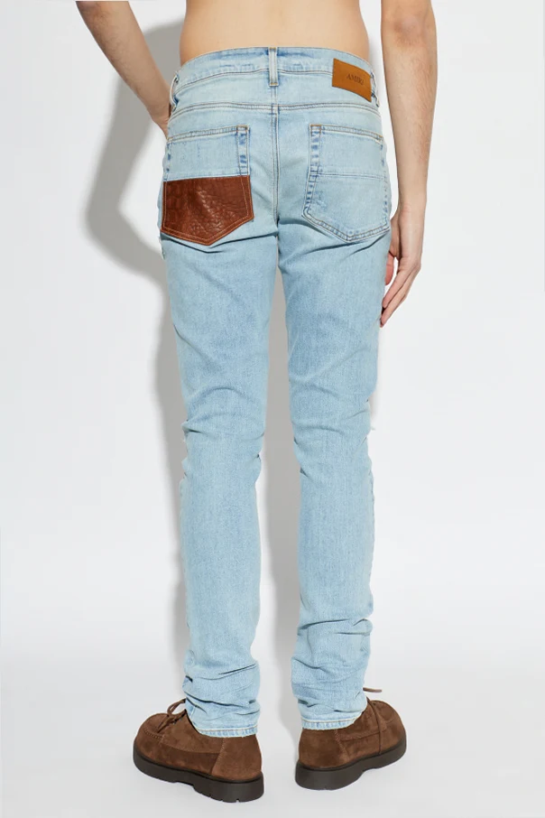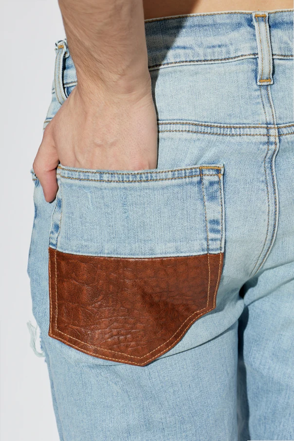 The signature detail—a contrasting brown leather panel on the right back pocket—imparts a distinctive designer touch, setting these jeans apart from the ordinary. Standard five-pocket construction, a leather logo patch, and functional belt loops add to their practical elegance. The combination of luxurious materials and meticulous finishes guarantees both comfort and enduring style.