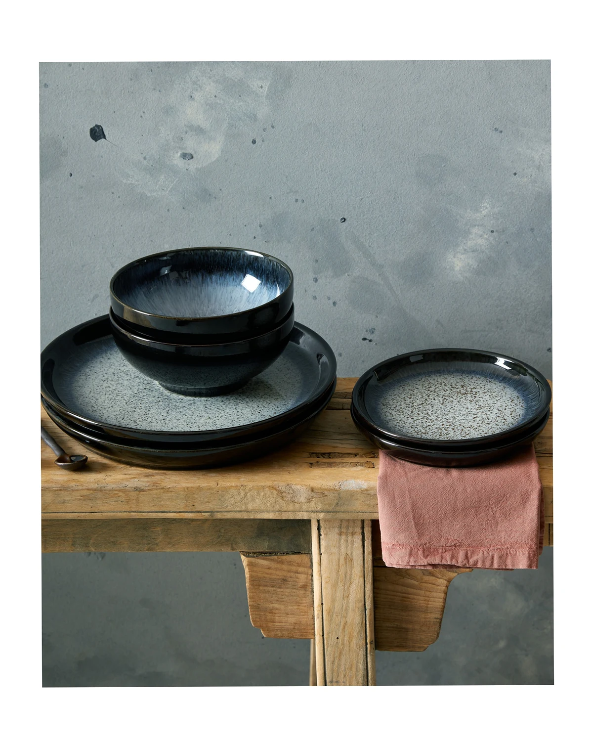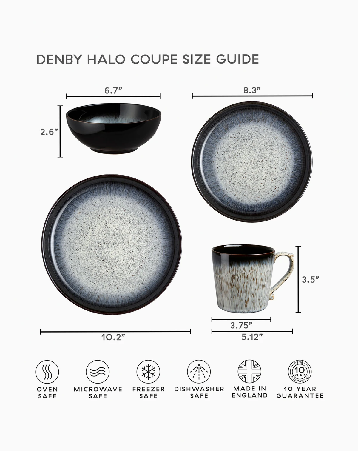 Produced at Denby Pottery in Derbyshire, Halo has been handcrafted to the highest standard. Featuring a durable, chip resistant glaze, this Halo set is the perfect addition for any family mealtime or get together. Handcrafted in England at Denby Pottery using locally sourced clay just behind our factory. Featuring a new shape for 2023, the Halo Coupe Cereal bowl included in this set has been designed by experts to be a contemporary bowl that creates a statement as a stand-alone piece but works beautifully as part of a set. Set includes: 4 Dinner Plate, 4 Medium Plate, 4 Cereal Bowl, and 4 Mug.