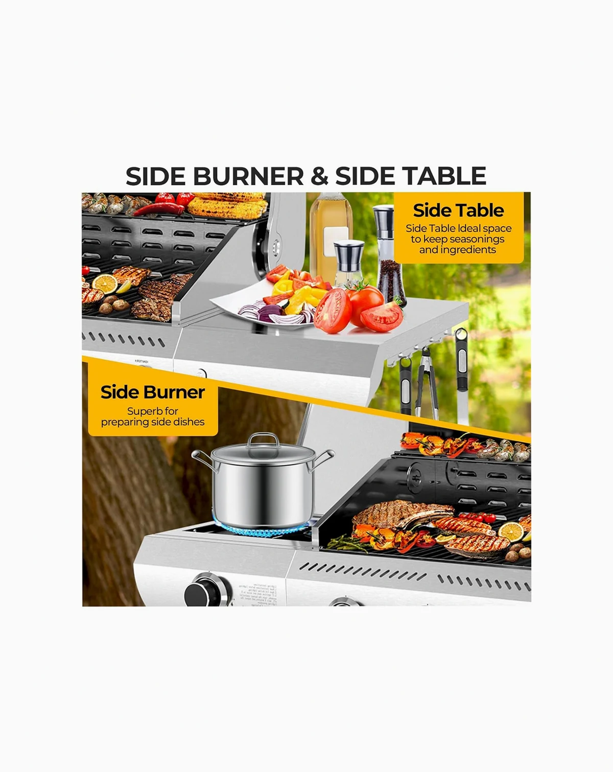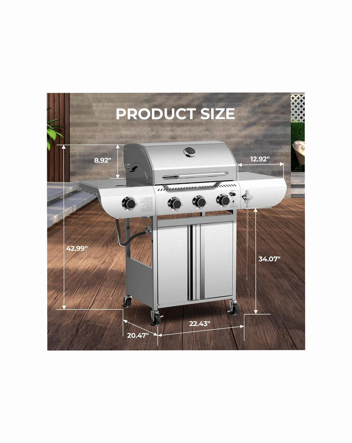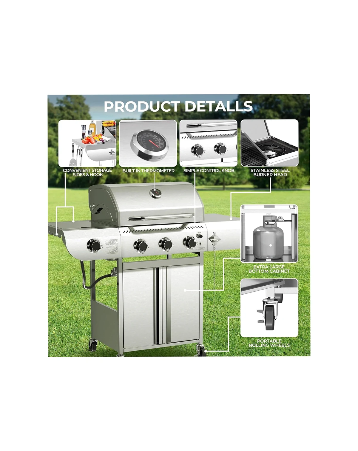 Stainless Steel and Cast Iron Construction :The upper grill is made of AISI 304 stainless steel and the body is made of durable 201 stainless steel. Excellent insulation and easy to clean.; Stable and Portable Design : Equipped with 4 heavy-duty casters (2 locking wheels) for easy mobility on patios or decks. The removable grease tray simplifies cleanup after BBQs.