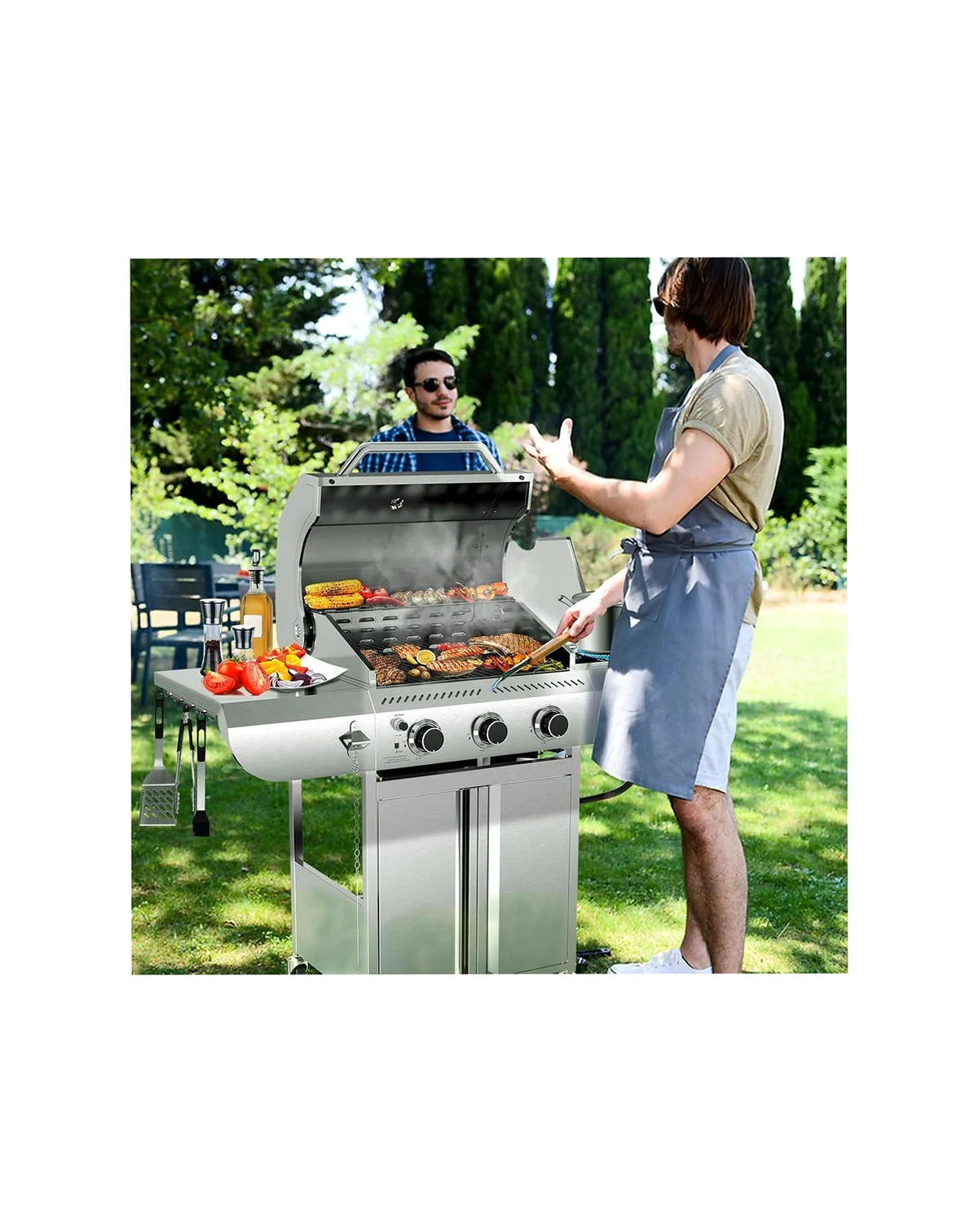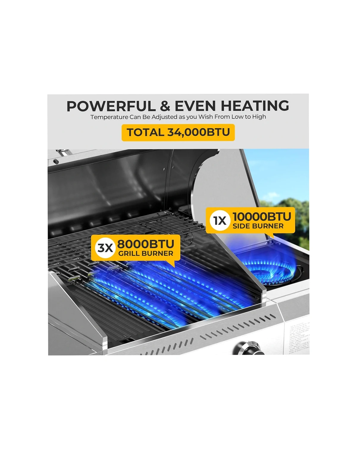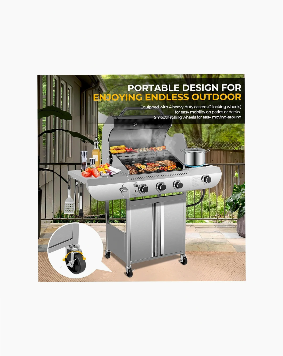 3-Burner BBQ Grill 34,000 BTU output with 489 sq. in. cooking space (stainless steel + cast iron). Features side burner, easy-roll wheels, and built-in storage. Perfect for backyard or camping.