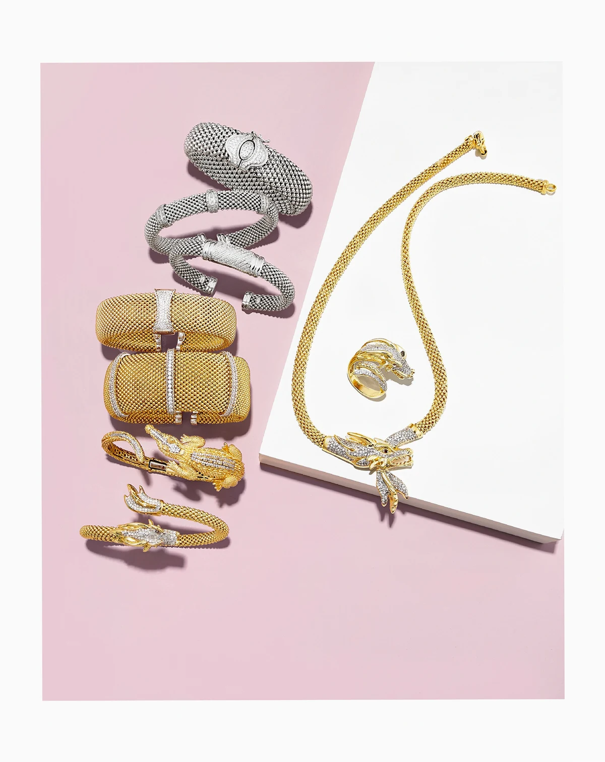 A diamond-embellished dragon with a bold red diamond eye adds a cosmic touch to this sophisticated and exotic statement necklace.