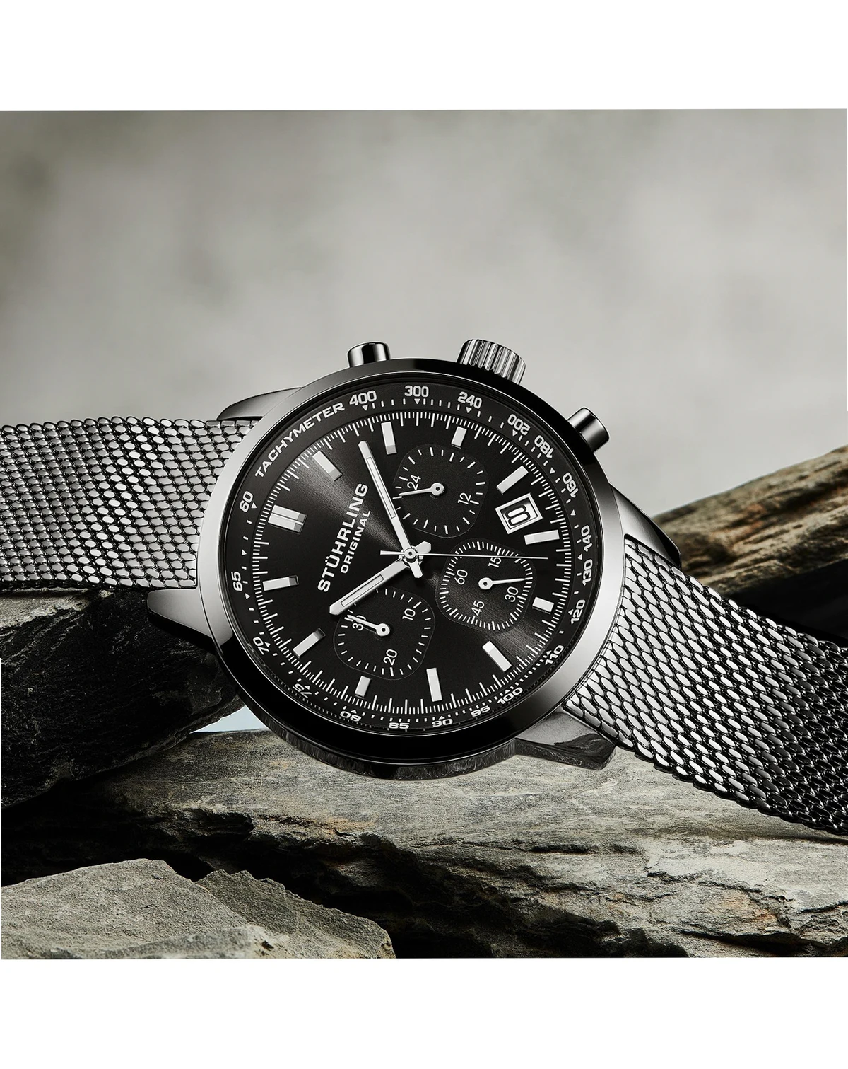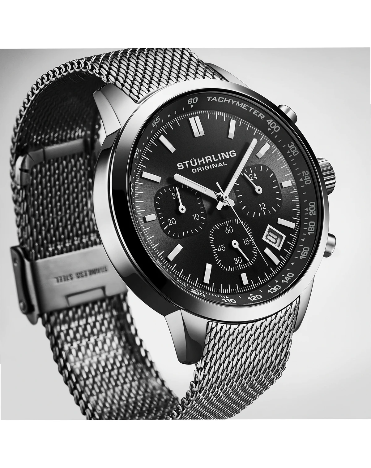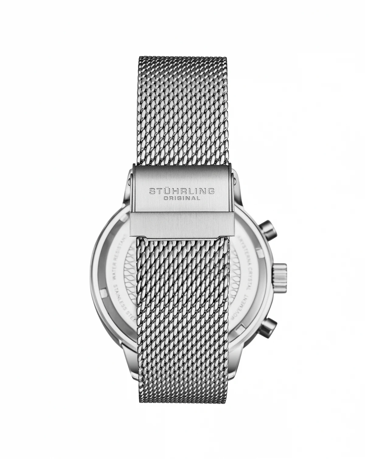 Inspired by classic racing chronographs, the Chronoport 4082 pairs tachymeter timing and precision subdials with a refined, modern stainless steel design. Built for the rhythm of city life, its bold 44mm stainless steel case is matched with a streamlined mesh bracelet and a sunray dial that delivers clarity at a glance. Clean baton markers, luminous hands, and a balanced tri-subdial layout reinforce its performance-driven character. Powered by a reliable quartz chronograph movement, the Chronoport 4082 tracks elapsed time with precision and ease. Three subdials display a 60-minute counter, running seconds, and a 24-hour indicator, while a date window adds everyday practicality. Finished with a domed mineral crystal, signed clasp, and screw-down caseback, this is a confident everyday chronograph for men who value control, precision, and modern style.