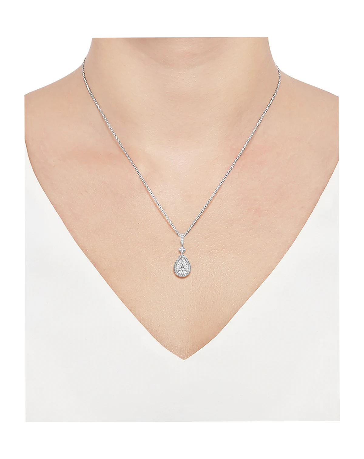 Level up the glamour with this beautiful teardrop cluster pendant necklace set with round and baguette diamonds.