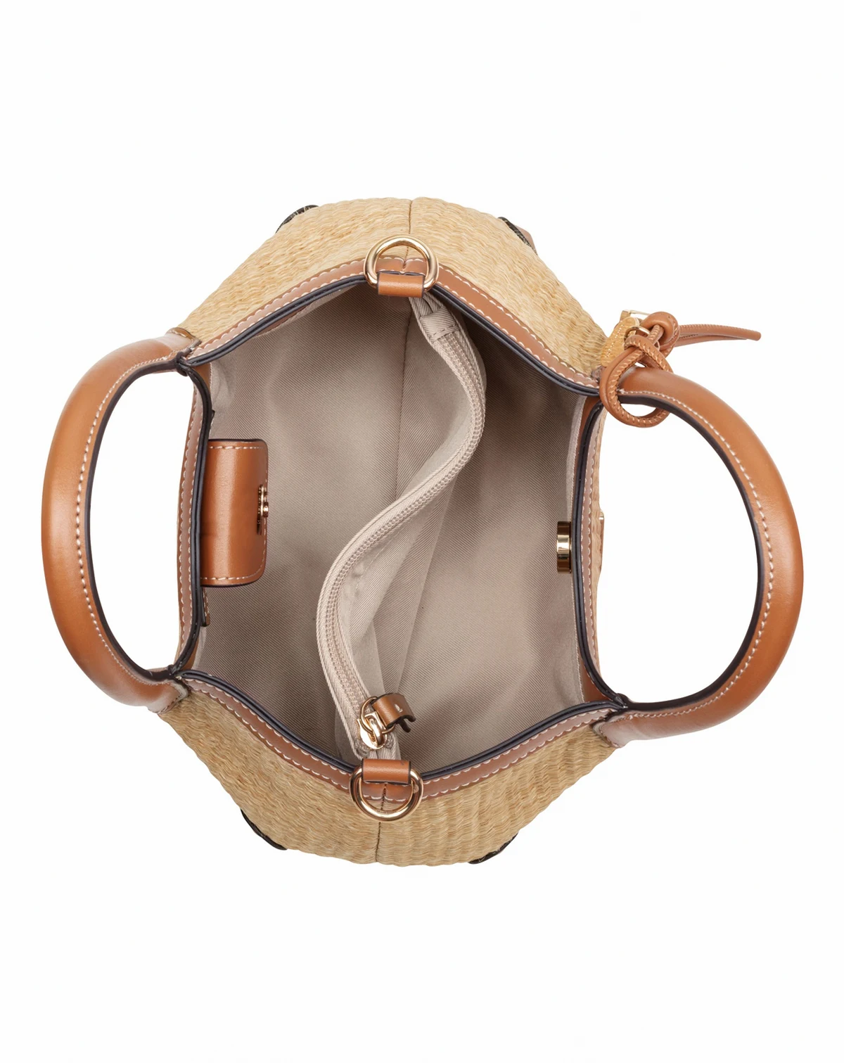 Nine West designer Sullivan small satchel that converts to shoulder or crossbody bag with removable adjustable strap. Designed in beautiful straw raffia material which elevates your spring and summer with brandy trim. Hardware and elevated branding with internal organization and full zipper closure
