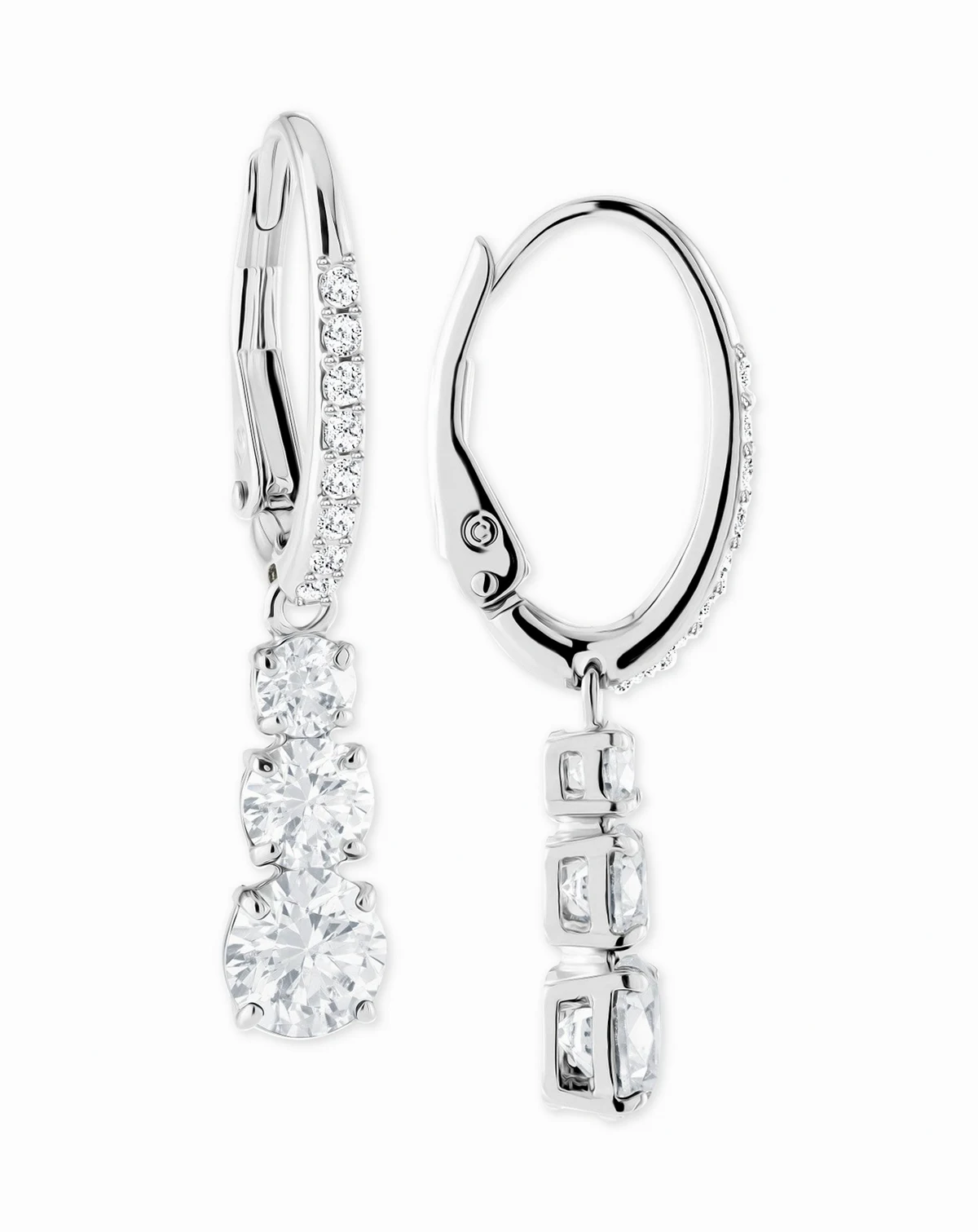 Two clear crystals are joined by another in vibrant color and embellished with pavé and rhodium plating in this gorgeous earring design from Swarovski.