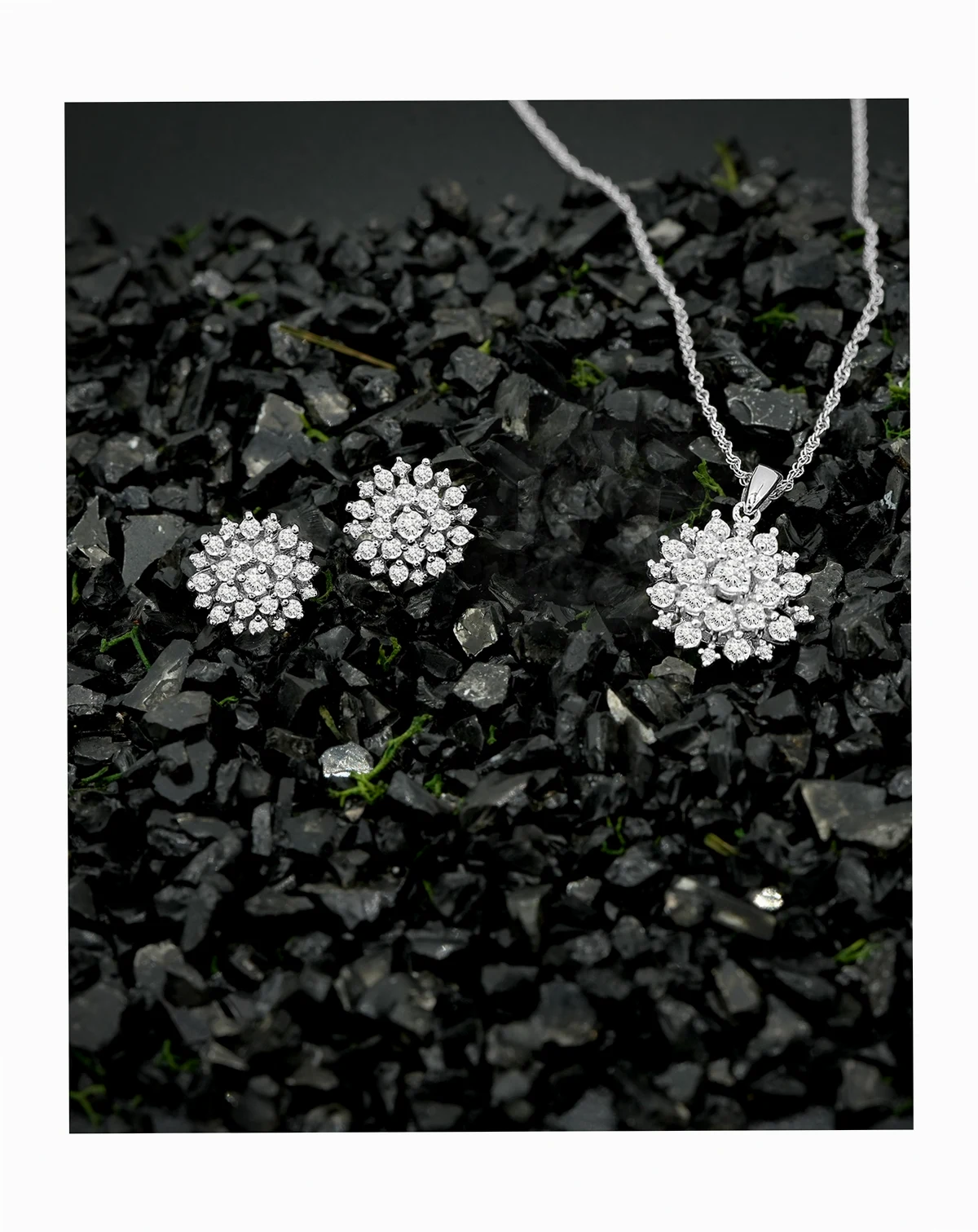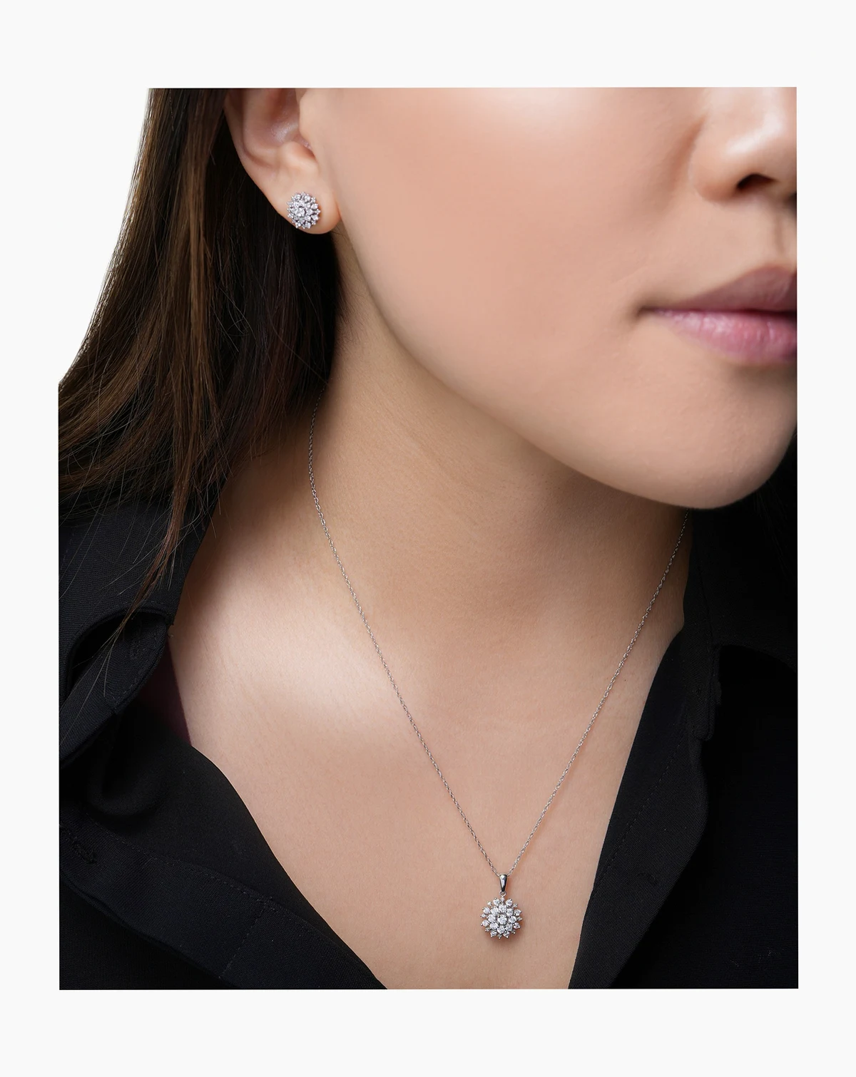 Exquisite sparkle radiates from this beautiful two piece jewelry set, designed with diamond clusters in an extraordinary pendant necklace and matching stud earrings, from Wrapped in Love™.