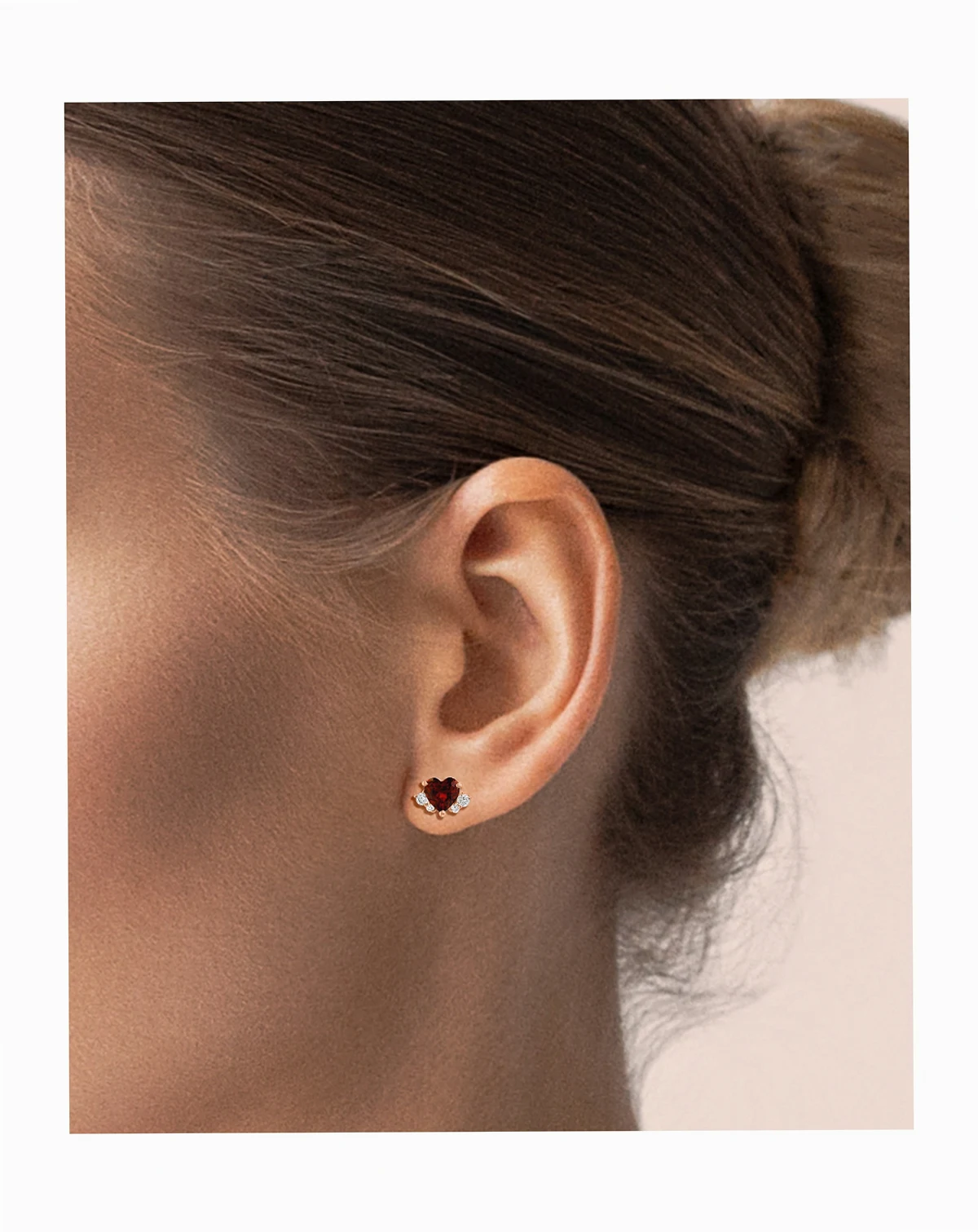 Perfectly offset by the dazzle of diamonds, heart-shaped garnet stud earrings show exquisite LALI Jewels style.