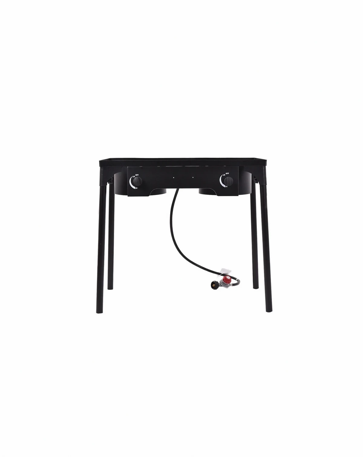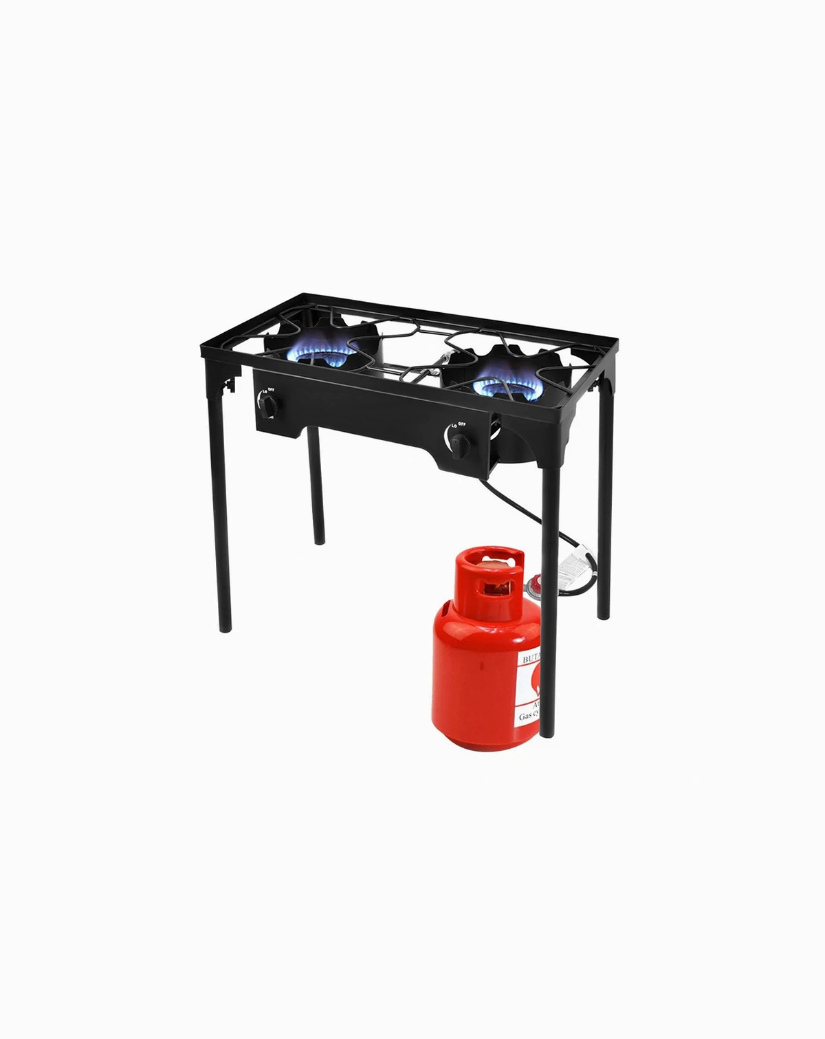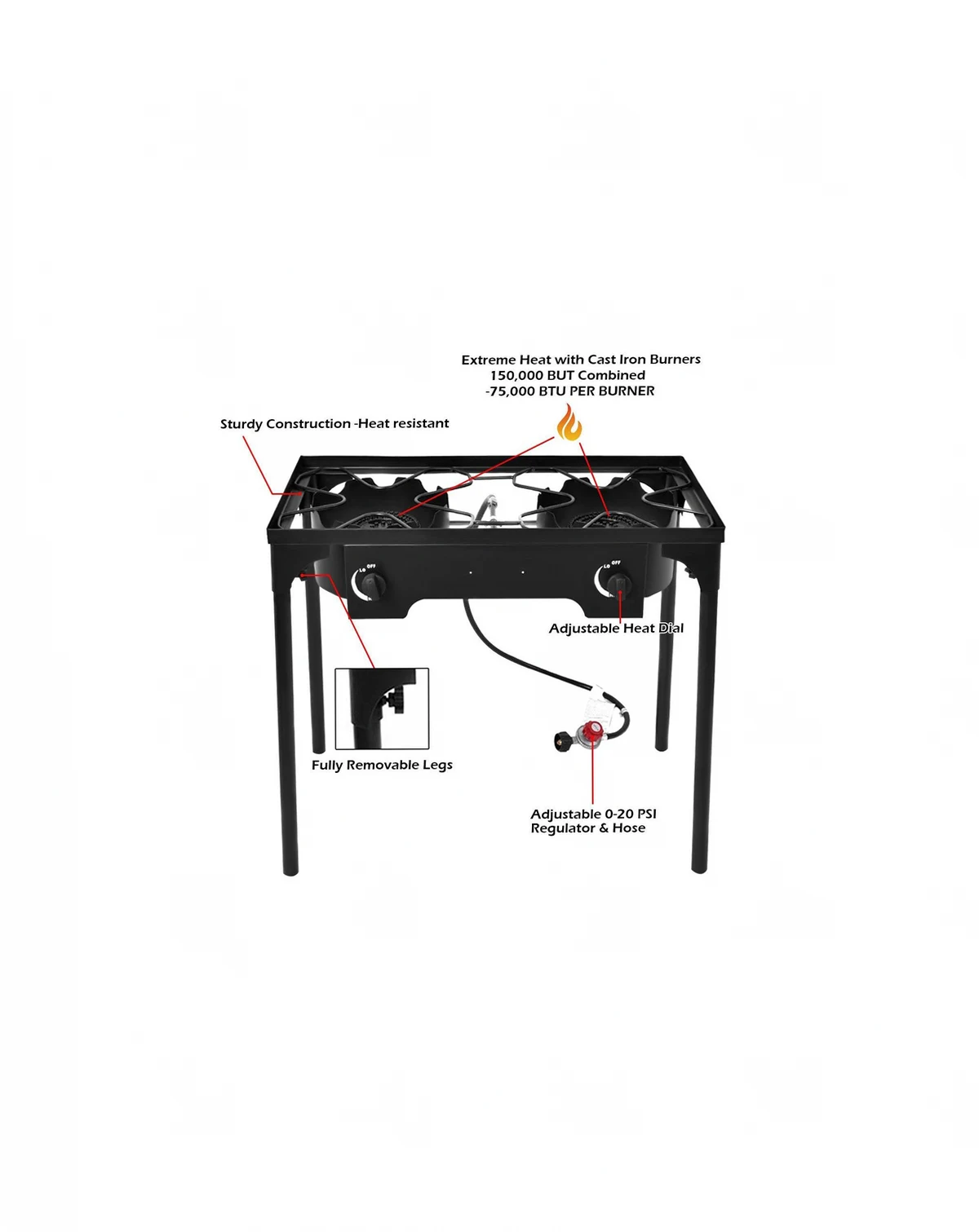Propane Double Burner: Made of durable cast iron, this high-power stove is perfect for brewing, camping, tailgating, and outdoor cooking adventures.