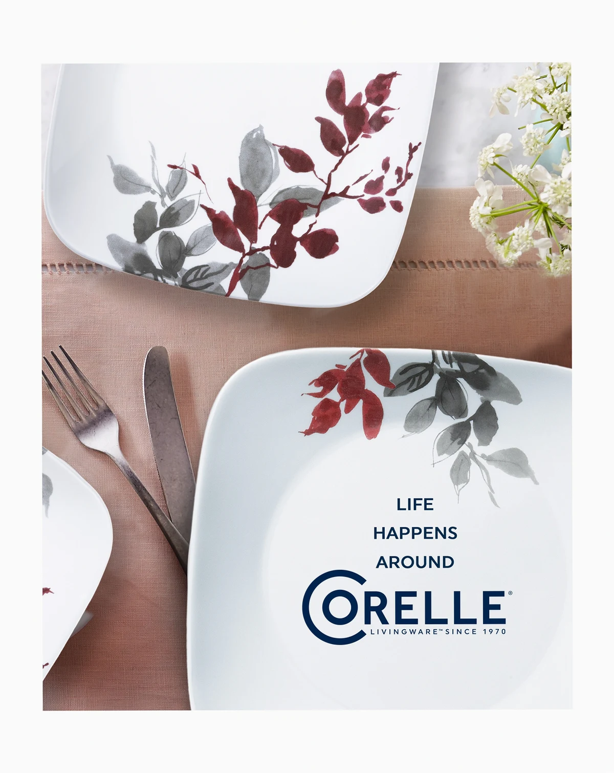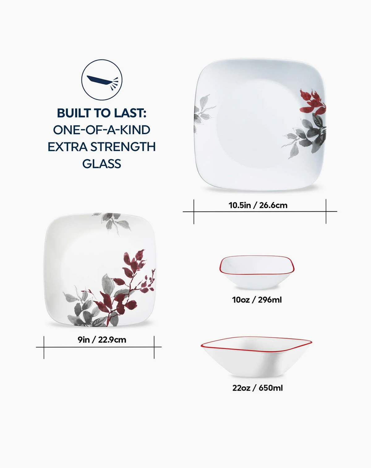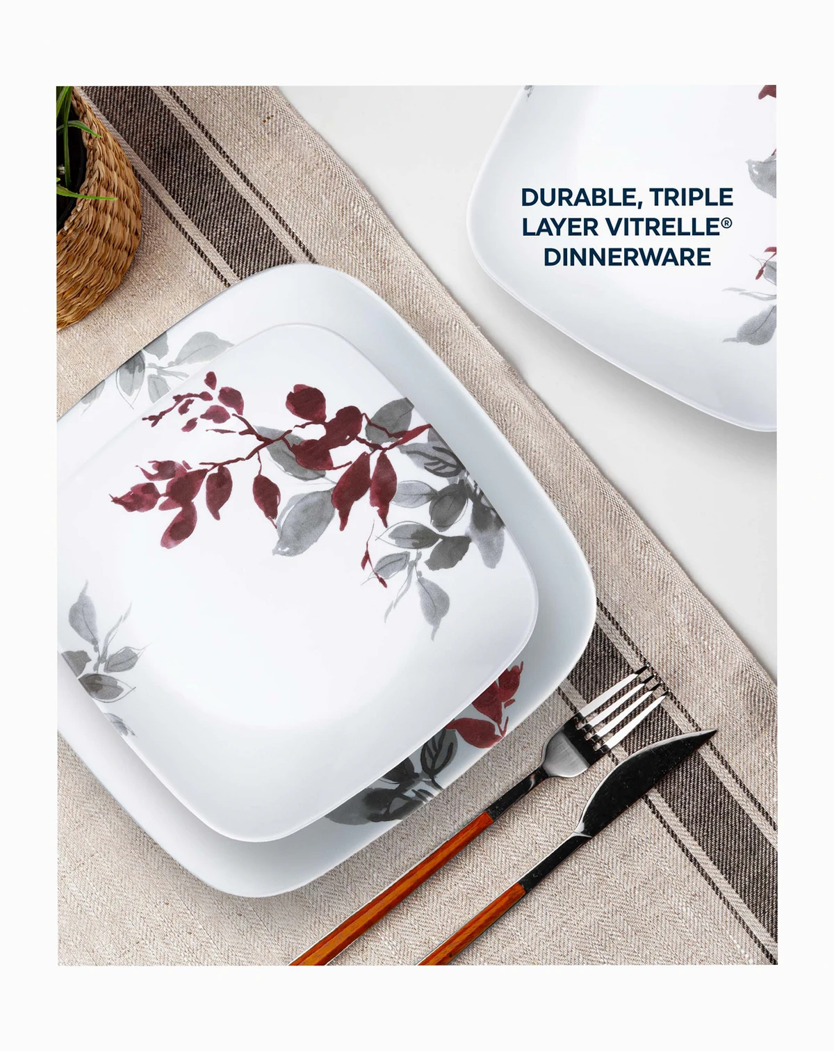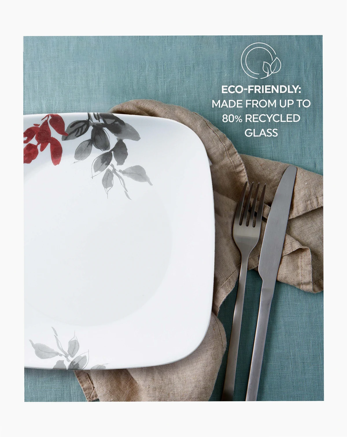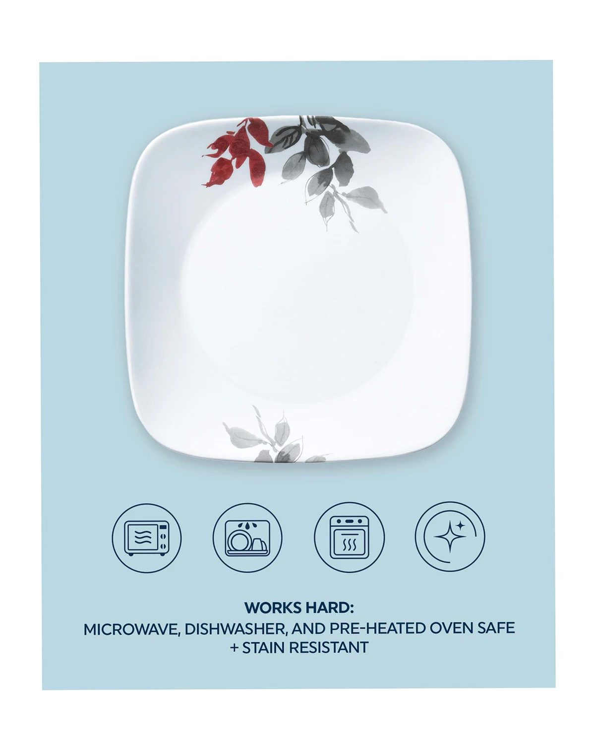 This square dinnerware set brings the balanced energy of nature to your table. Watercolor leaves in soothing brushstrokes of gray and burnished red pair perfectly with clean modern lines.