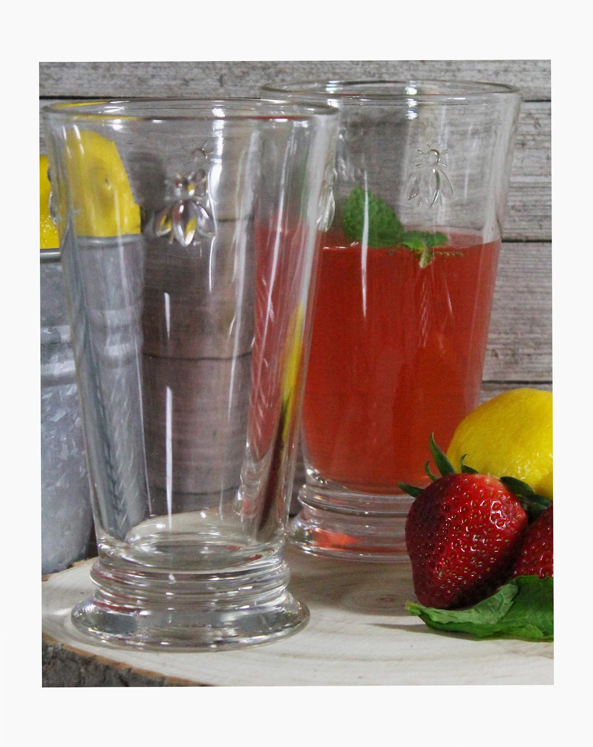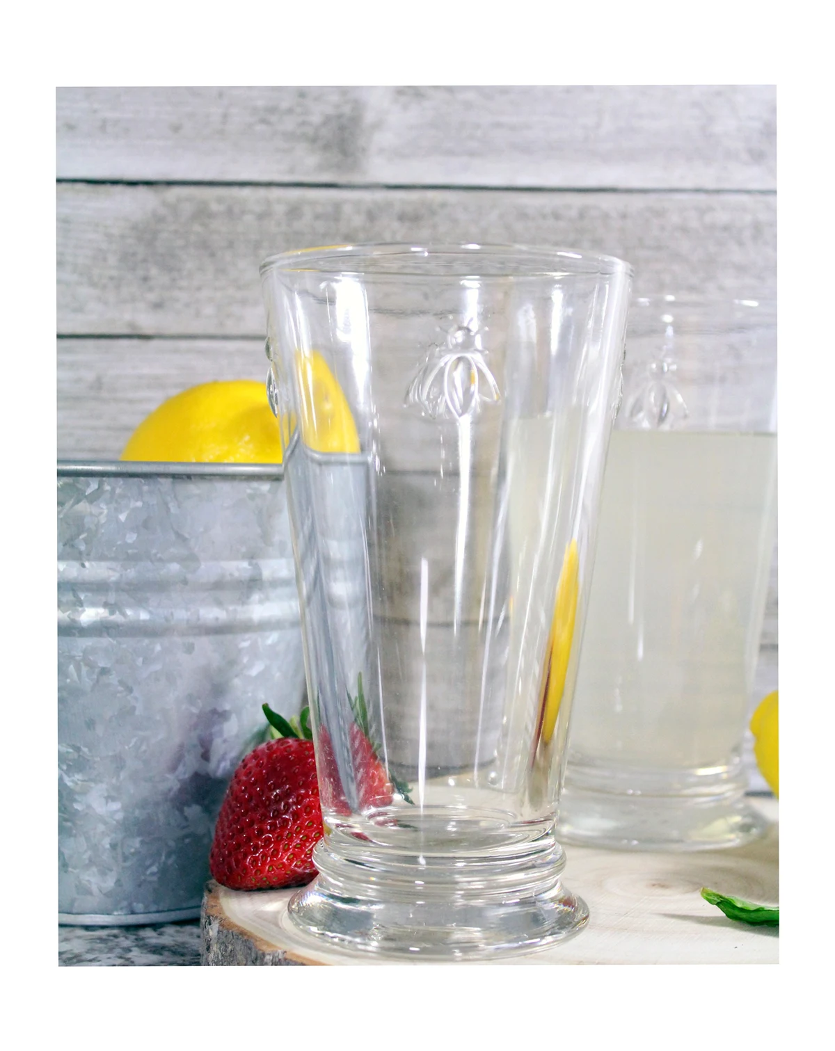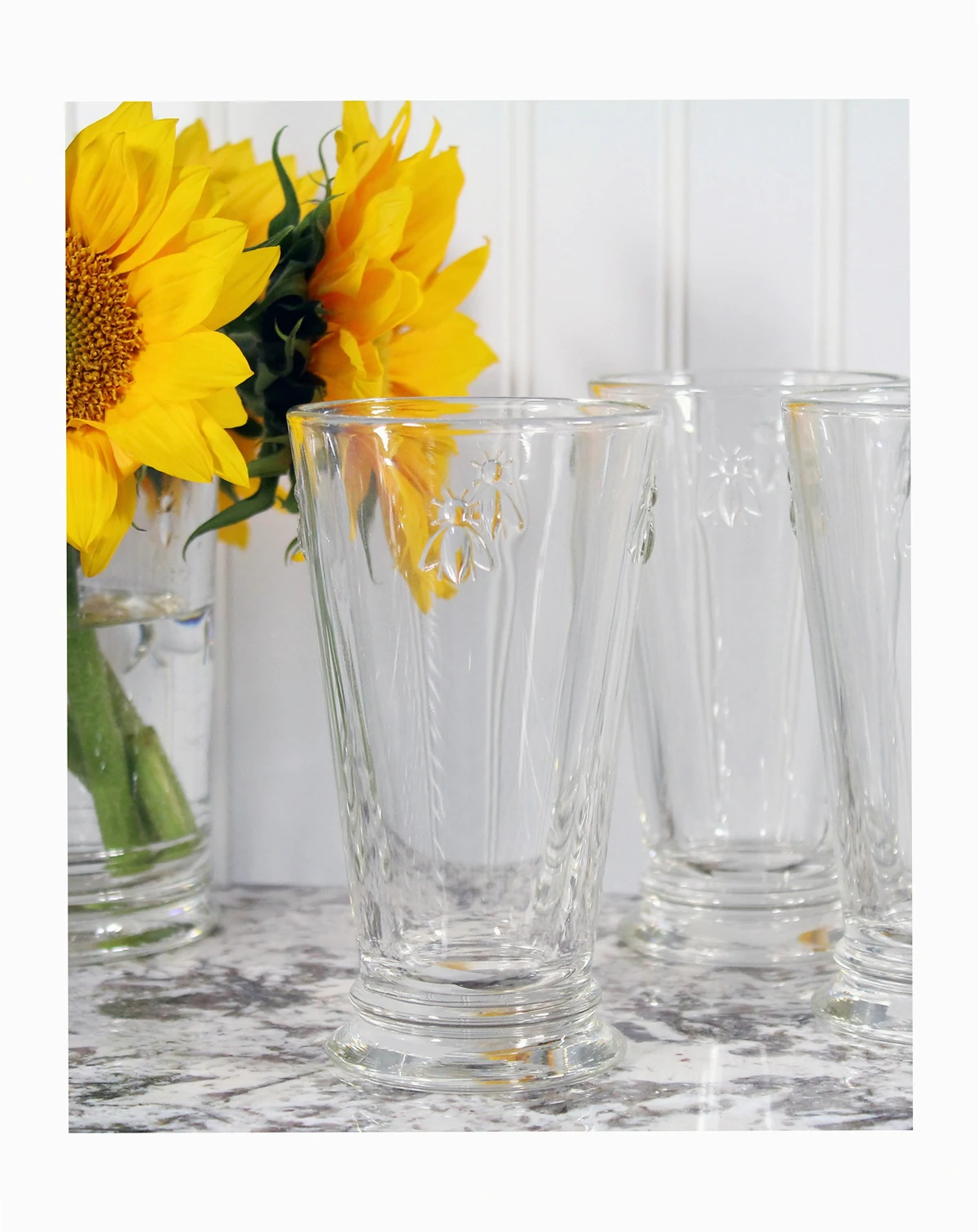 A Napoleon bee motif adds a vintage accent to everyday dining with these highball glasses from French Home's La Rochere Collection.