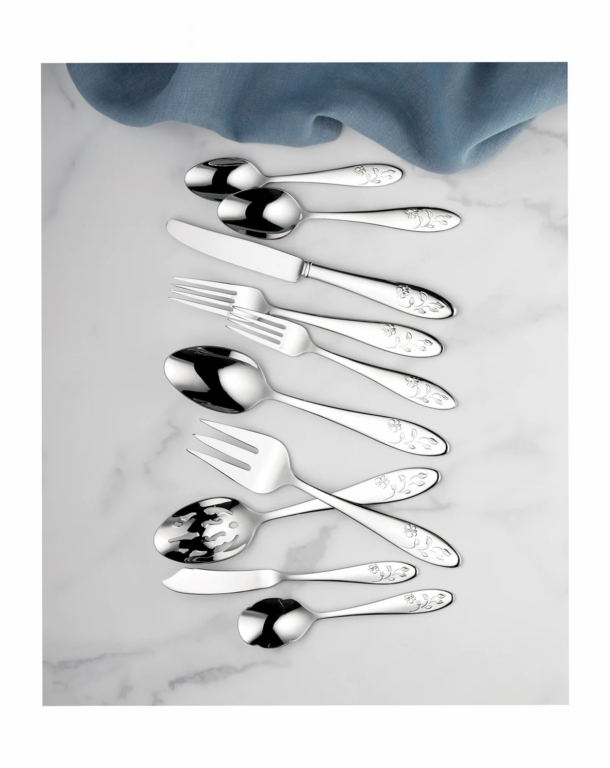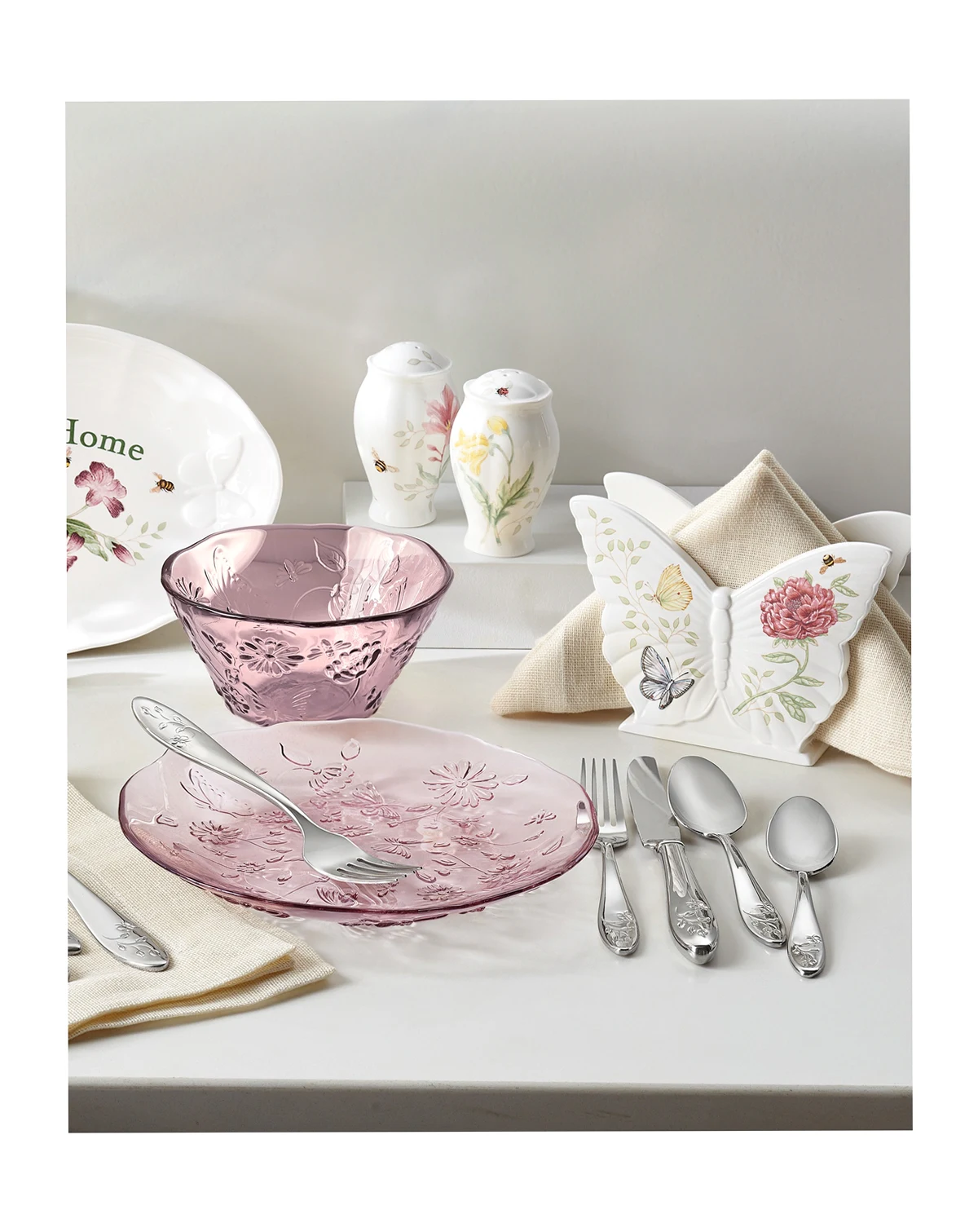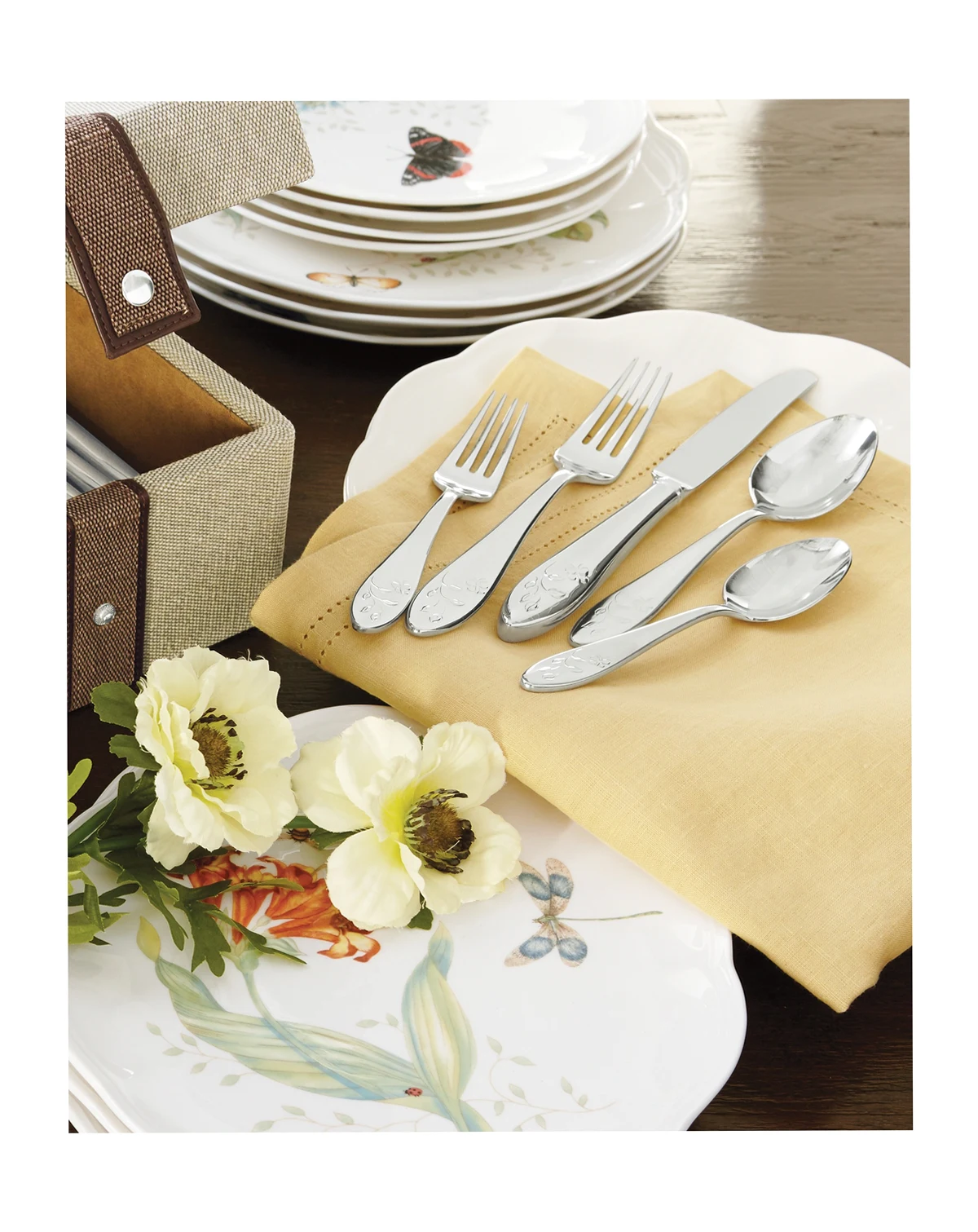 This casual and pristine Butterfly Meadow 65-piece flatware set is crafted of durable 18/10 stainless steel and features the butterfly and flower motif that is distinctive of the Butterfly Meadow collection. This set is dishwasher safe and includes a service for twelve people: twelve forks, salad forks, knives, spoons and teaspoons, in addition to one serving spoon, pierced serving spoon, sugar spoon, butter knife and serving fork.