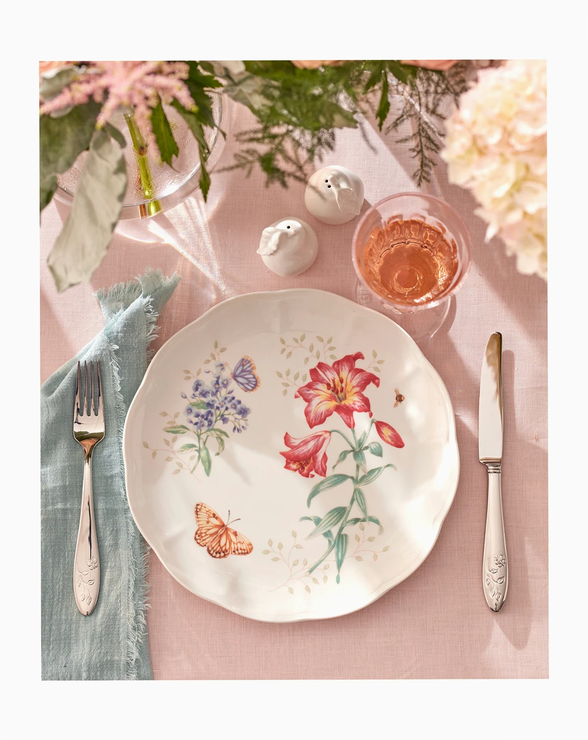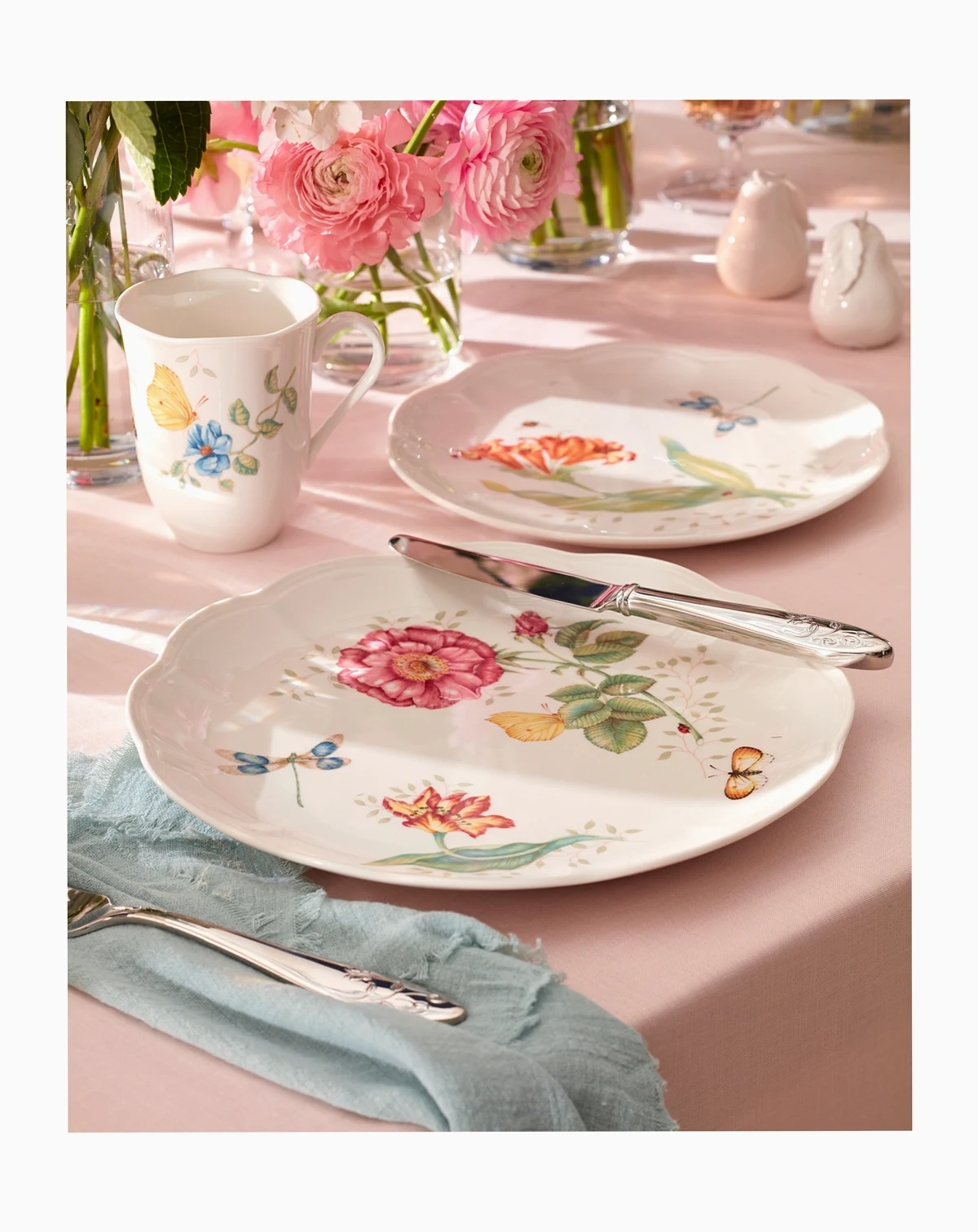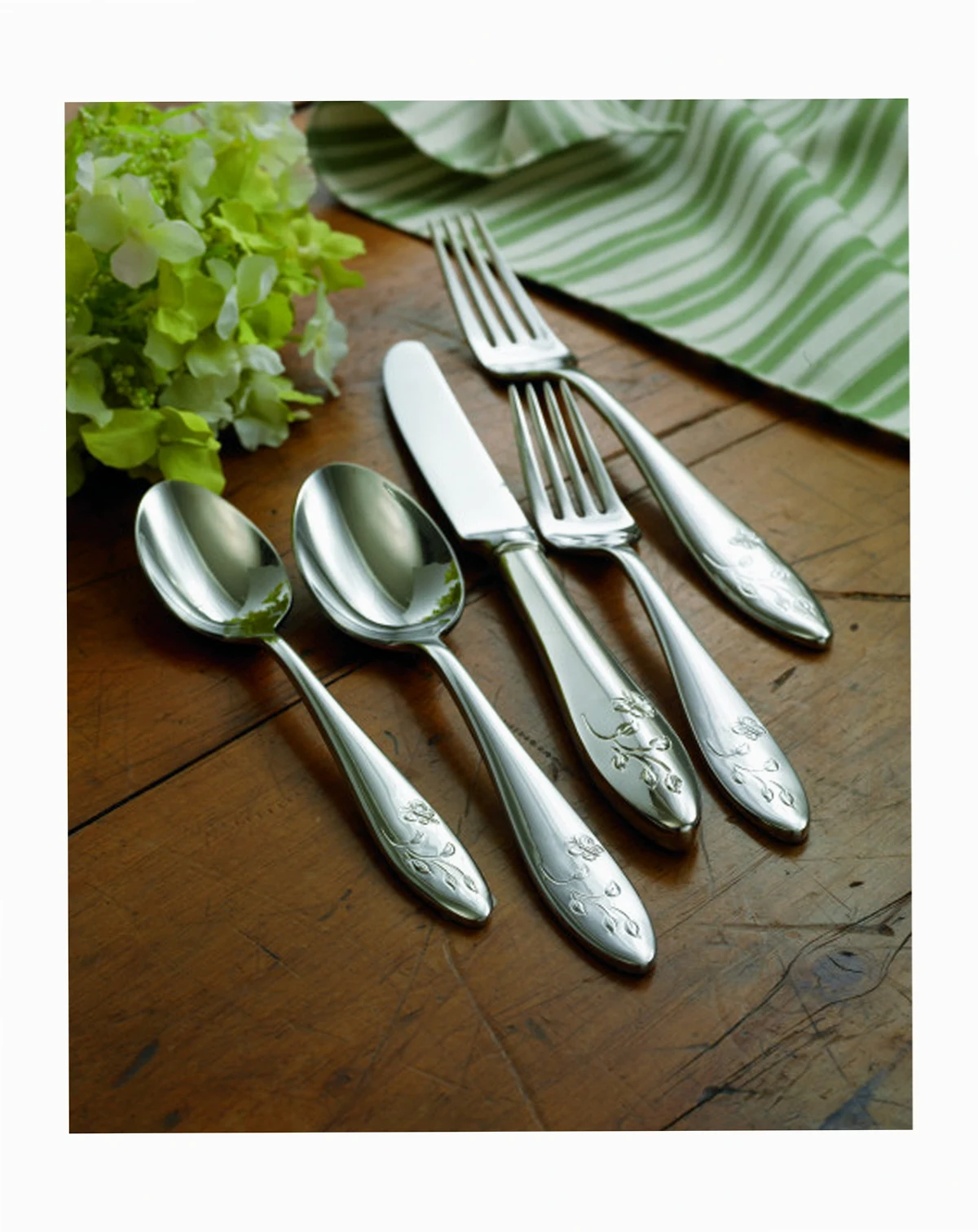 This casual and pristine Butterfly Meadow 65-piece flatware set is crafted of durable 18/10 stainless steel and features the butterfly and flower motif that is distinctive of the Butterfly Meadow collection. This set is dishwasher safe and includes a service for twelve people: twelve forks, salad forks, knives, spoons and teaspoons, in addition to one serving spoon, pierced serving spoon, sugar spoon, butter knife and serving fork.