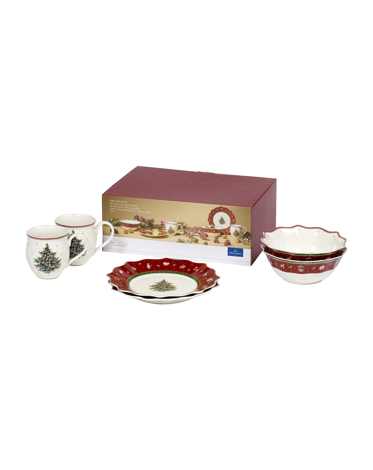 The Toy's Delight 6 piece breakfast set includes 2 each Salad plate, all purpose bowl and mug. All have a scalloped design. The collection's motif will evoke nostalgia for those young and old, featuring Christmas toys and trees, cookies, and other holiday treats in classic holiday hues, like green, red, and white. Dishwasher and microwave safe.