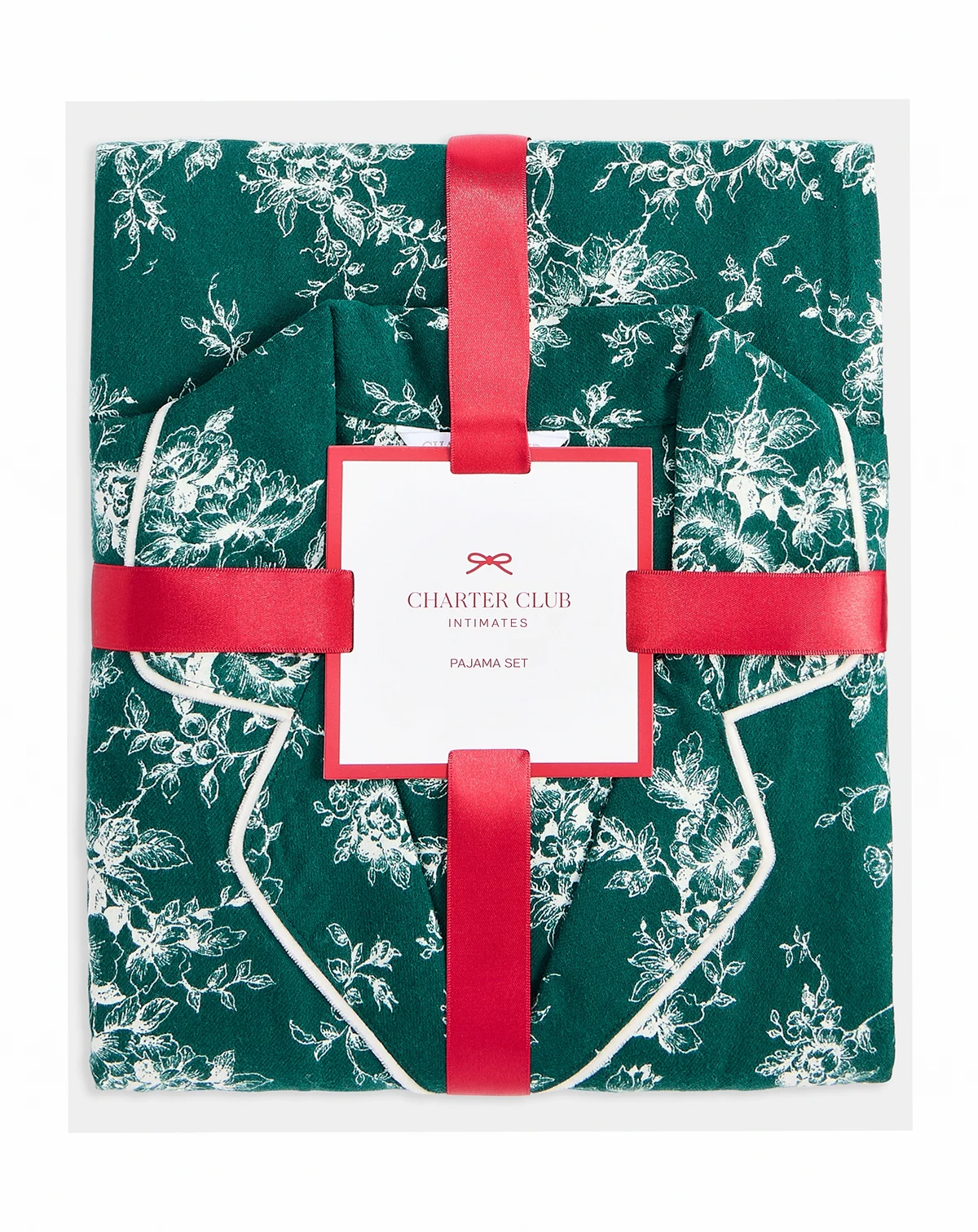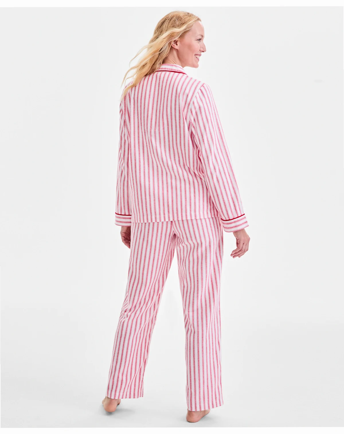 Top: approx. 30.5" long; notched collar; long sleeves; front button closures; patch pocket at chest; piped trim throughout; flannel fabric; Pants: approx. rise: 12"; approx. inseam: 30"; pulls on; elastic waistband