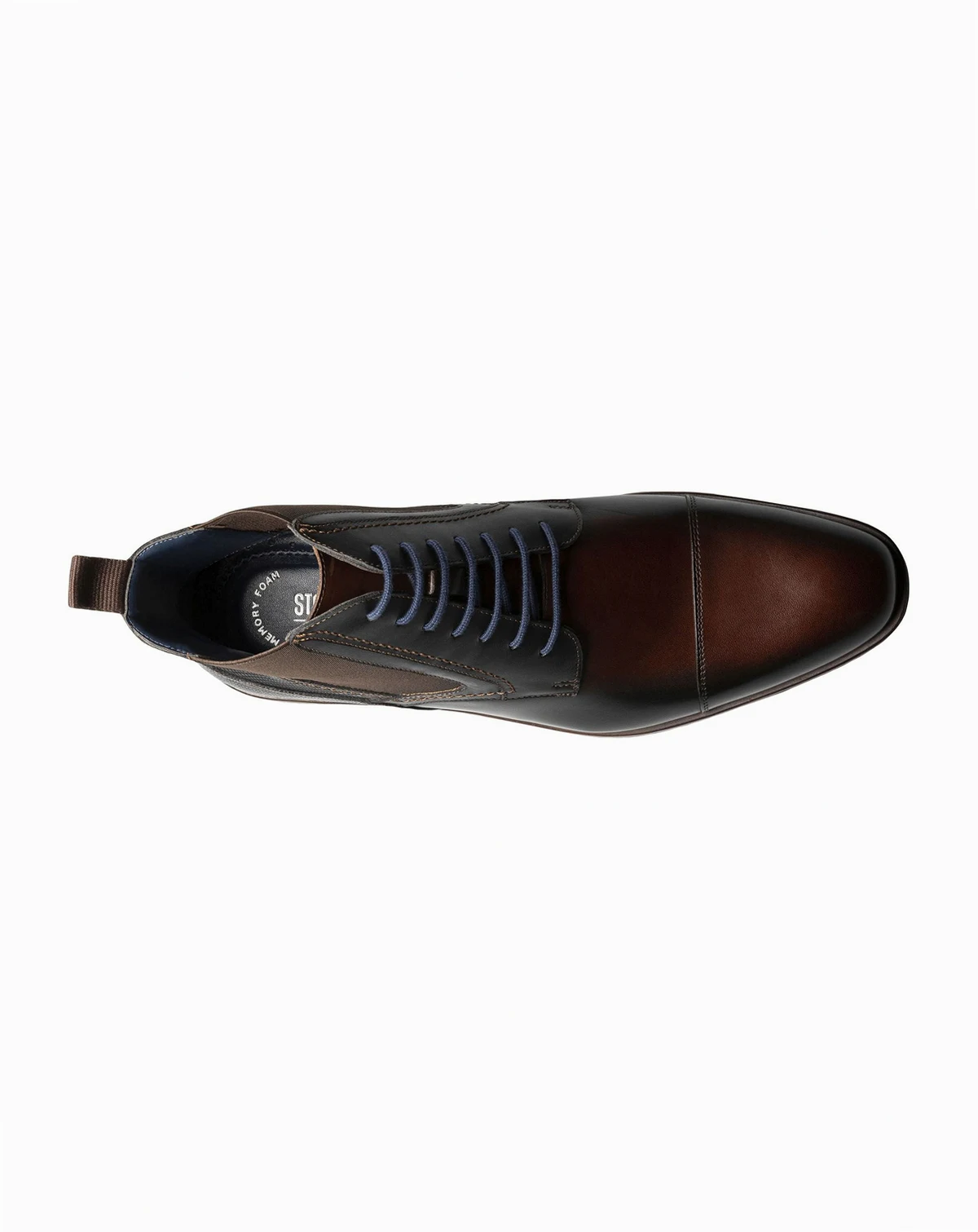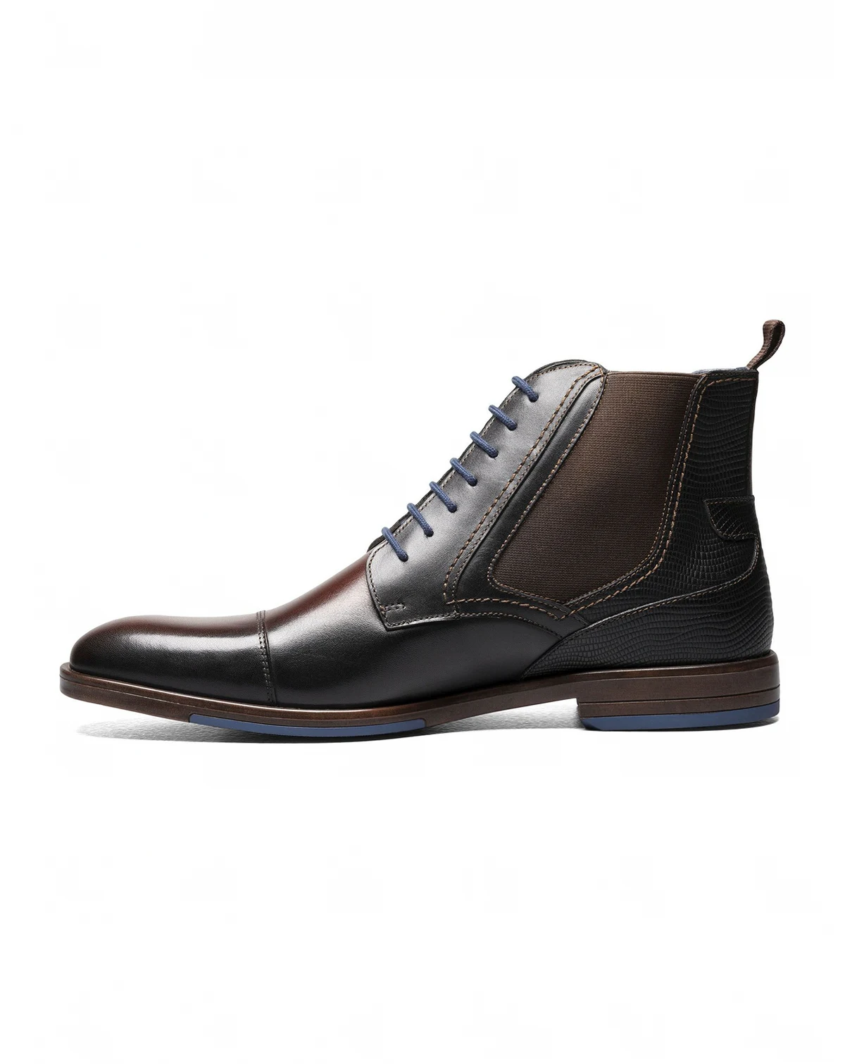 Mixed colors, materials, and textures come together to create the Stacy Adams Rafferty cap toe lace and gore boots. And we didn't stop there, this fashion-forward boots also combines the comfort of a double gore boots with the style of a lace up.