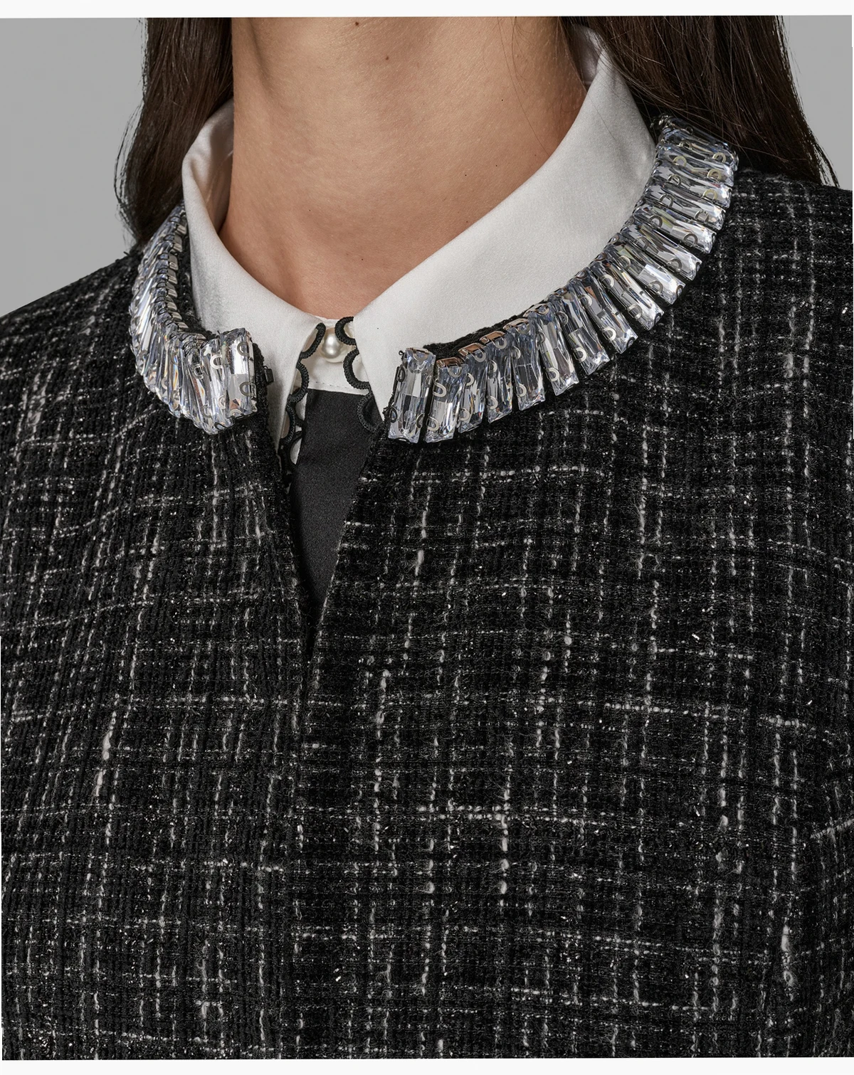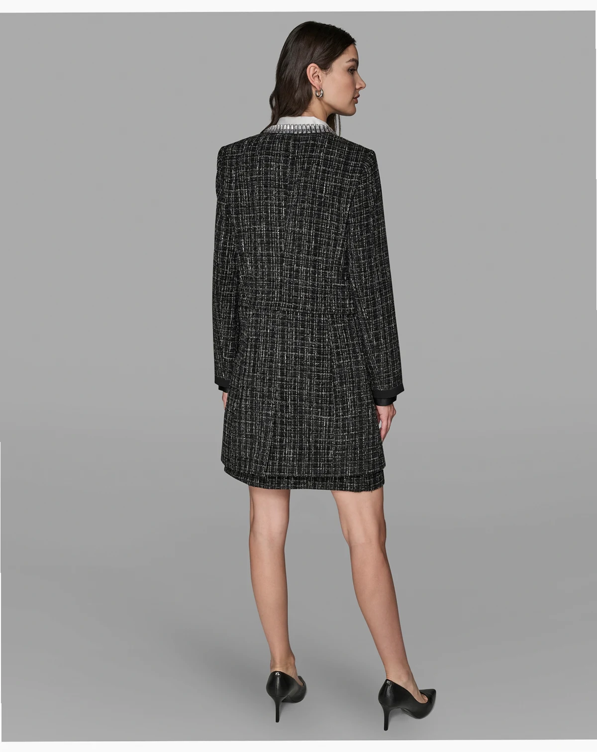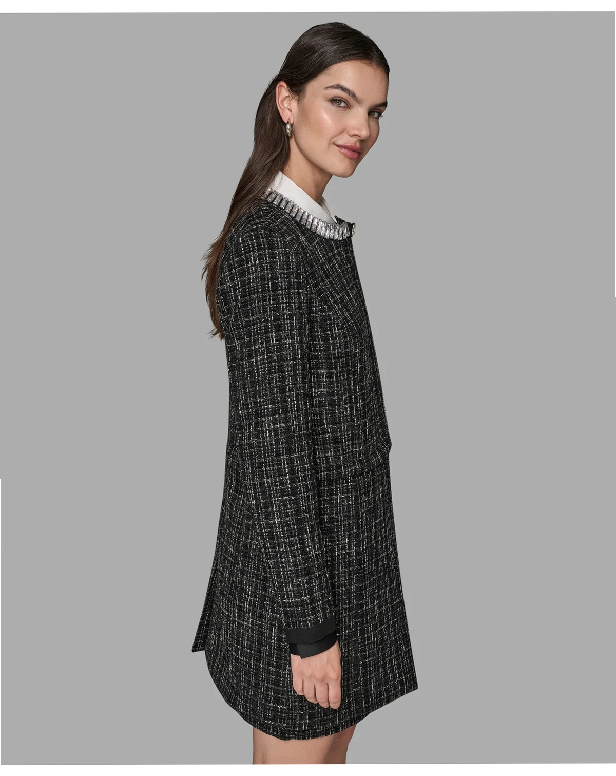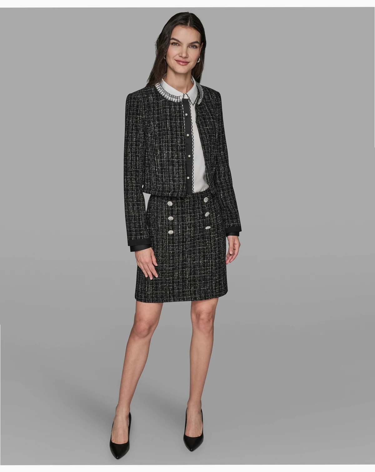 Add a touch of sparkle to your wardrobe with this KARL LAGERFELD PARIS jacket, featuring a round neckline adorned with rhinestones and long sleeves with subtle shoulder padding. Designed without pockets, it offers a sleek and polished silhouette.
