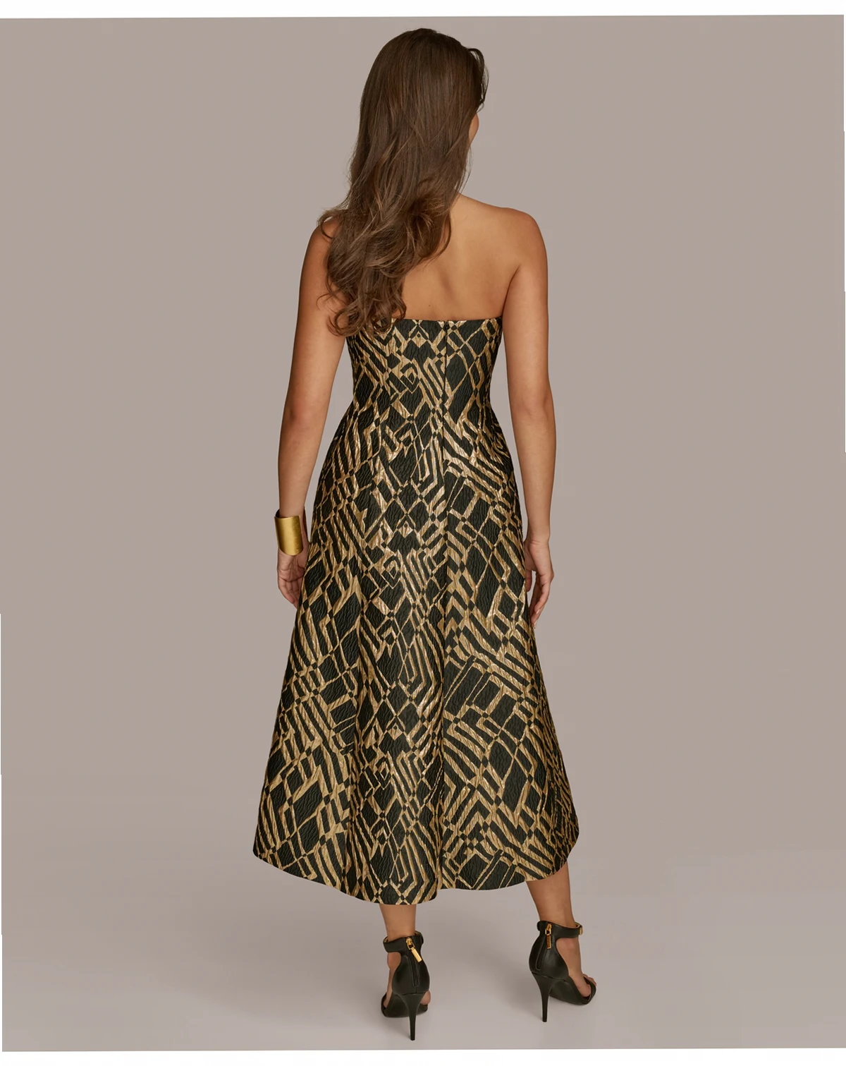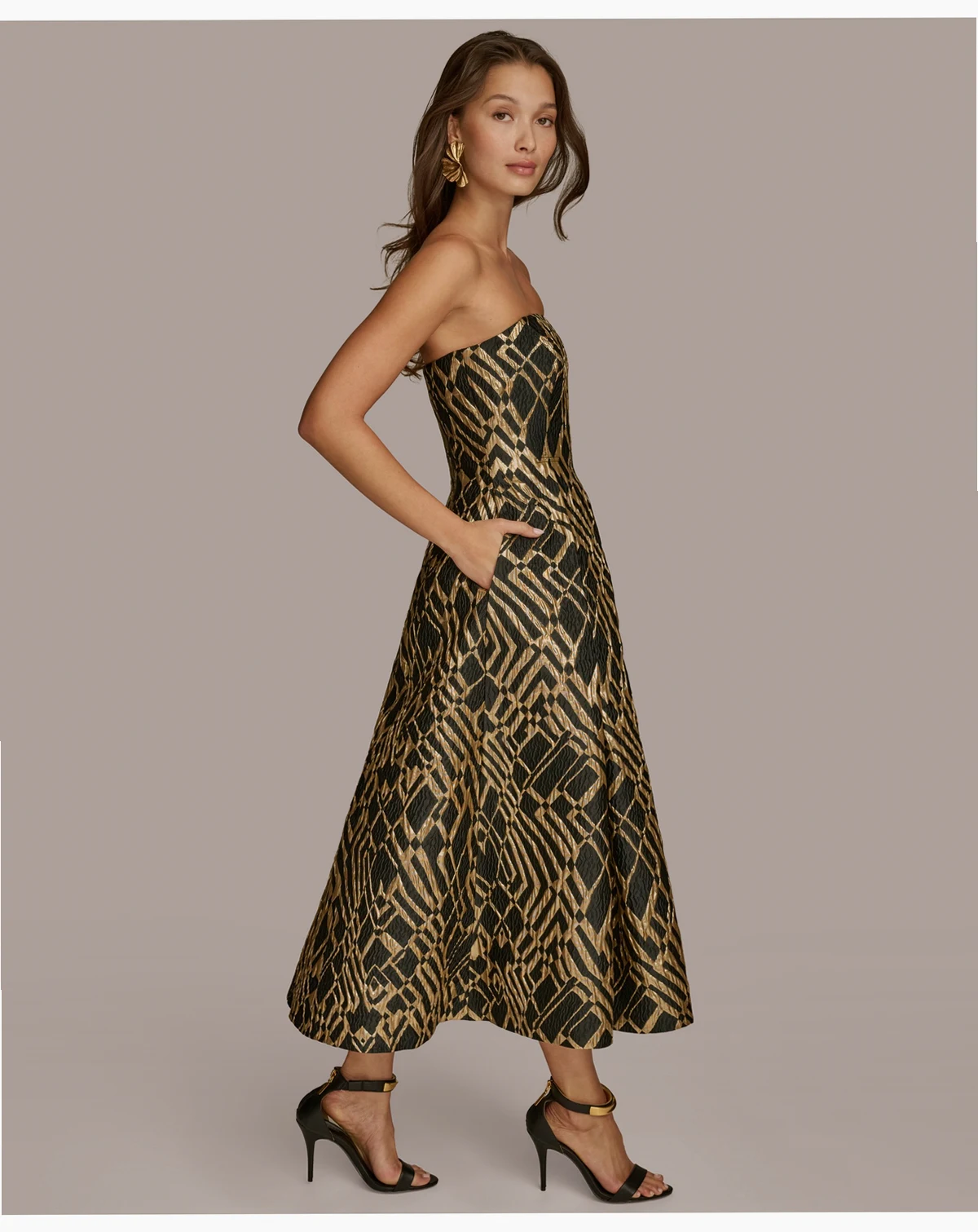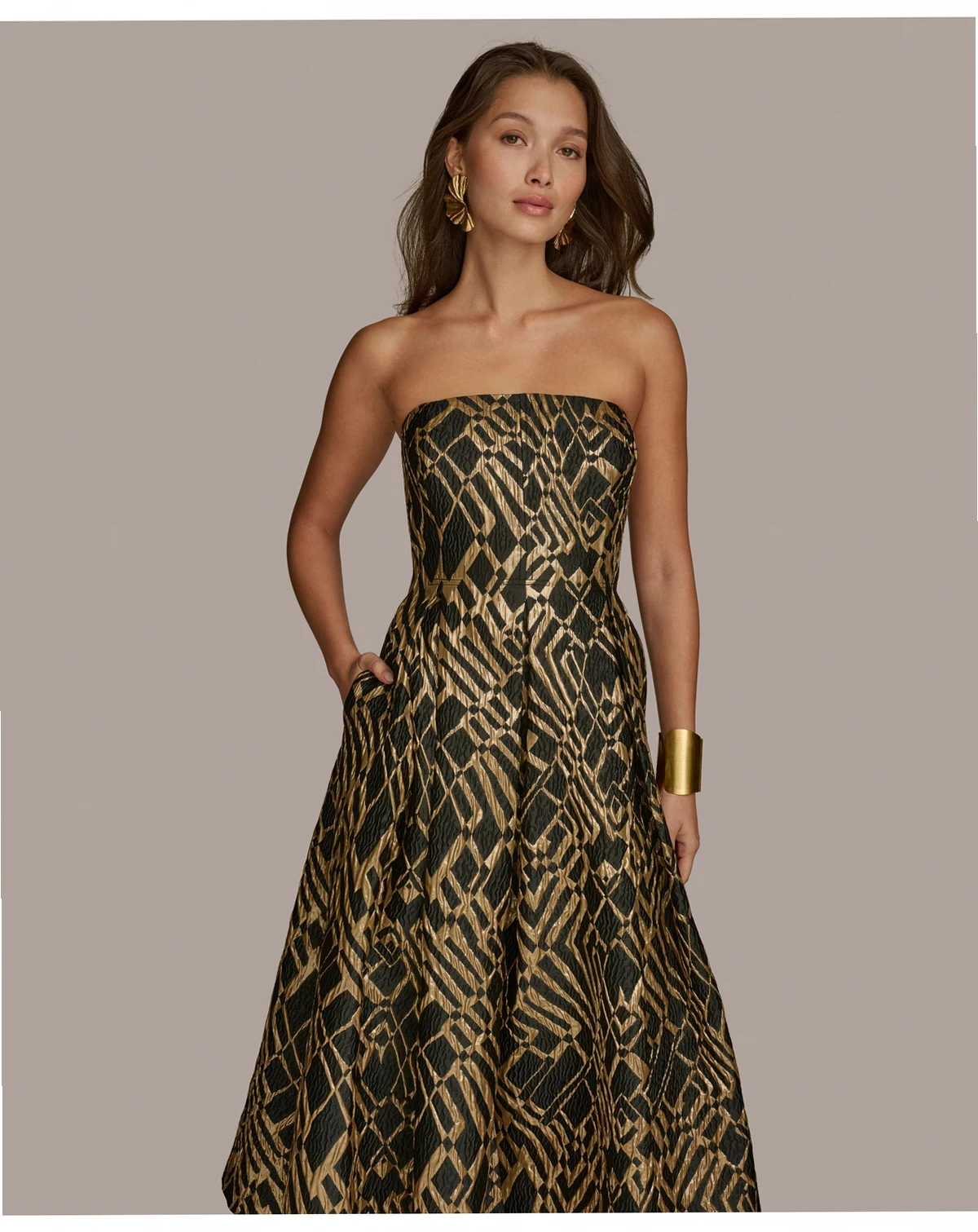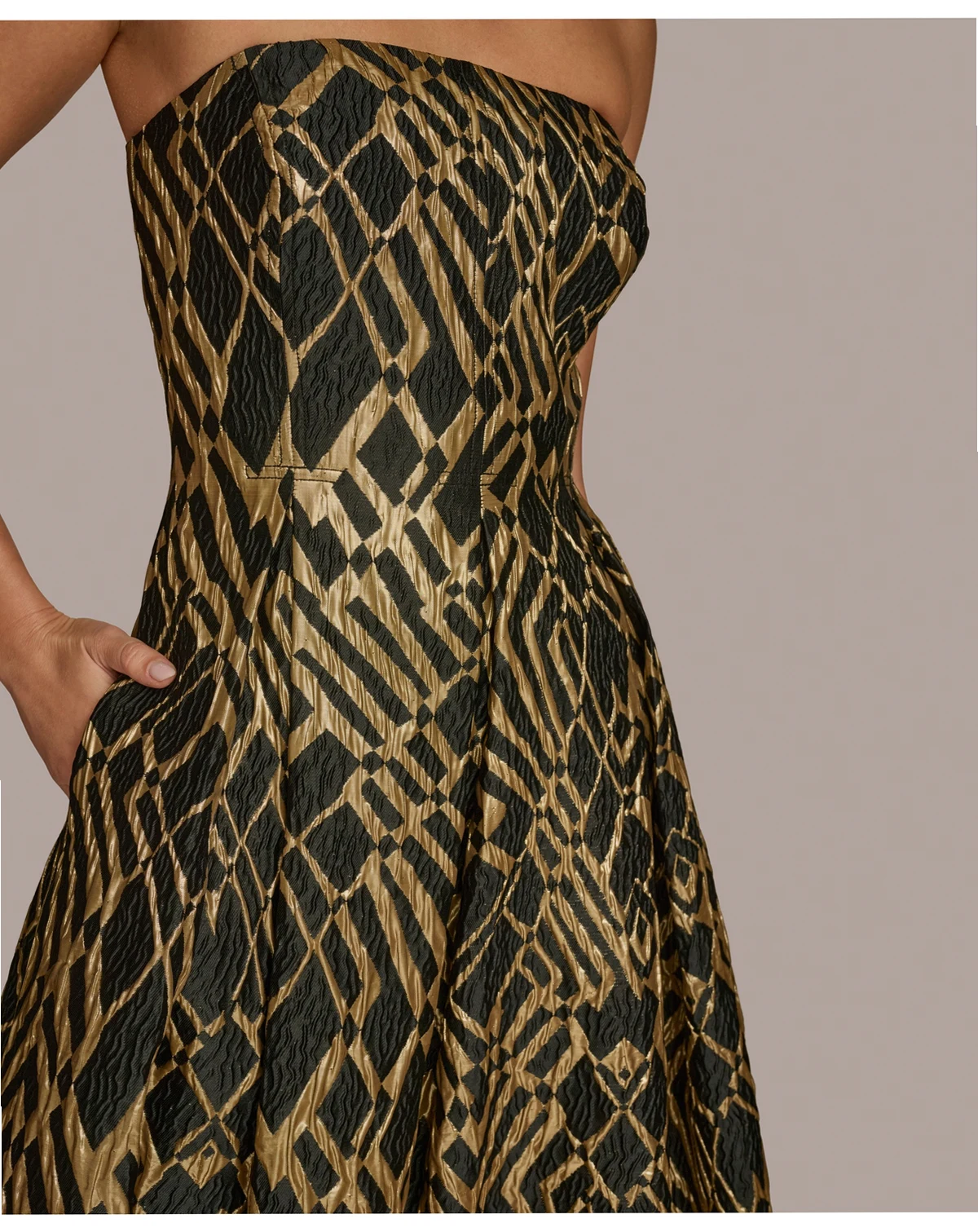 Unveiling your elegance with a metallic jacquard fabric, this strapless dress from Donna Karan New York offers a flattering fit-and-flare silhouette. The knee-length design exudes sophistication for formal events and parties.