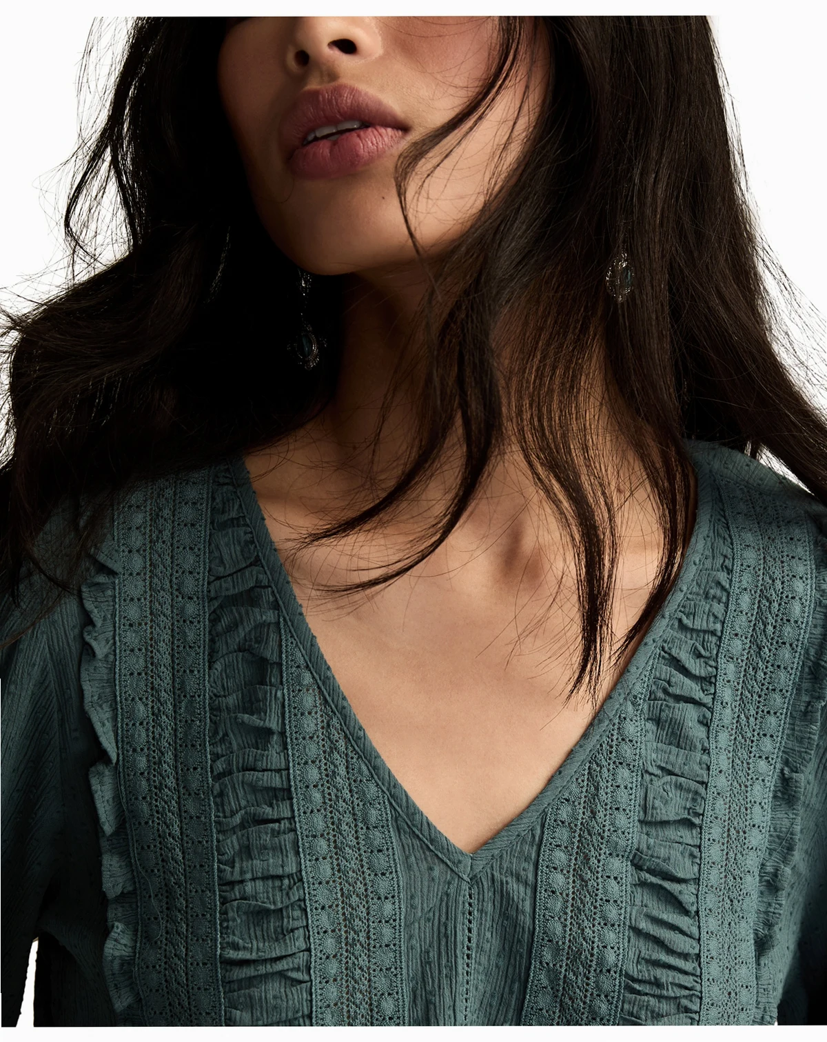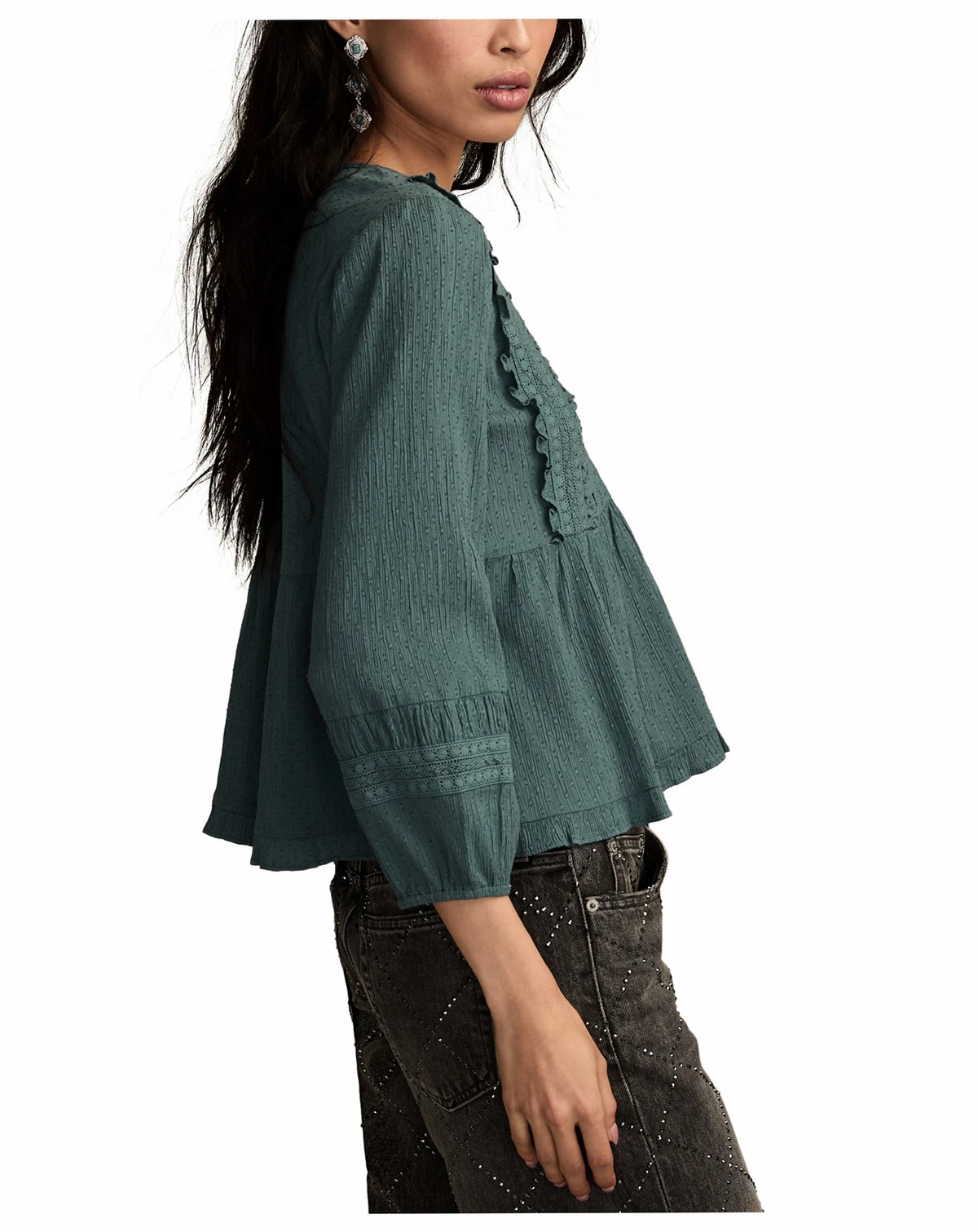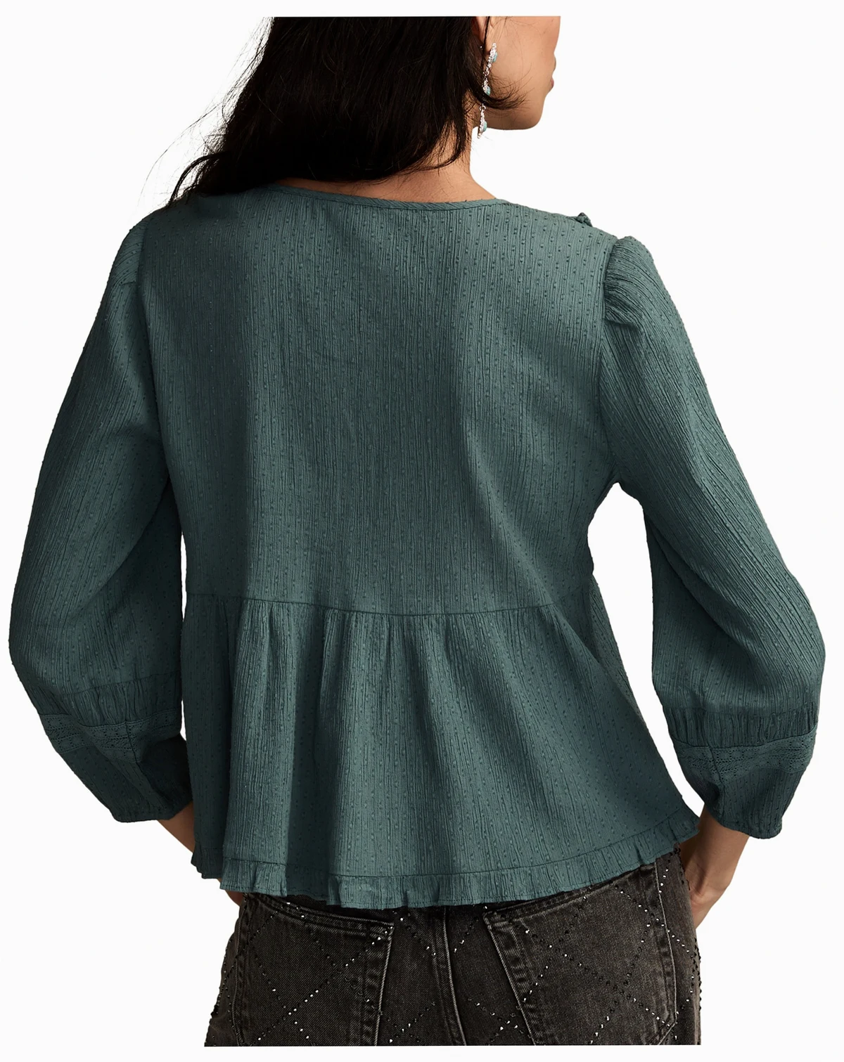 Style your next look with ruched details and a ruffle-trimmed peplum hem on this Lucky Brand long-sleeve top. The flattering neckline pairs perfectly with jeans and boots for a polished outfit.