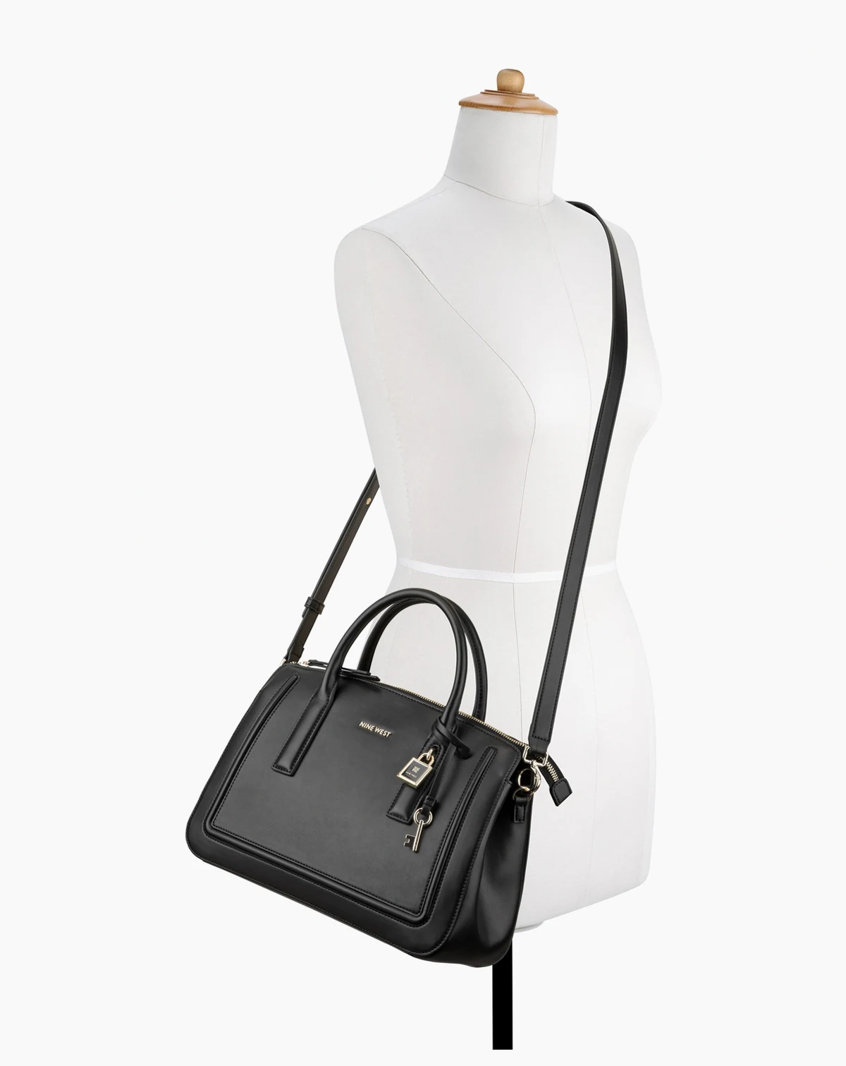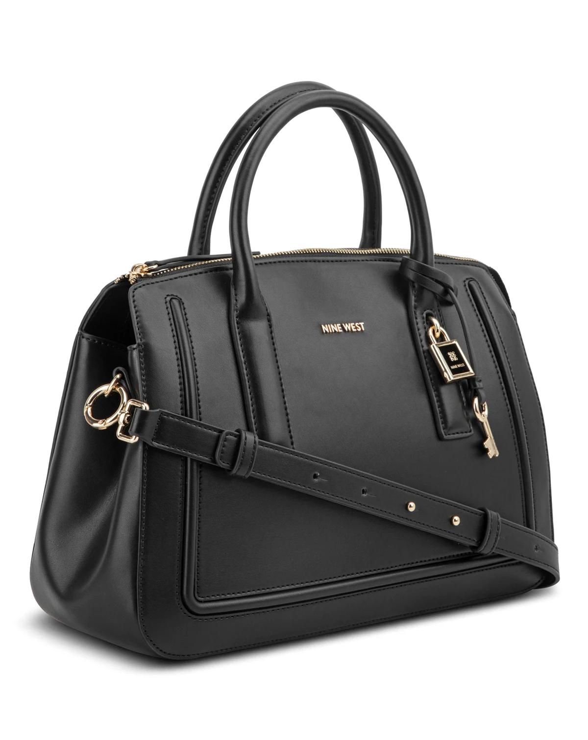 Nine West Tenely multiple compartment satchel in softest buttery material. Top zipper with magnetic compartment and interior organization pockets. Special branding with gold and enamel coated finish. Perfect career bag or anytime to be stylish. Features a lock and key adornment detail for luxe style.