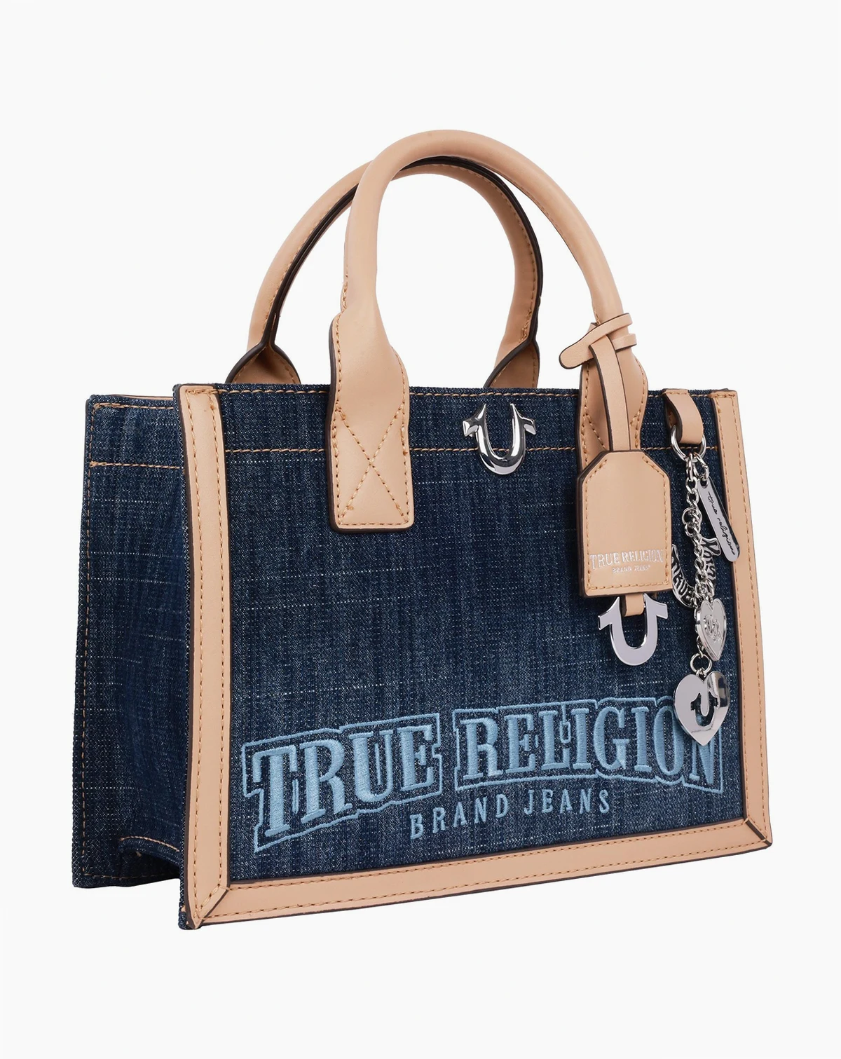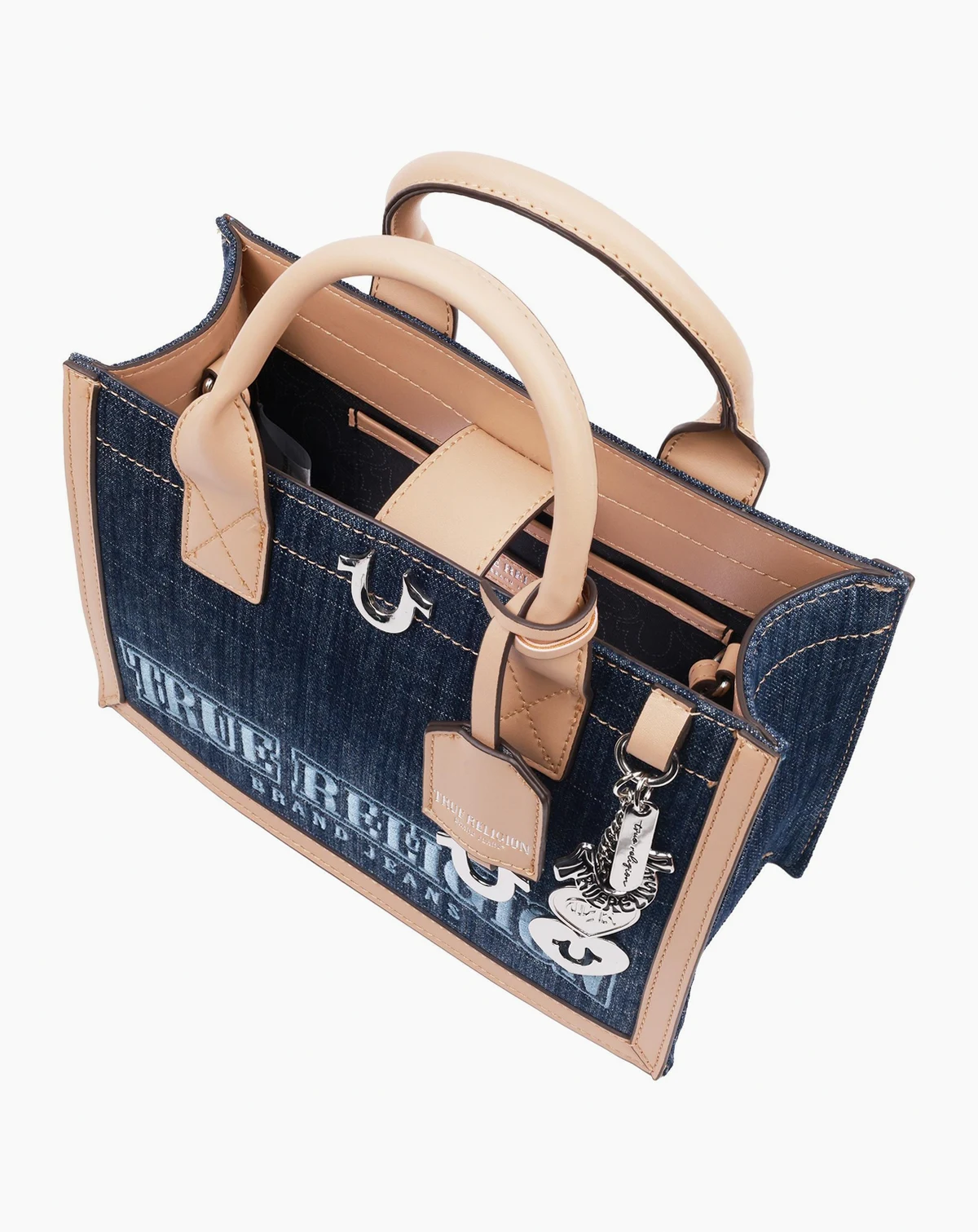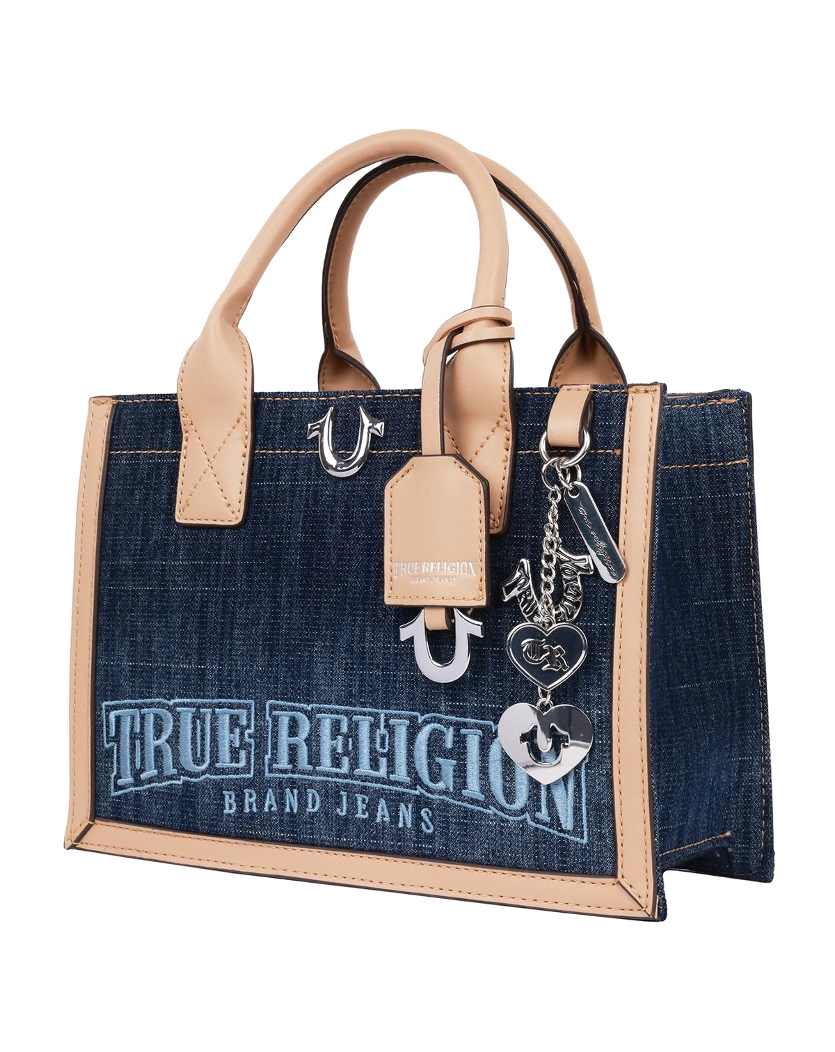 Classic denim gets a bold refresh with the True Religion Bombe Logo Denim Tote. Featuring contrast tan trim, oversized embroidered logo branding, and signature horseshoe hardware, this structured tote delivers standout edge and polished attitude. The bag includes dual top handles, a removable crossbody strap for versatility, and charm hardware for a touch of street-inspired glam. -This True Religion bag is officially licensed. You are ensured to receive genuine and authentic merchandise. -Material 100% Polypropylene, Lining 100% Polyester -Dimension: 7.5H X 10W X 4D -Weight 1 lbs. -Imported