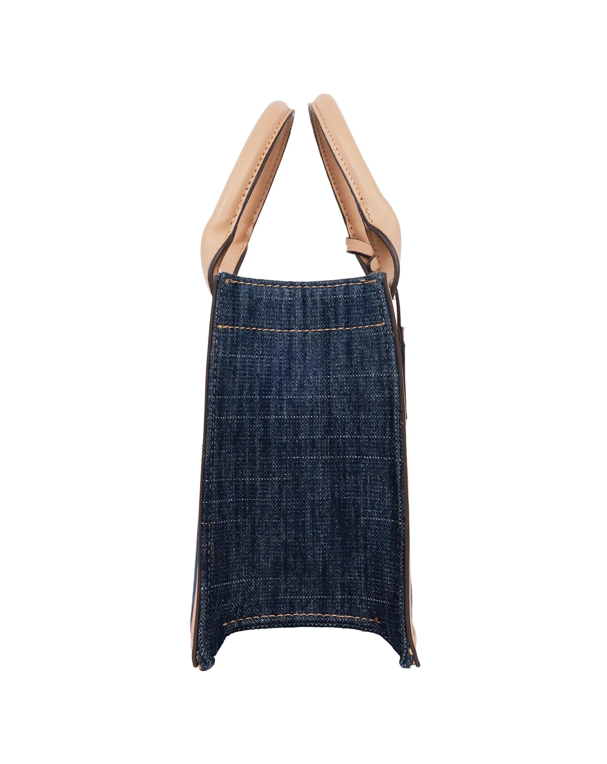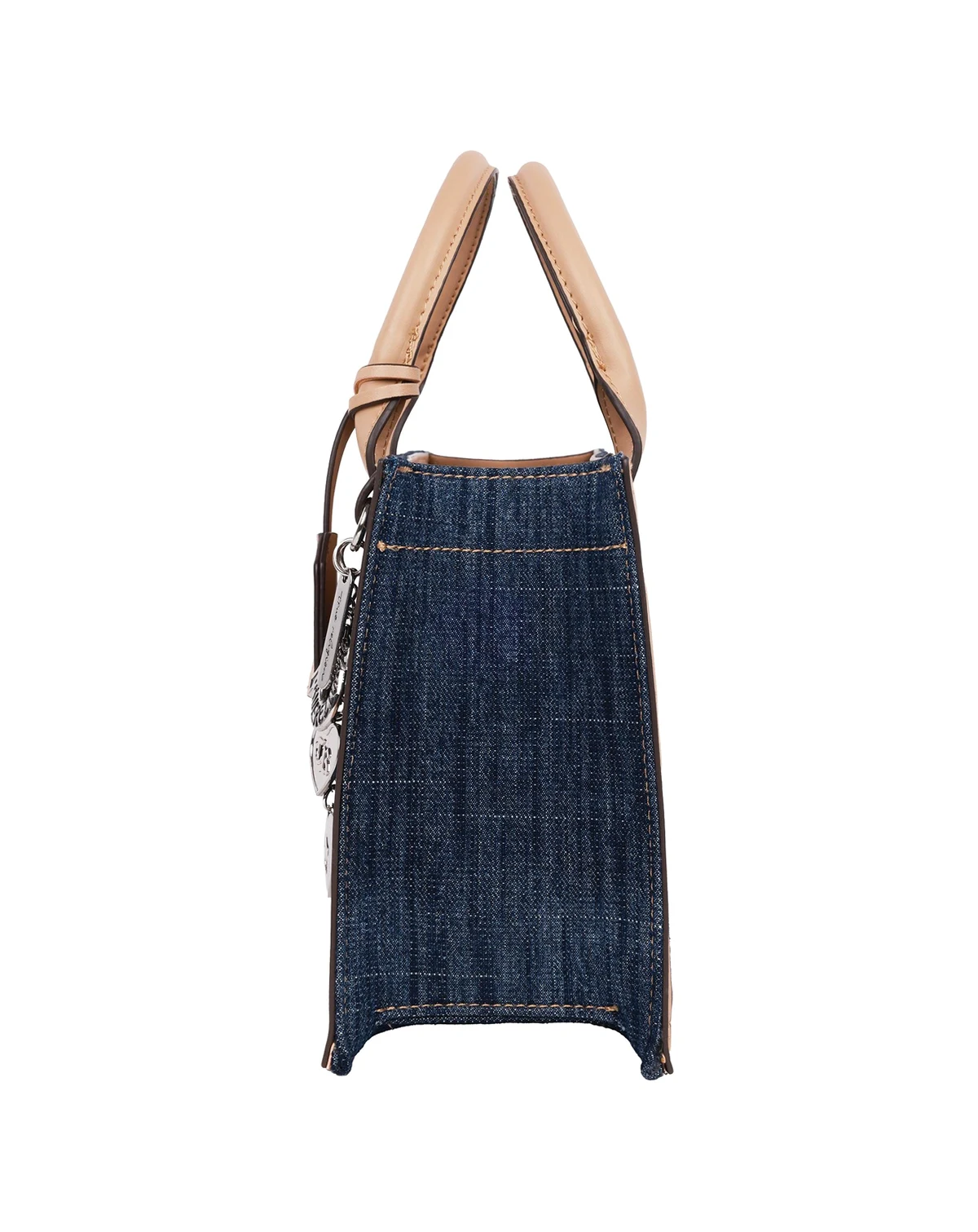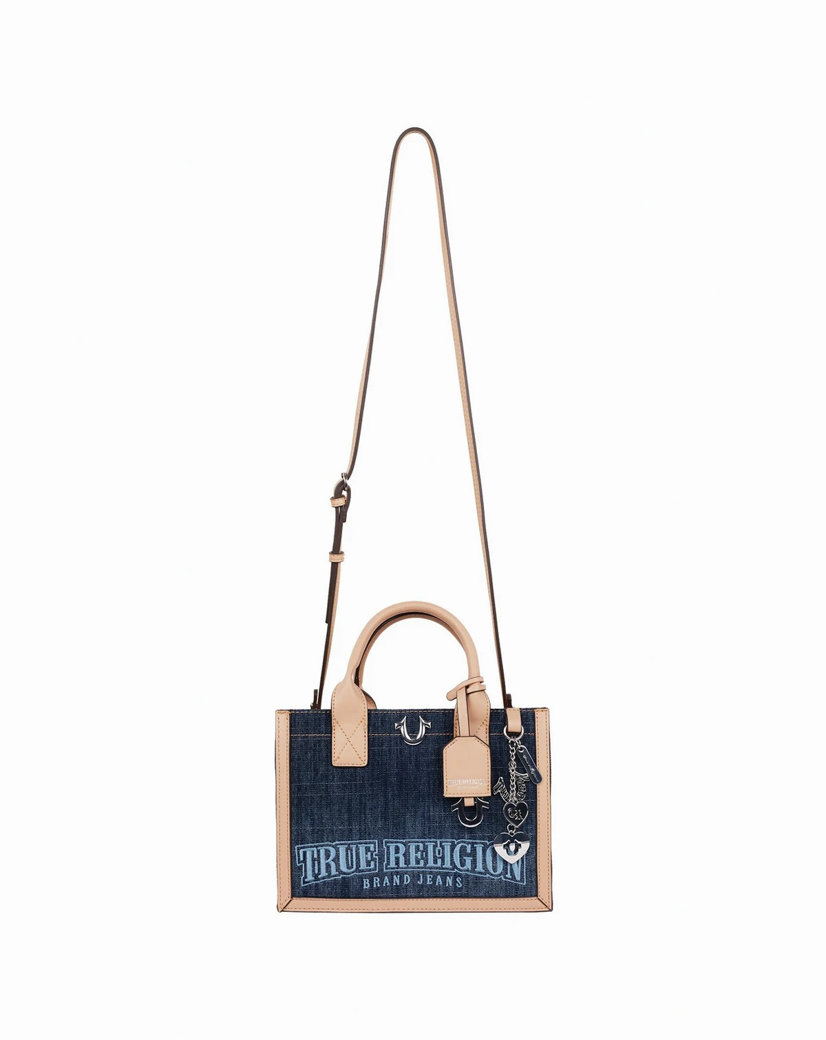Classic denim gets a bold refresh with the True Religion Bombe Logo Denim Tote. Featuring contrast tan trim, oversized embroidered logo branding, and signature horseshoe hardware, this structured tote delivers standout edge and polished attitude. The bag includes dual top handles, a removable crossbody strap for versatility, and charm hardware for a touch of street-inspired glam. -This True Religion bag is officially licensed. You are ensured to receive genuine and authentic merchandise. -Material 100% Polypropylene, Lining 100% Polyester -Dimension: 7.5H X 10W X 4D -Weight 1 lbs. -Imported