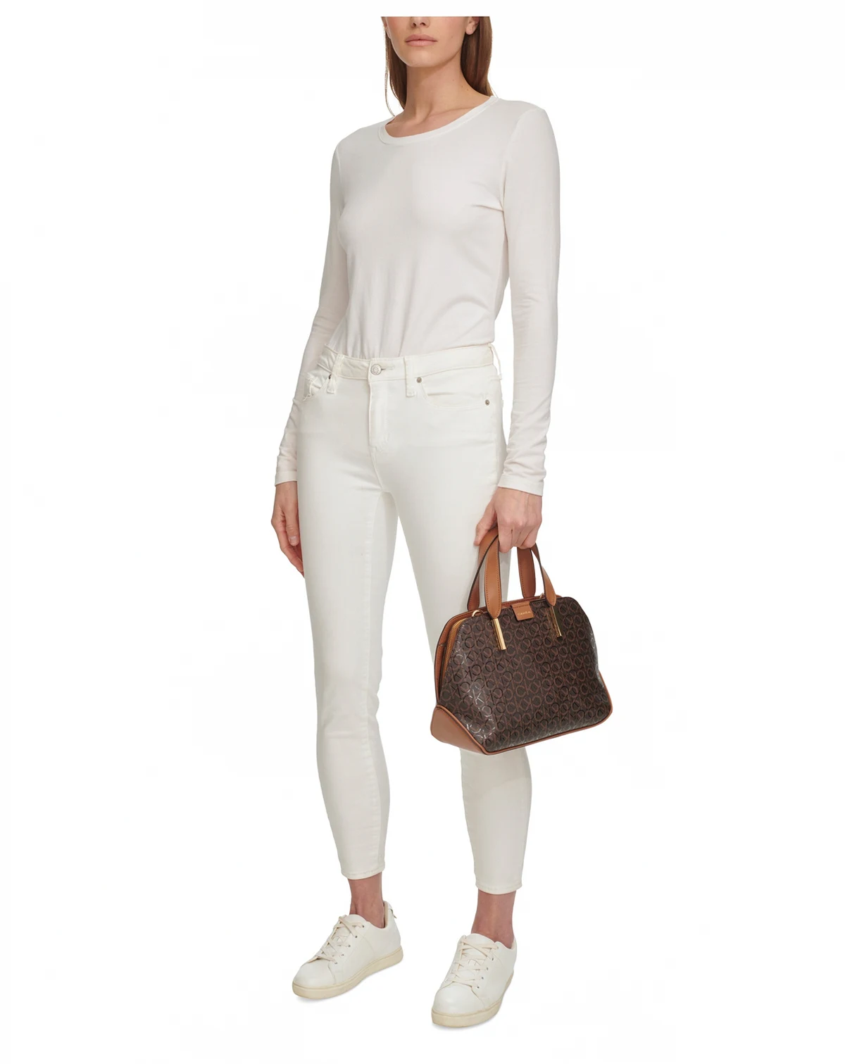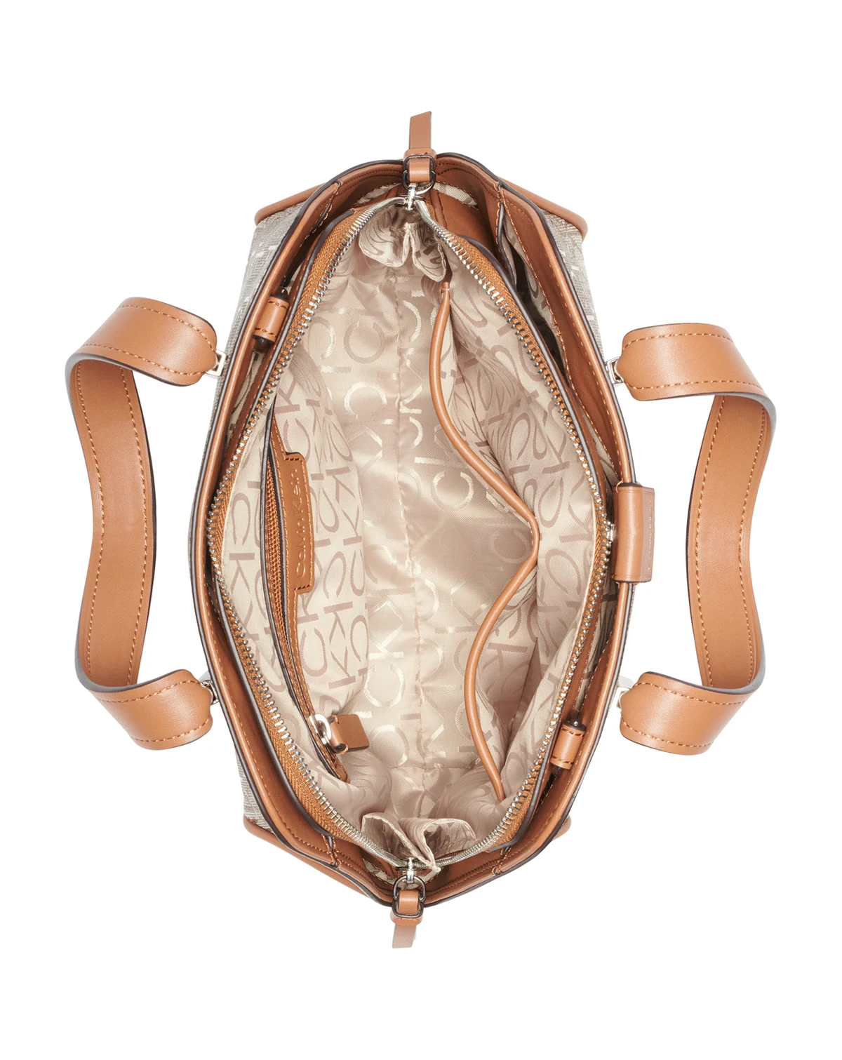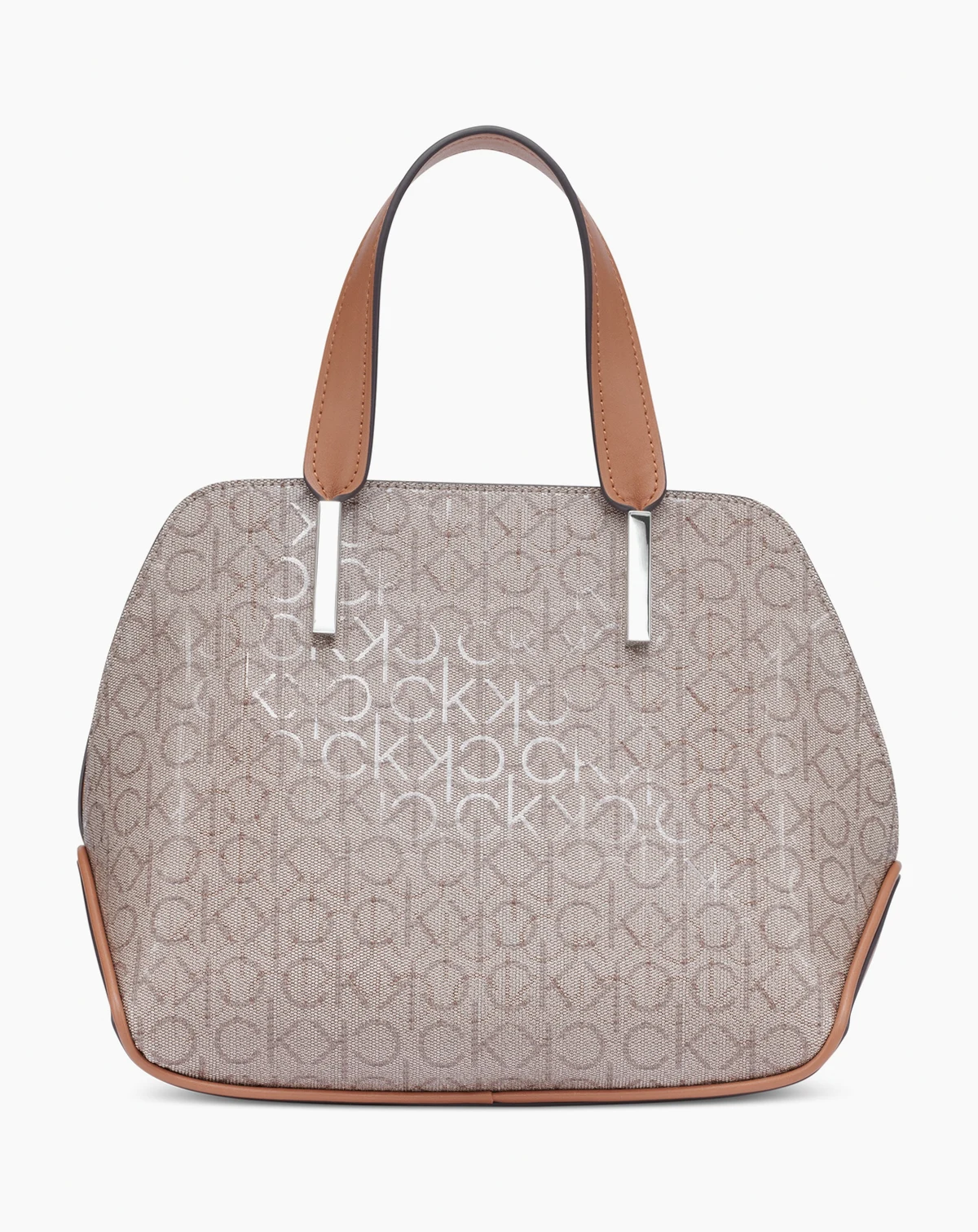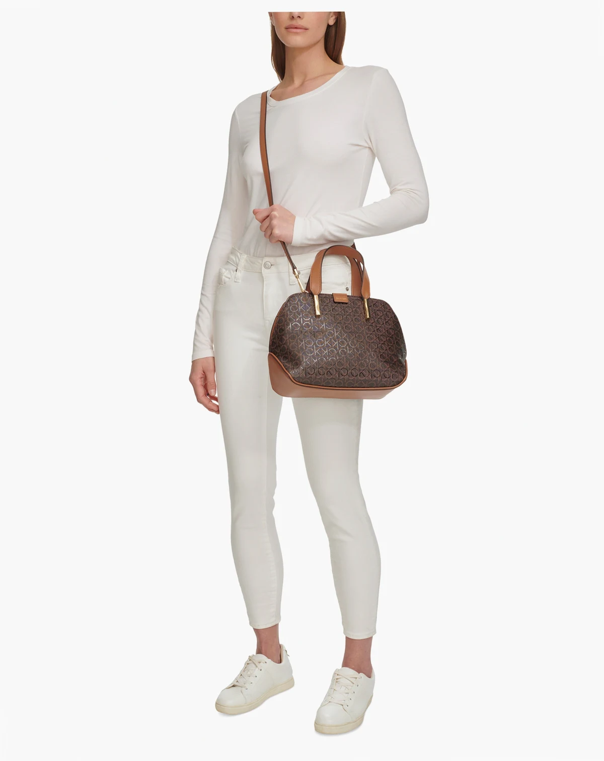 This classic satchel by Calvin Klein features allover monogram with chic metal accents. Grab this beauty by the handles or attach the strap for handsfree styling.