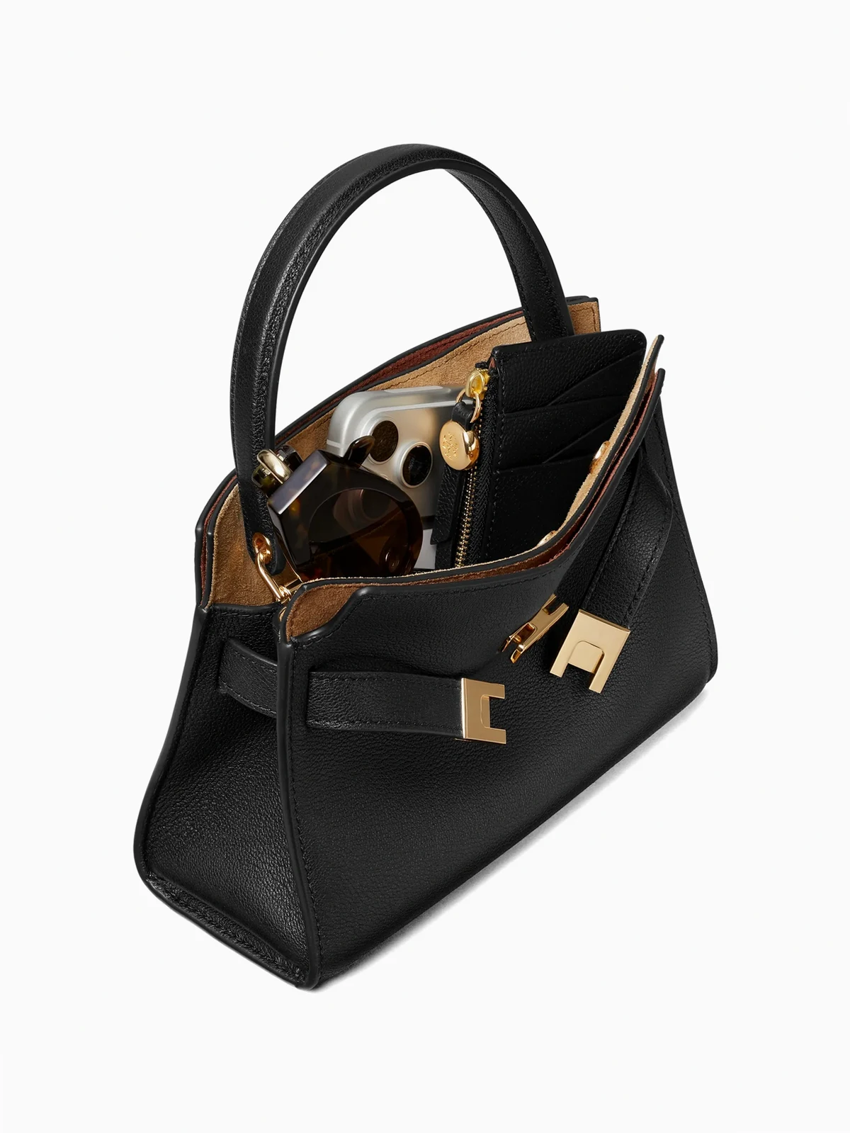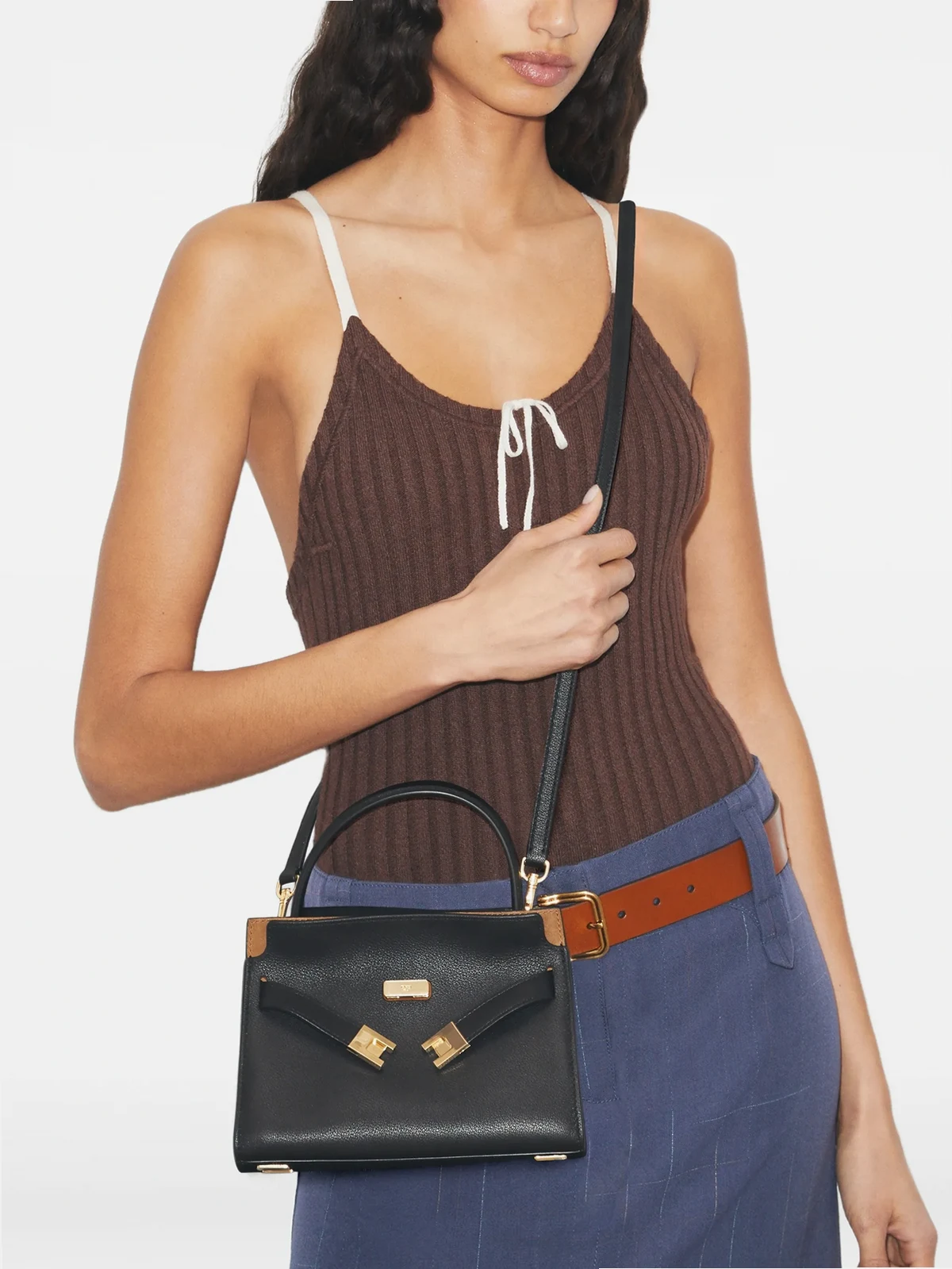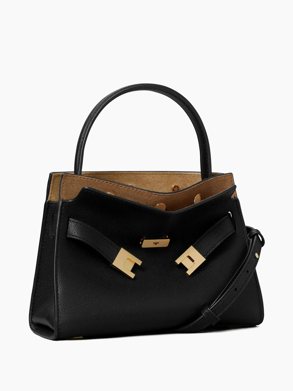 Contrasting structure and softness, our Petite Lee Radziwill Double Bag evolves with a slightly wider, lightweight silhouette and subtle streamlined details: tonal stitching on embossed pebbled leather, protective metal feet and a new removable crossbody strap. The spacious center compartment can comfortably fit a phone, wallet, earbuds and sunglasses. Composed of double layers that create slim compartments at the front and back, it can be worn open or snapped fully closed. Beautifully crafted, with our T-lock belt closure. The collection is named for Lee Radziwill, who was fearlessly unique.