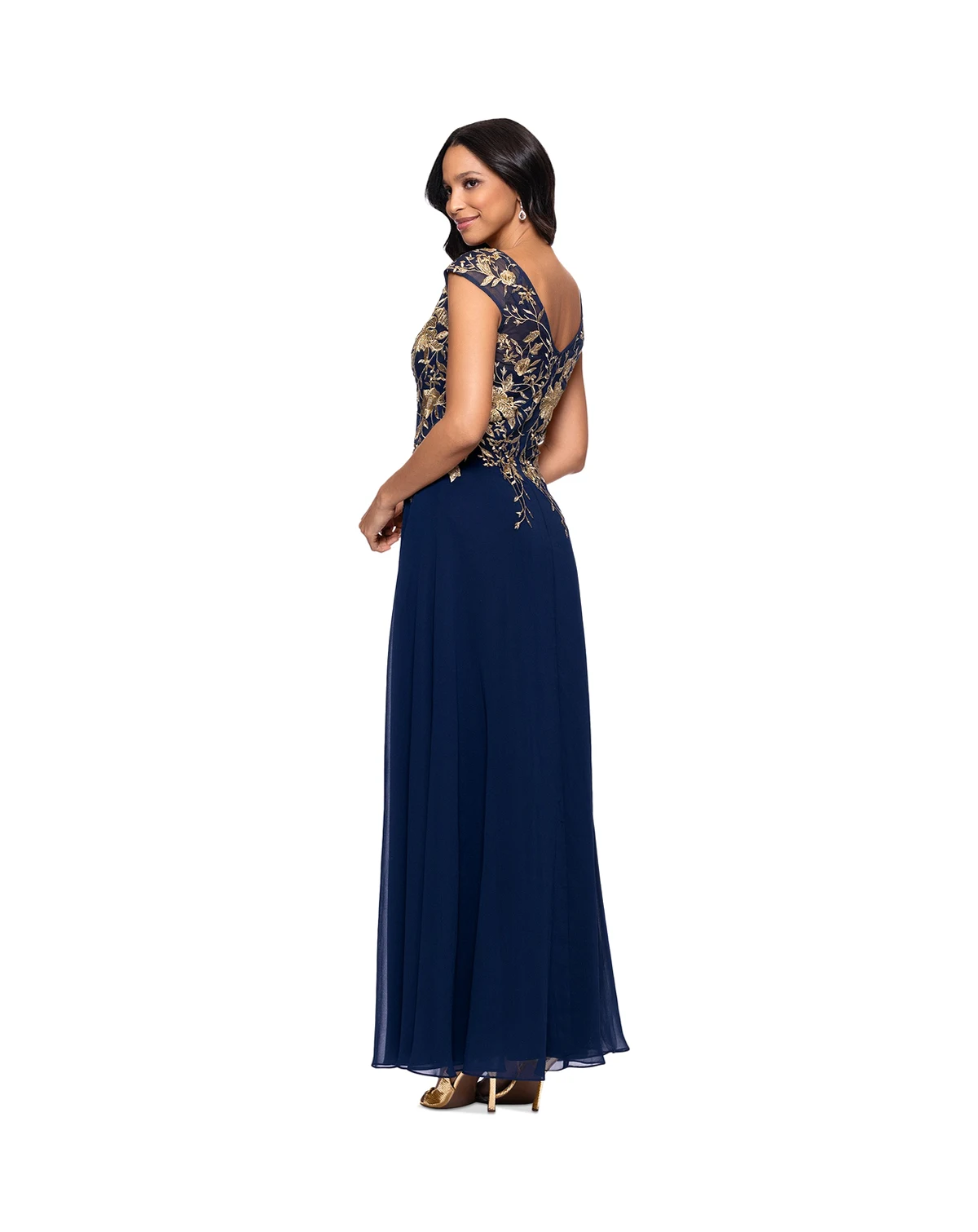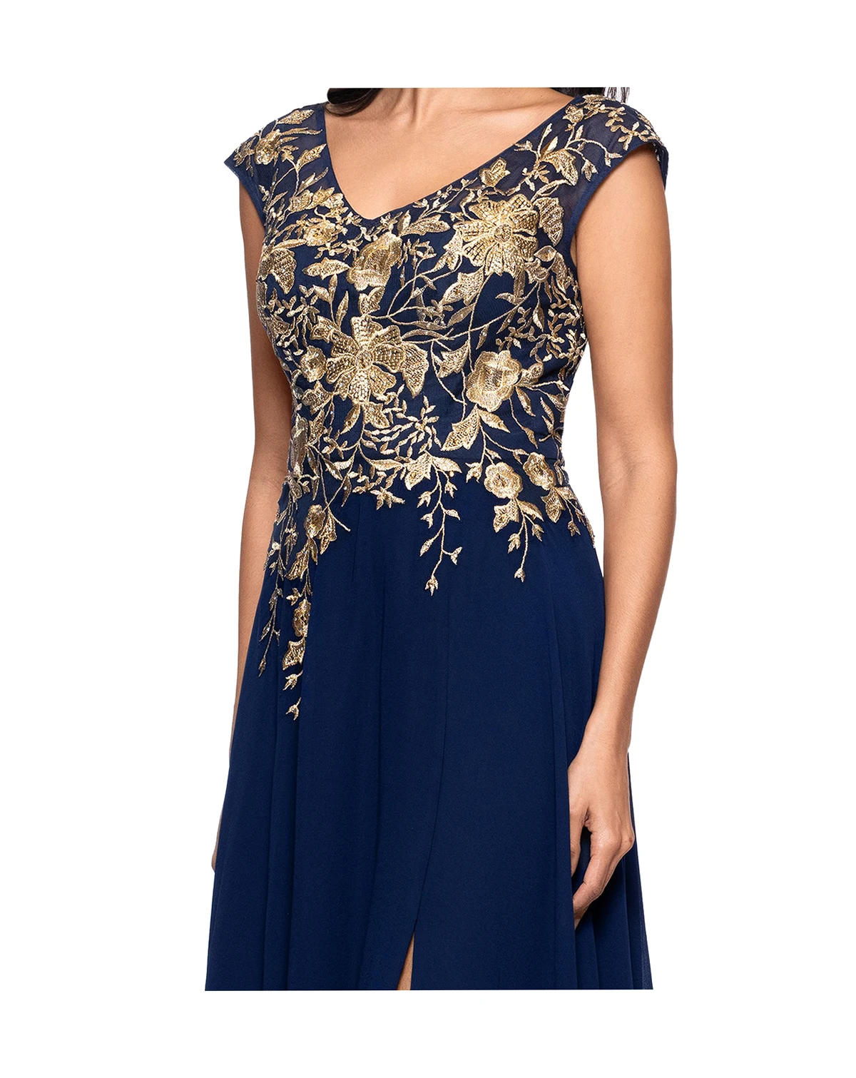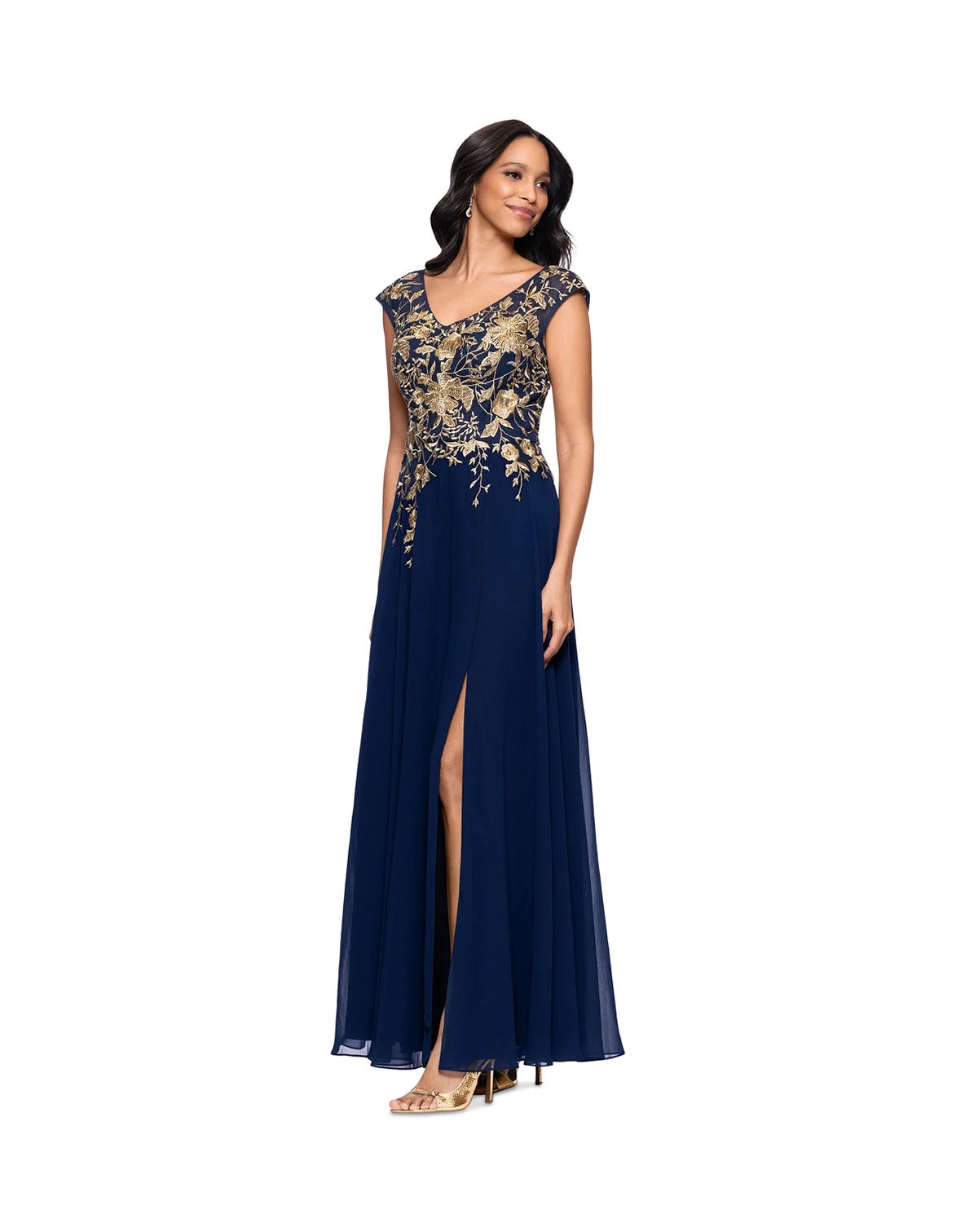 Glide into glamorous elegance with this women's slit-front chiffon gown from Betsy & Adam, designed with a daring front slit and exquisite gold embroidery at the bodice for a truly radiant and unforgettable statement.
