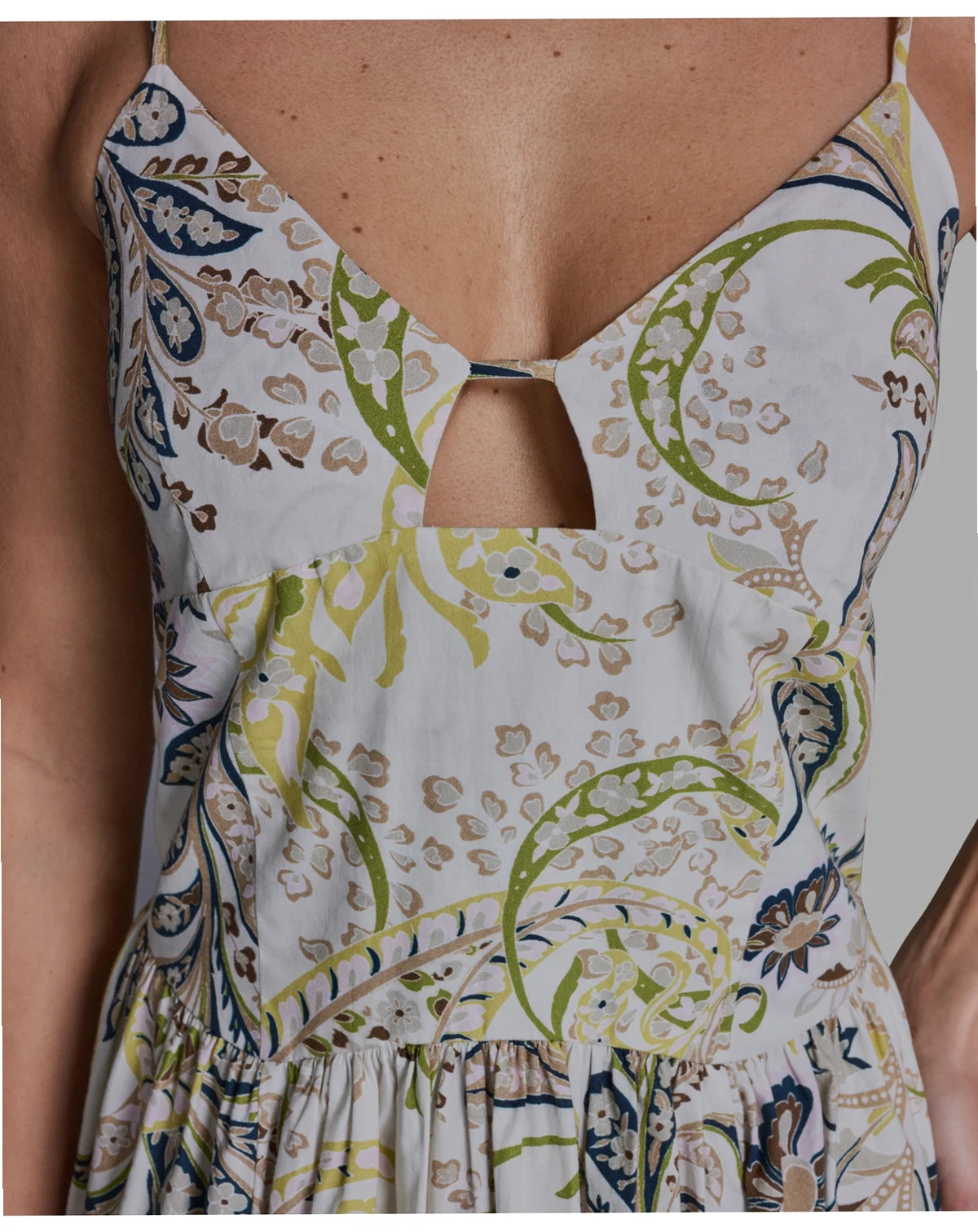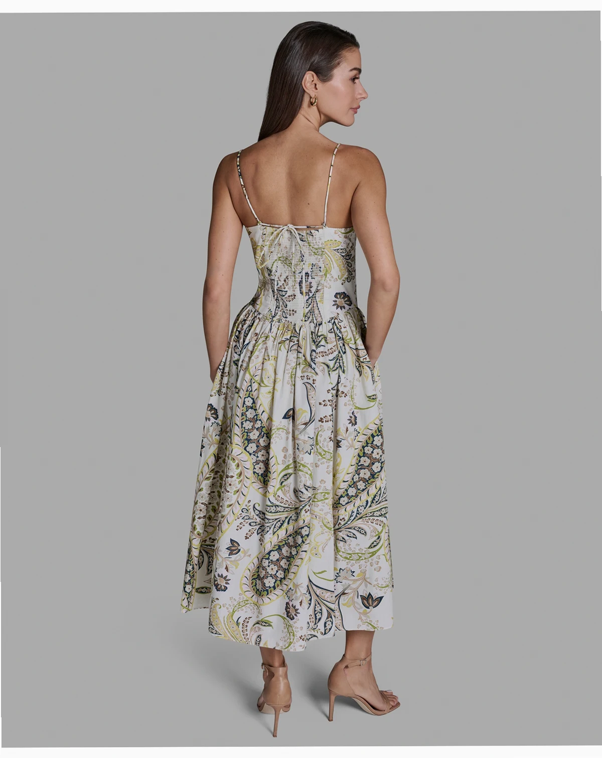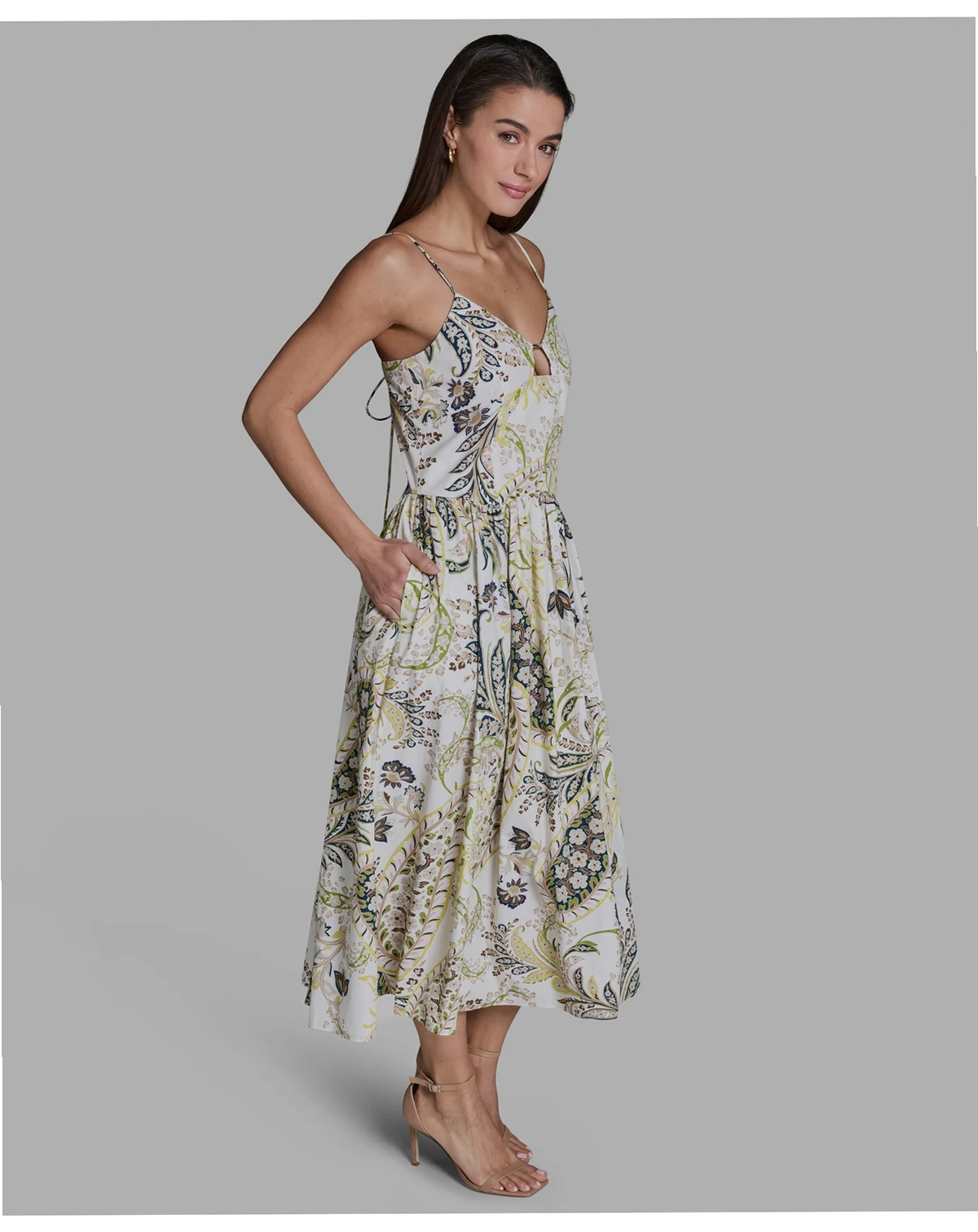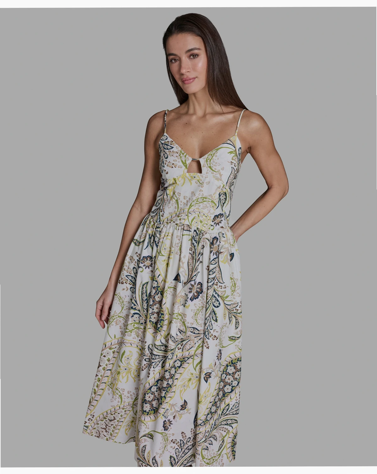 Float through sunlit days with ease in this BCBG midi dress, showcasing a paisley print and delicate spaghetti straps. A keyhole detail at the V-neck bodice adds a touch of romantic allure.