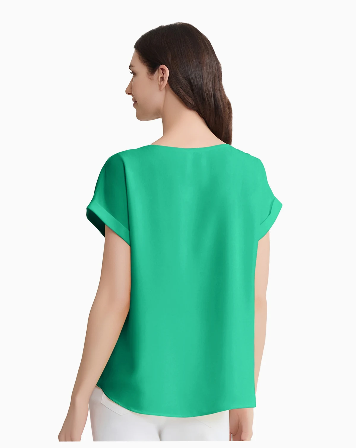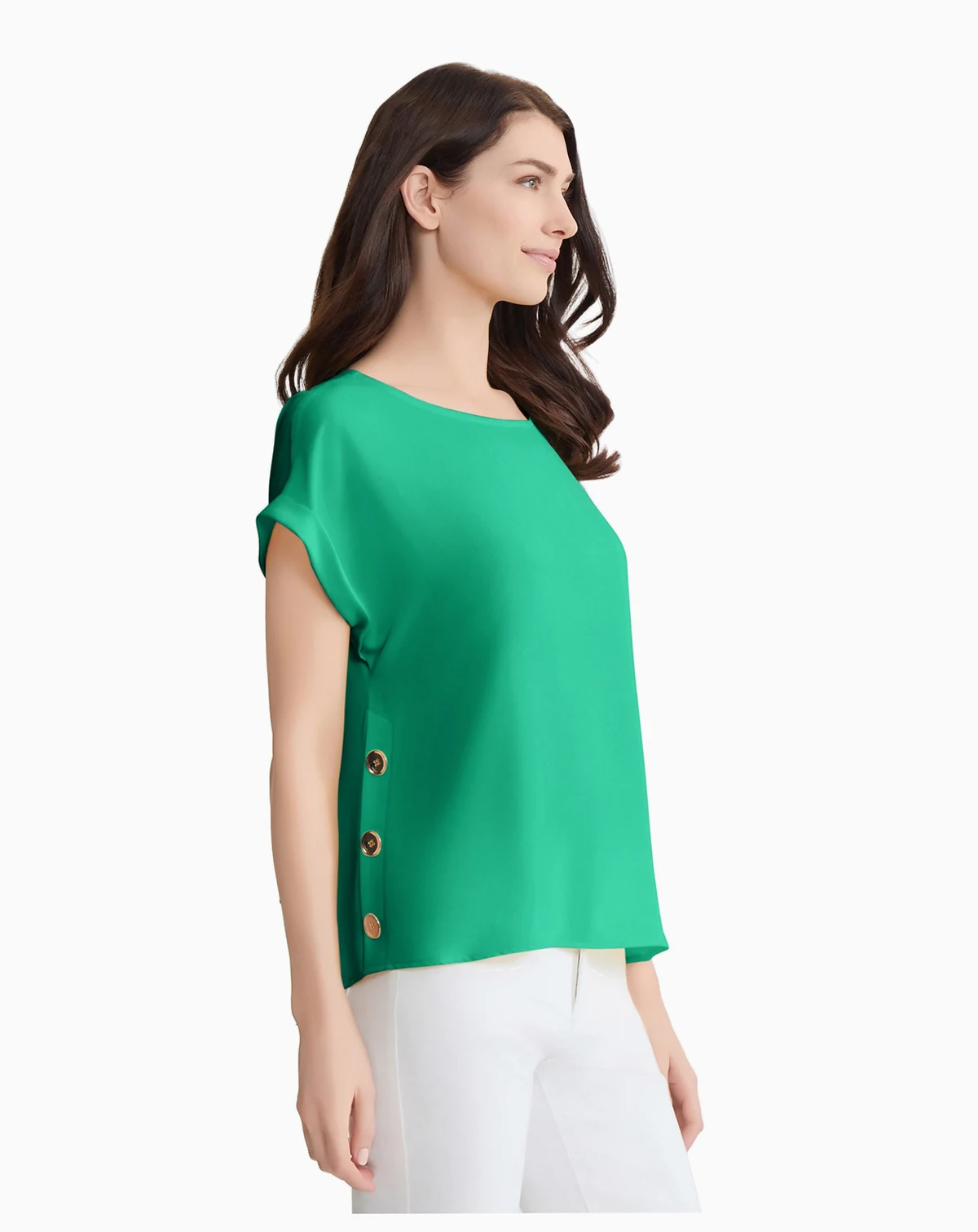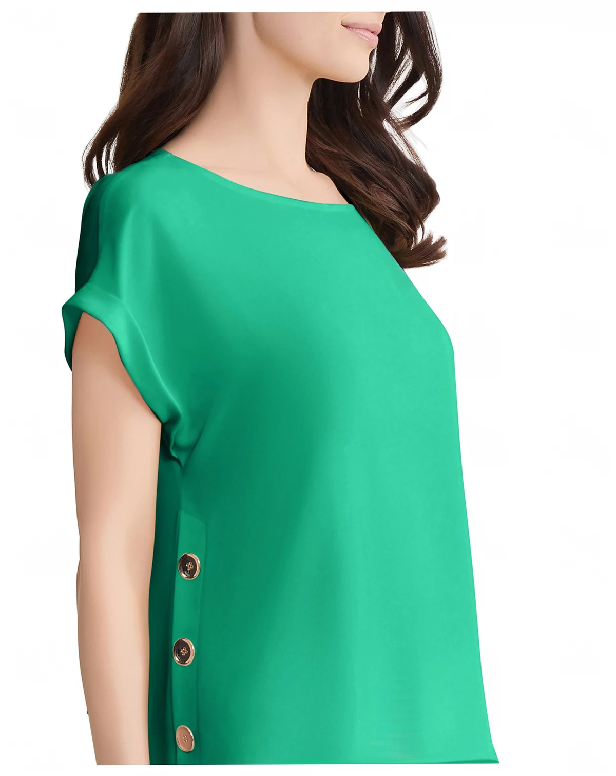 Sporting a boat neck, this Jones New York pull-on blouse includes elegant button detailing. The short sleeves and regular fit provide a sophisticated, easy-to-wear silhouette.