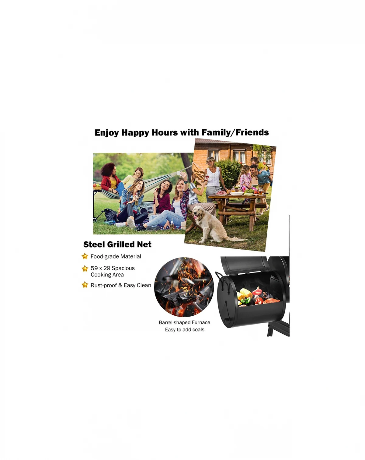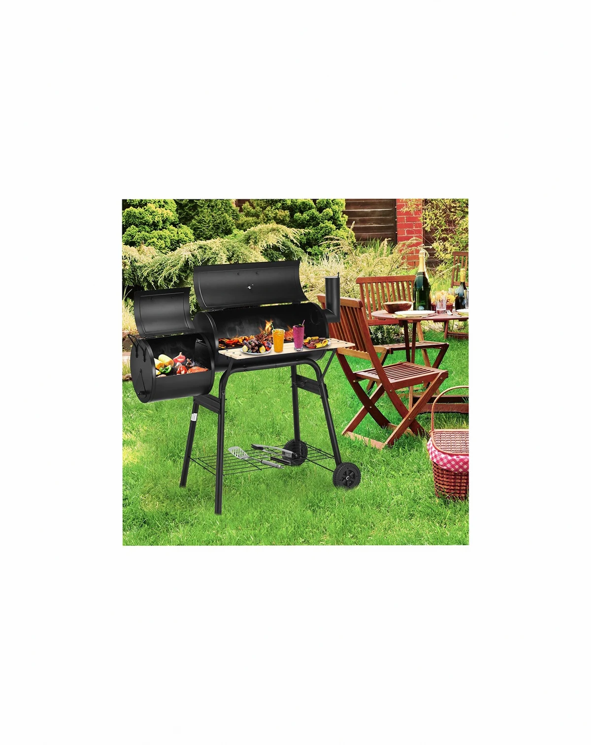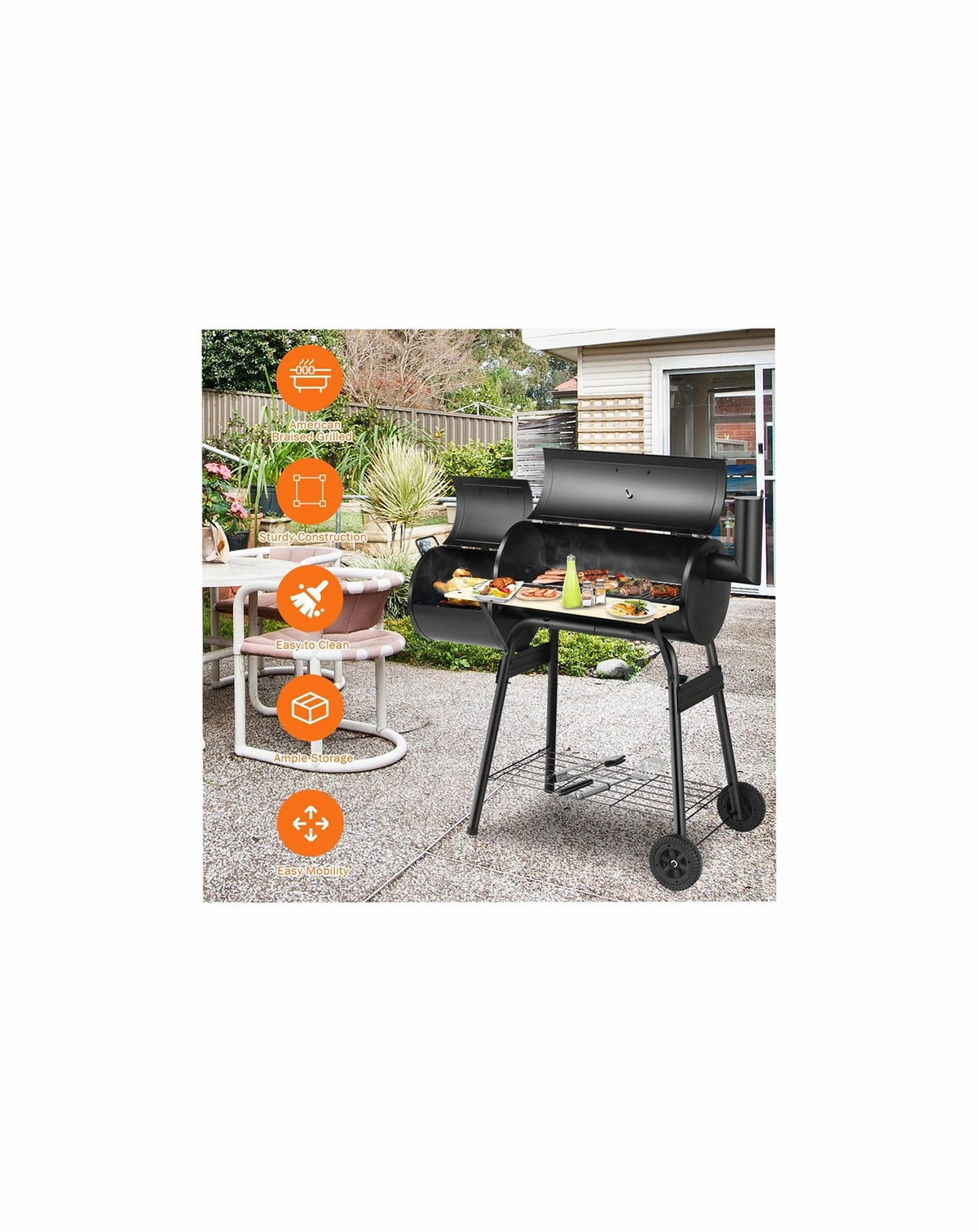 Enjoy outdoor cooking with this durable steel grill. Its heavy-duty construction and anti-rust design ensure longevity. Features an attached firebox to reduce smoking, a convenient side shelf for food and tools, and an installation guide for easy setup.