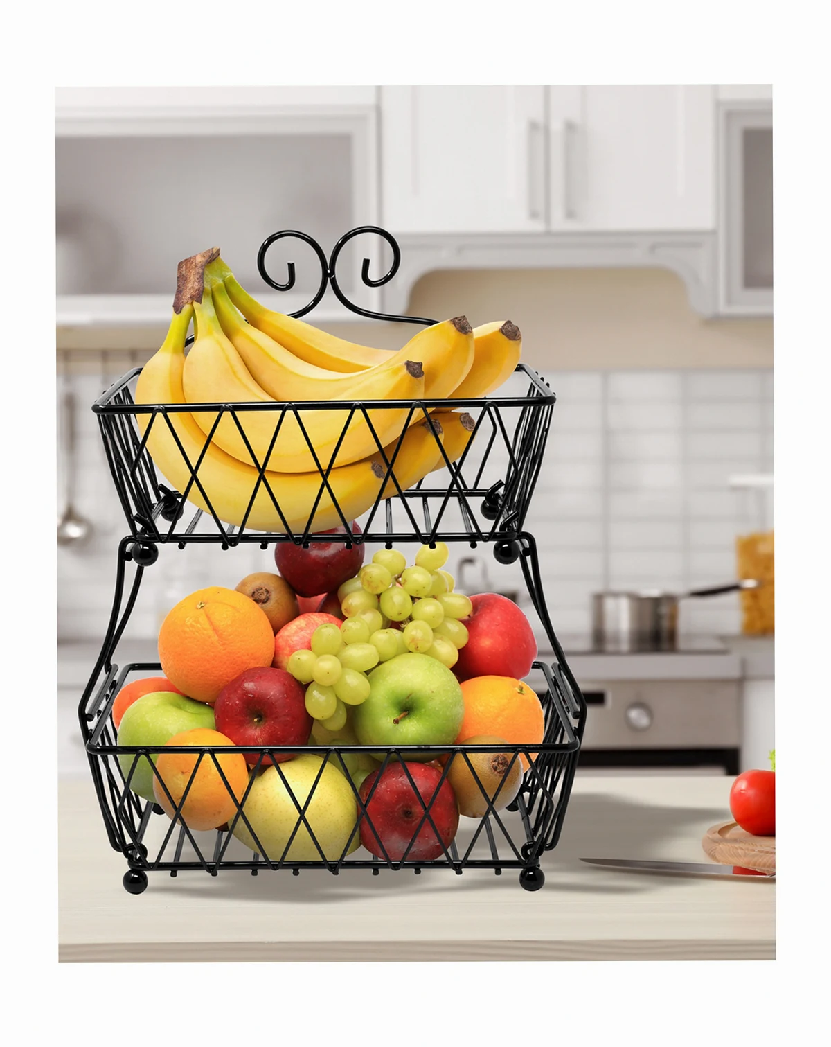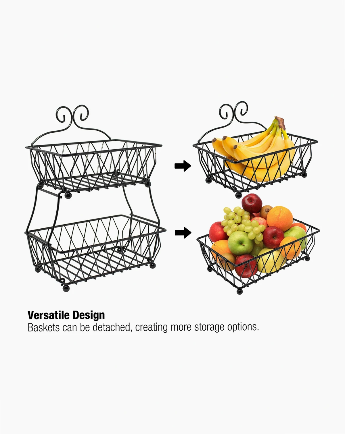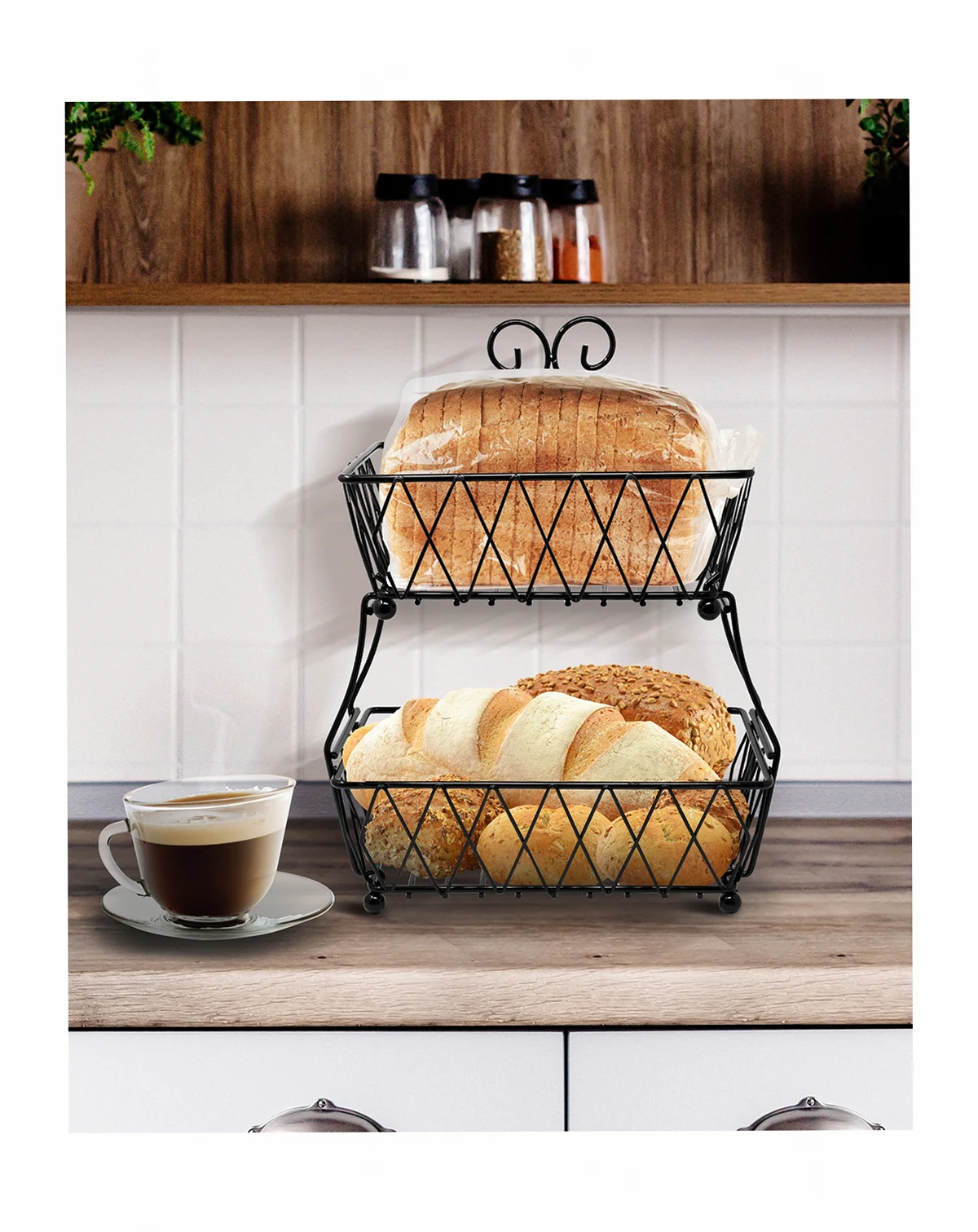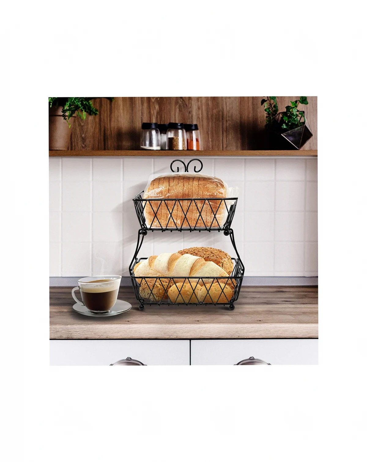 Put your food on display in this charming 2-Tier Wire Basket. It features two rectangular (open-concept) baskets with classic antique style. Store anything from fresh fruit, bread, and snacks, to general household items. The versatile design allows you to maximize vertical space on your countertops or dissemble into two separate serving pieces. Use it for everyday use in the kitchen or entertaining special occasions on the buffet.