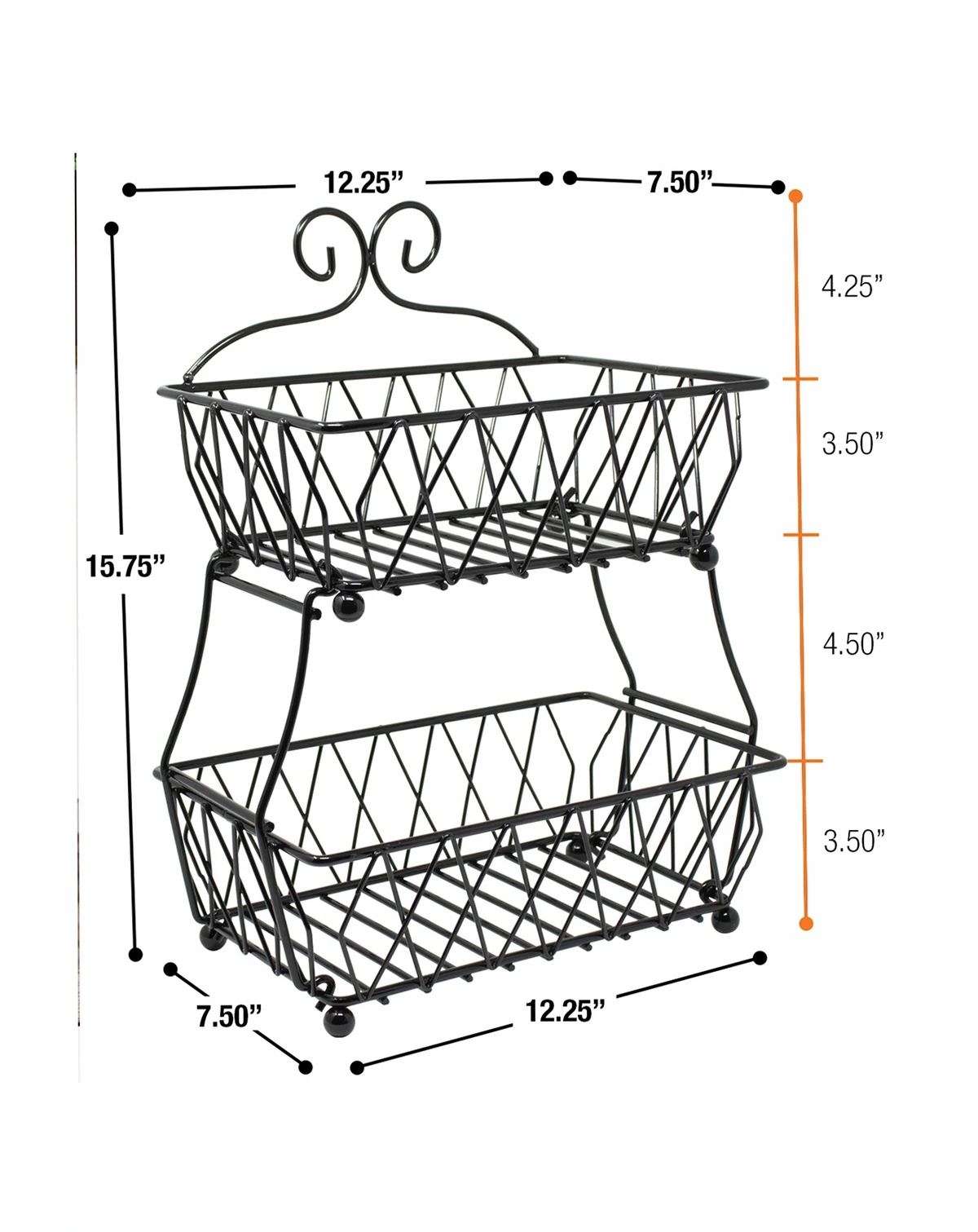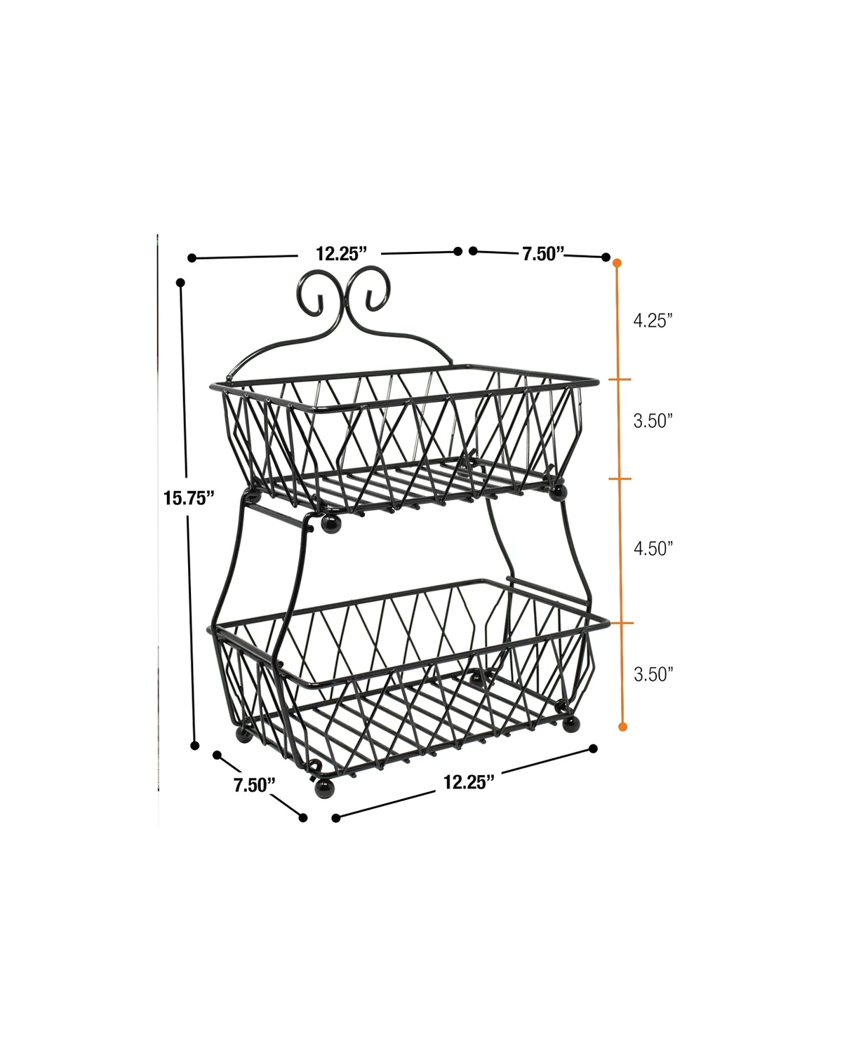 DESIGN SPECIFICATIONS - Made of metal wire with powder coated finish, features 2 levels, 4.50" height between tiers. TOP: 10.25" L x 7.50" W x 3.50" H. BOTTOM: 11.25" L x 7.50" W x 3.50" H. Entire Unit 12.25"