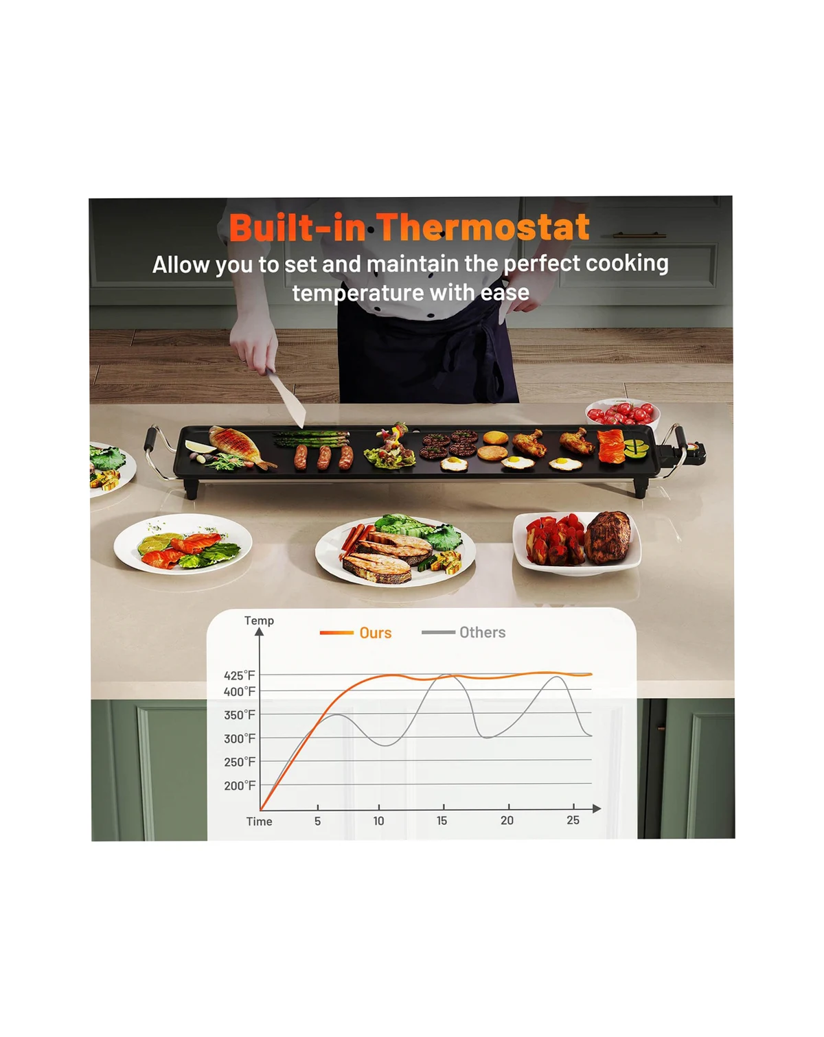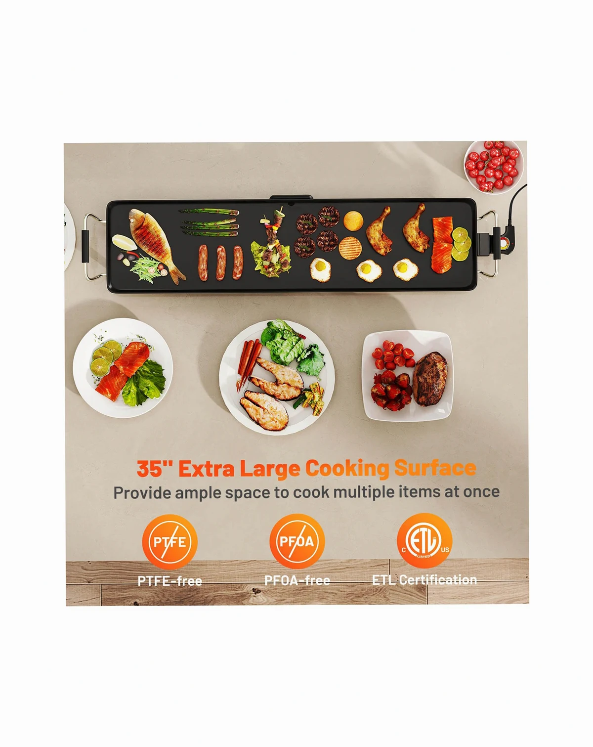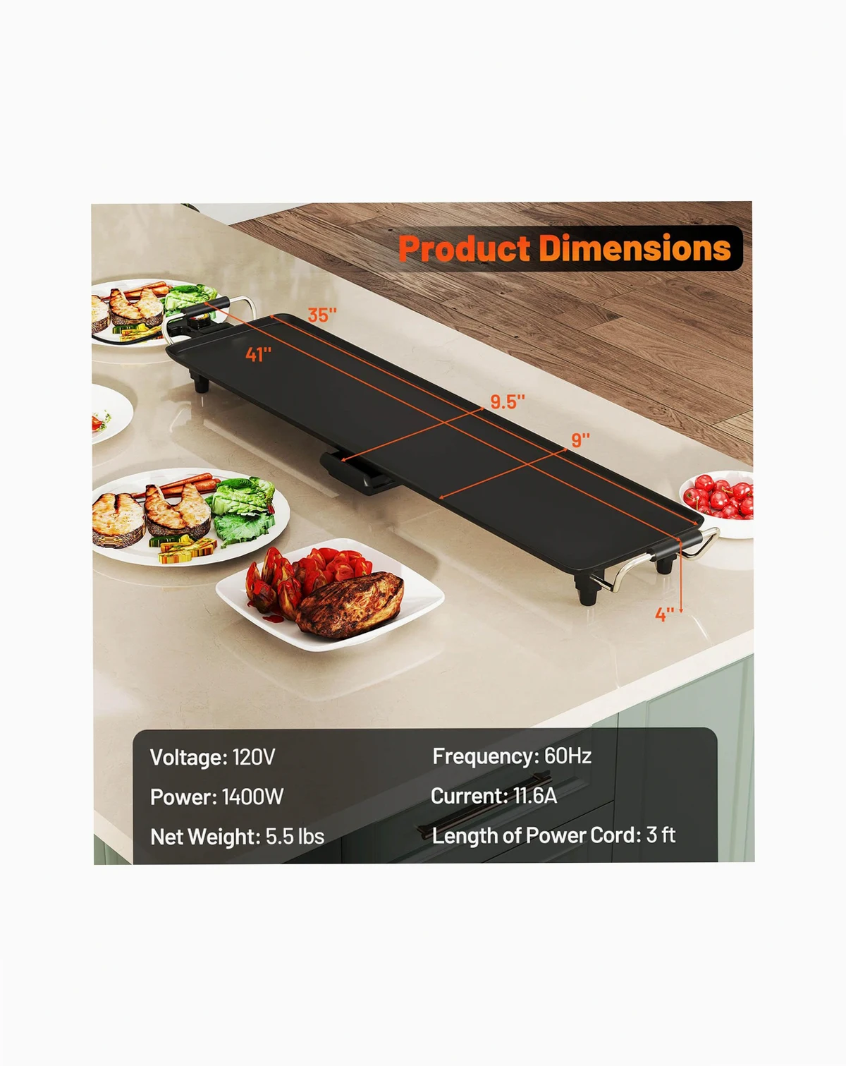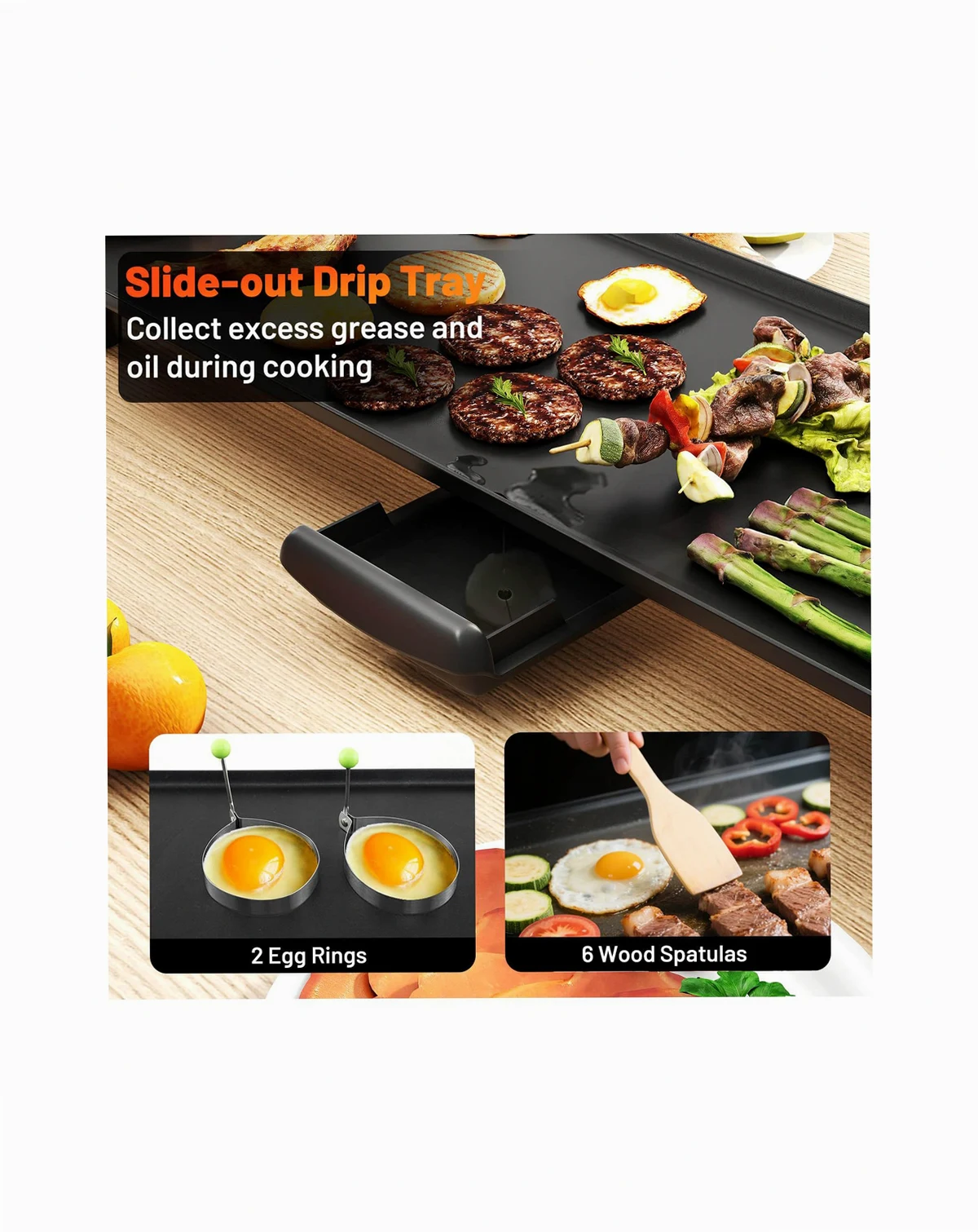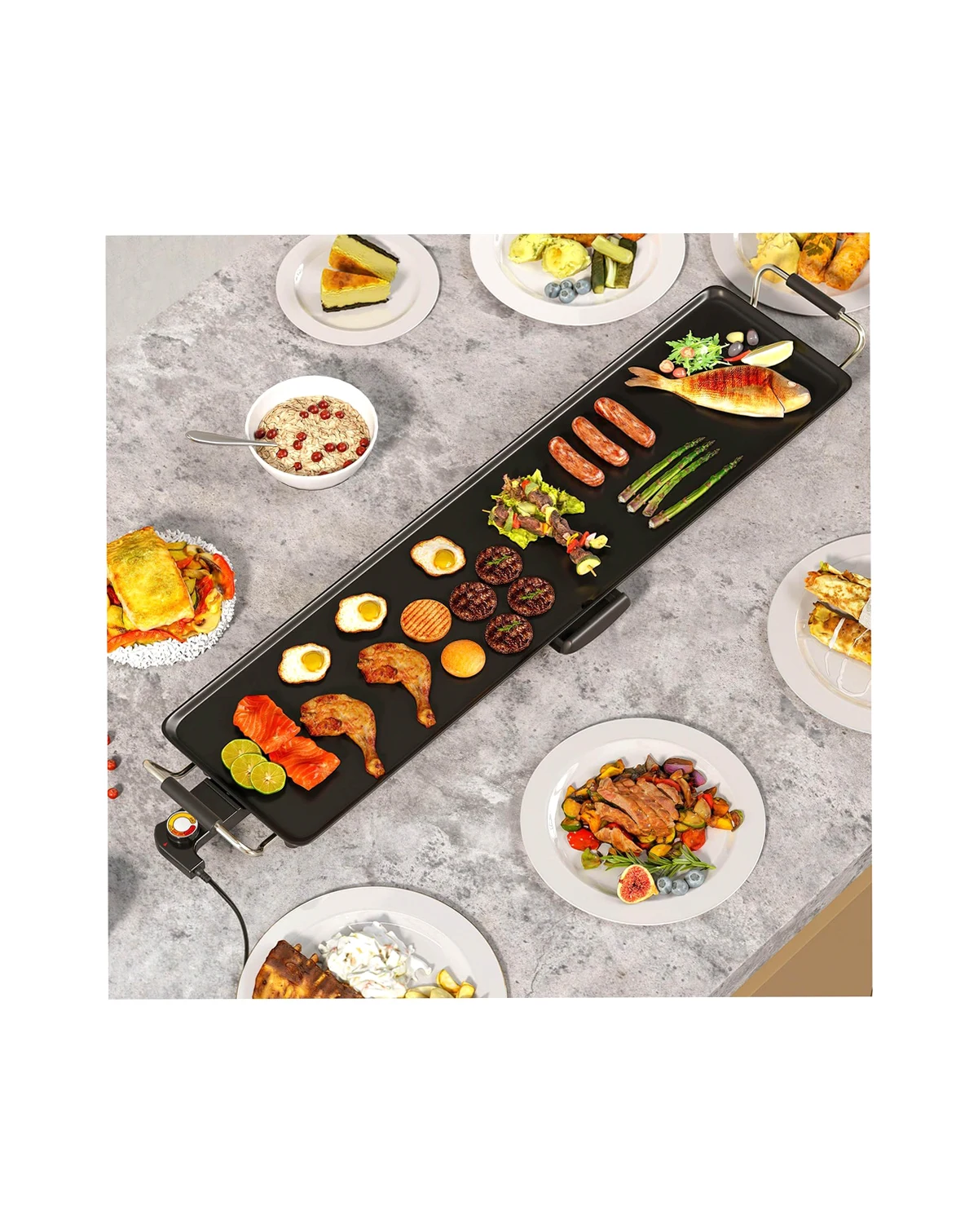 Upgrade your cooking game with this extra large electric griddle! The 35" x 9" cooking surface allows you to serve 8-10 people at once, making it perfect for family gatherings. With 4 customizable temperature settings, you can easily achieve the perfect sear on your burgers, crispy bacon, or fluffy pancakes. The nonstick surface and pull-out drip tray ensure effortless cooking and hassle-free cleaning. Thoughtfully crafted details such as an anti-scalding handle and non-slip foot pads provide you with added convenience. Portable and stable, this electric BBQ grill is perfect for both indoor use. Don't settle for ordinary - elevate your cooking experience with our stamping aluminum electric griddle today!