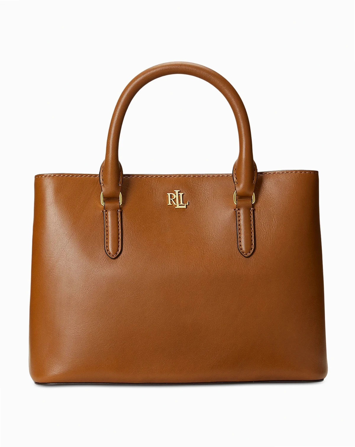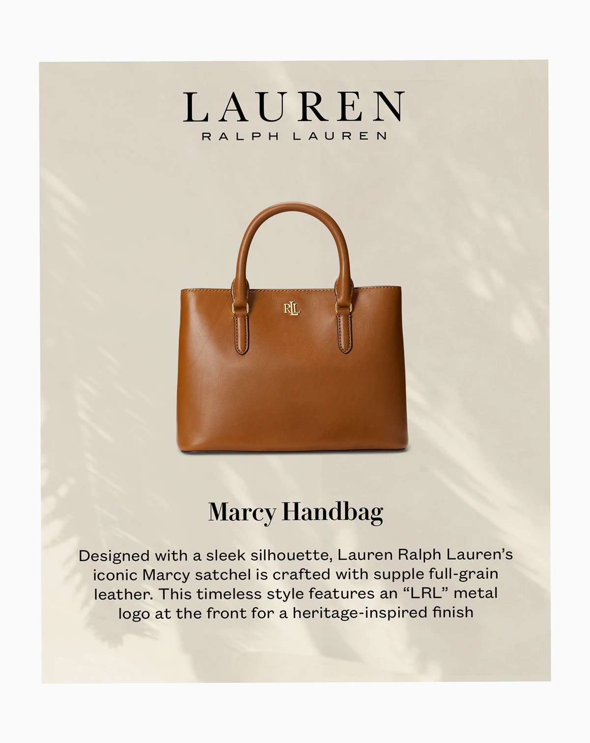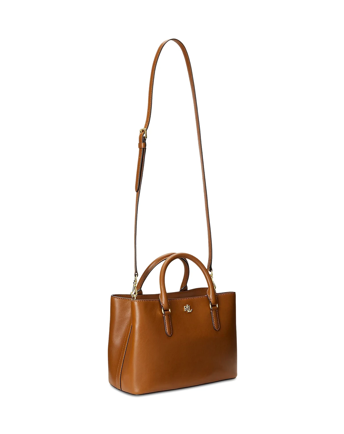 Crafted from supple full-grain leather, Ralph Lauren's iconic Marcy Satchel is embellished with Lauren's signature monogram and equipped with a removable, adjustable crossbody strap for versatility and hands-free styling.