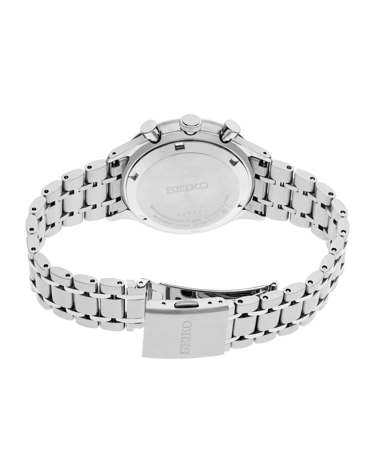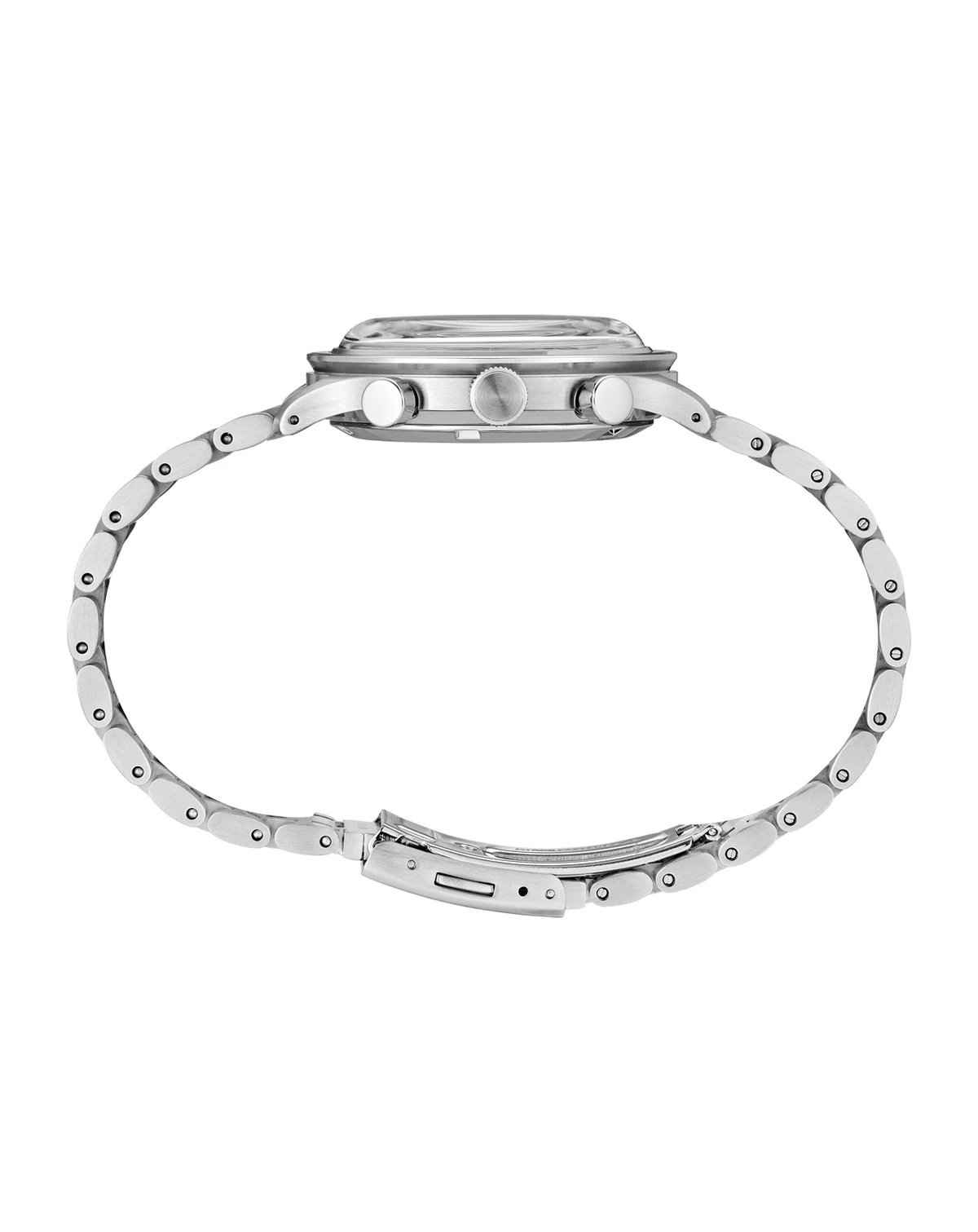 From the Essentials Collection. Inspired by motor sports, this dynamic timepiece features a black dial with bold, high-contrast beige sub dials at 3, 6, and 9 o'clock styled to suggest a classic sports car. Framed by a black tachymeter bezel, the dial offers a date calendar and LumiBrite hands and markers, while the chronograph provides measurement of up to 60 minutes of elapsed time in 1/5-second increments. The vintage-inspired creation is crafted of stainless steel, with smooth curves and a combination of mirror and hairline finishes and is paired with a sleek multi-row bracelet