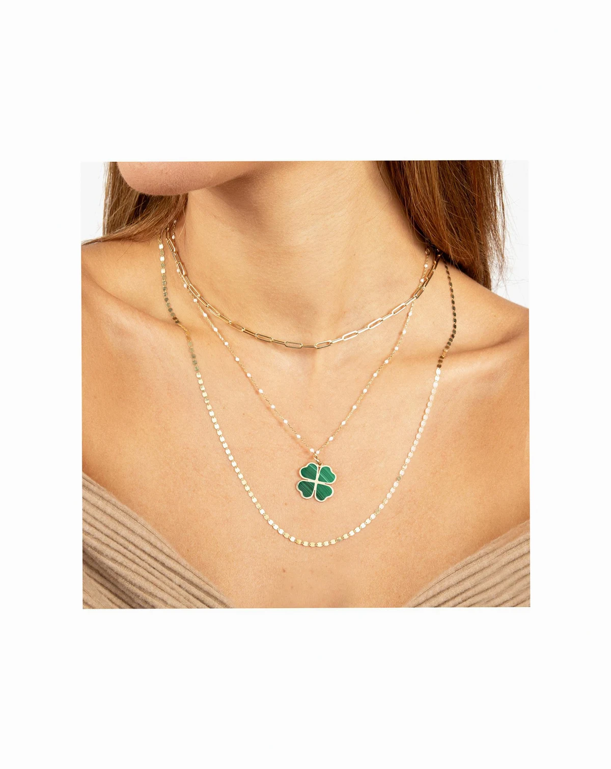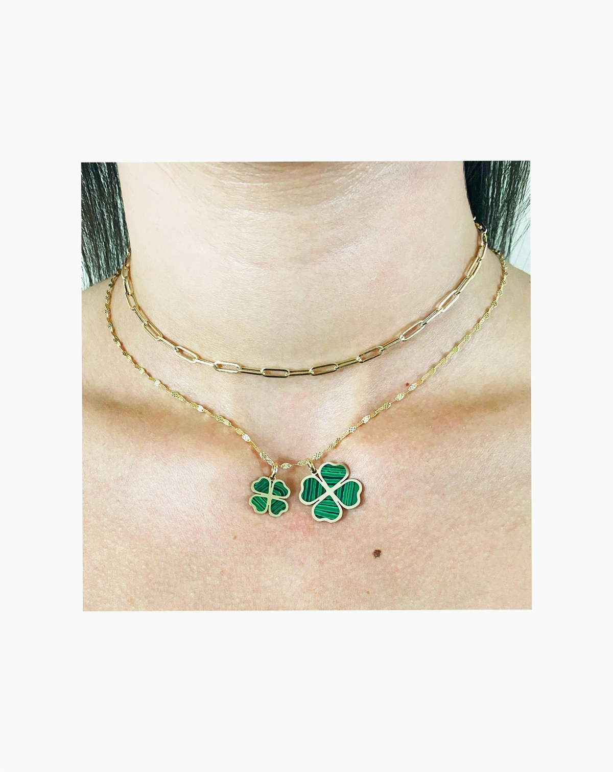 The Lovery malachite lucky clover charm in 14K Yellow Gold with 1 clover shaped malachite. This piece measures 18 millimeters - 0.70 inch and is identical on both sides.