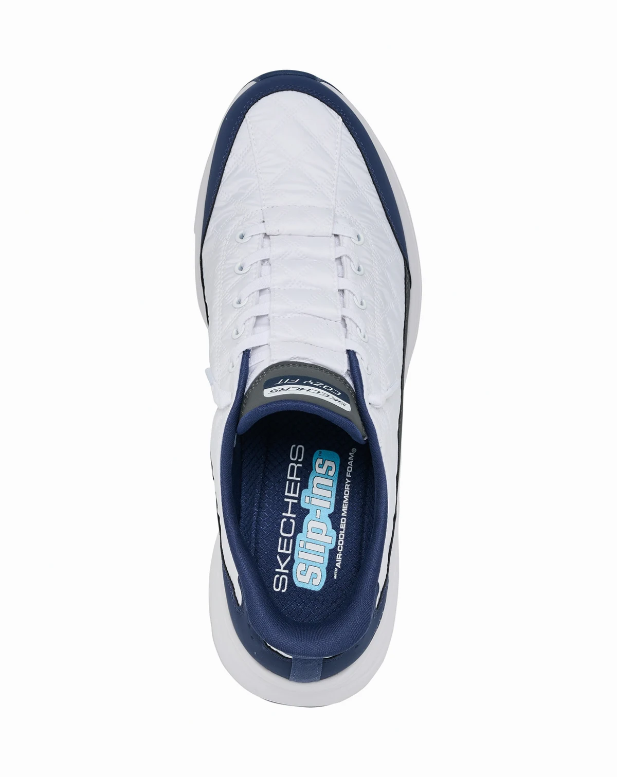Minimalist style and mellowed-out comfort are in perfect harmony on the Skechers Men's Slip-ins: Contour Foam - Cozy Fit Walking Sneakers. Crafted with quilted fabric and a synthetic overlay upper and Skechers No Tie Fit laces, this low-profile silhouette is equipped with plush adaptive Contour Foam cushioning, a stabilizing Skechers Exclusive Heel Pillow, and a sole-soothing Skechers Air-Cooled Memory Foam insole.