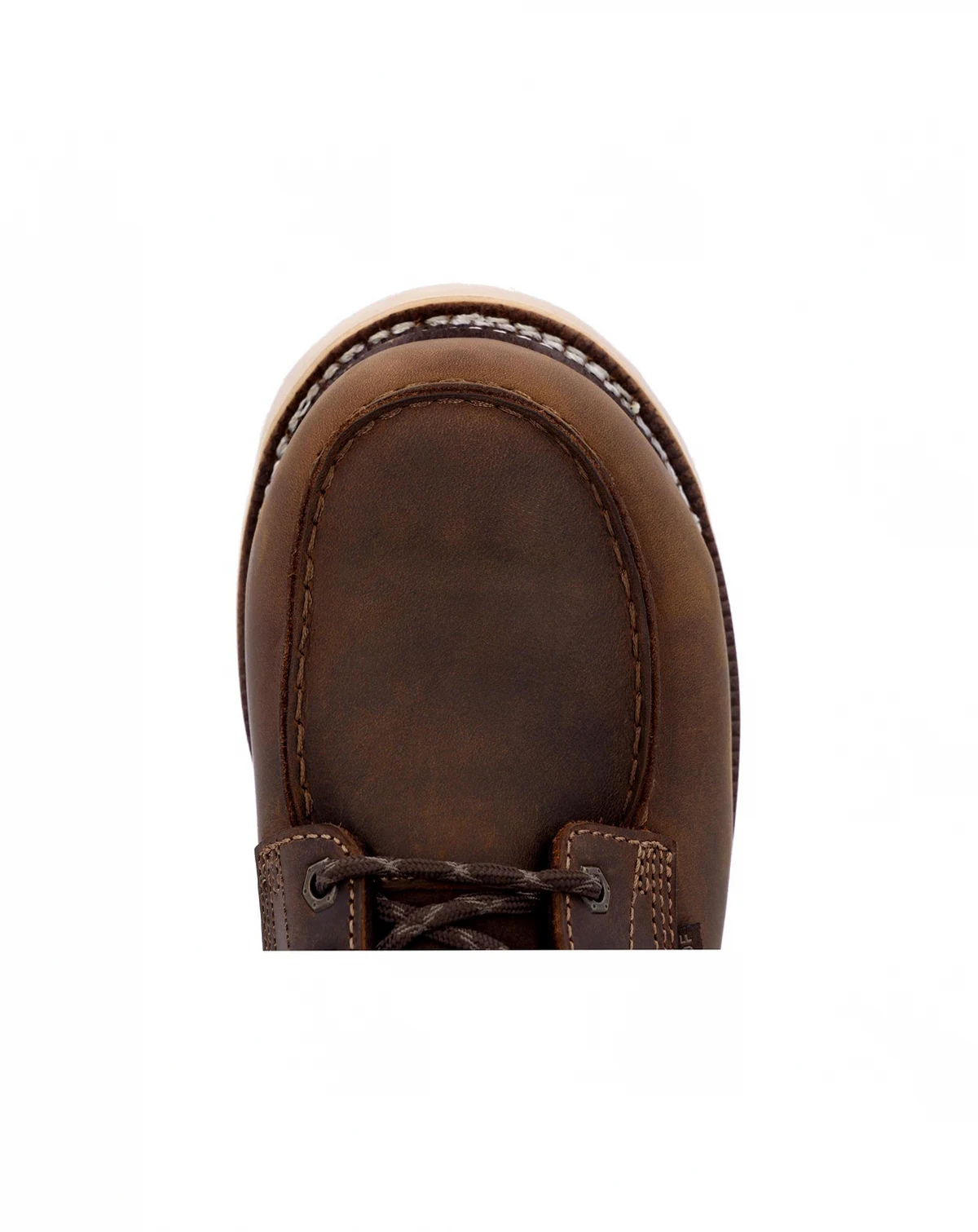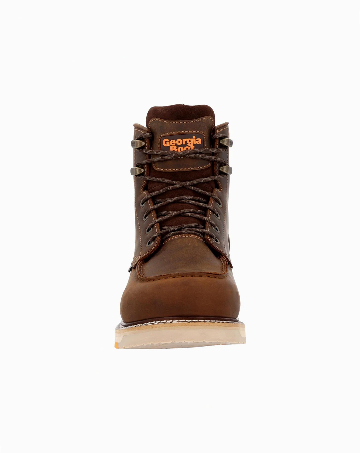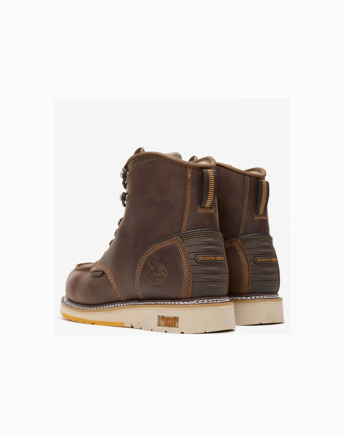 The Georgia Boot AMP LT Moc-Toe Work Boot contains an Ergo-Fit composite toe for added safety without compromising the comfort and durability. This 6 waterproof wedge features our incredibly tough and abrasion-resistant SPR leather, a heel-stabilizing Counter Lock System, and a padded counter pocket for additional heel support. It comes with an additional set of laces. The boot interior features our removable AMP LT memory foam insole and the Georgia Waterproof System for all-day comfort guaranteed to keep your feet dry. The foundation consists of a fiberglass shank, cushioning EVA midsole, and a Carbo-Tec Rubber outsole. This boot meets ASTM F2413 Protective Toe Classification and ASTM F2413 Electrical Hazard Classification..
