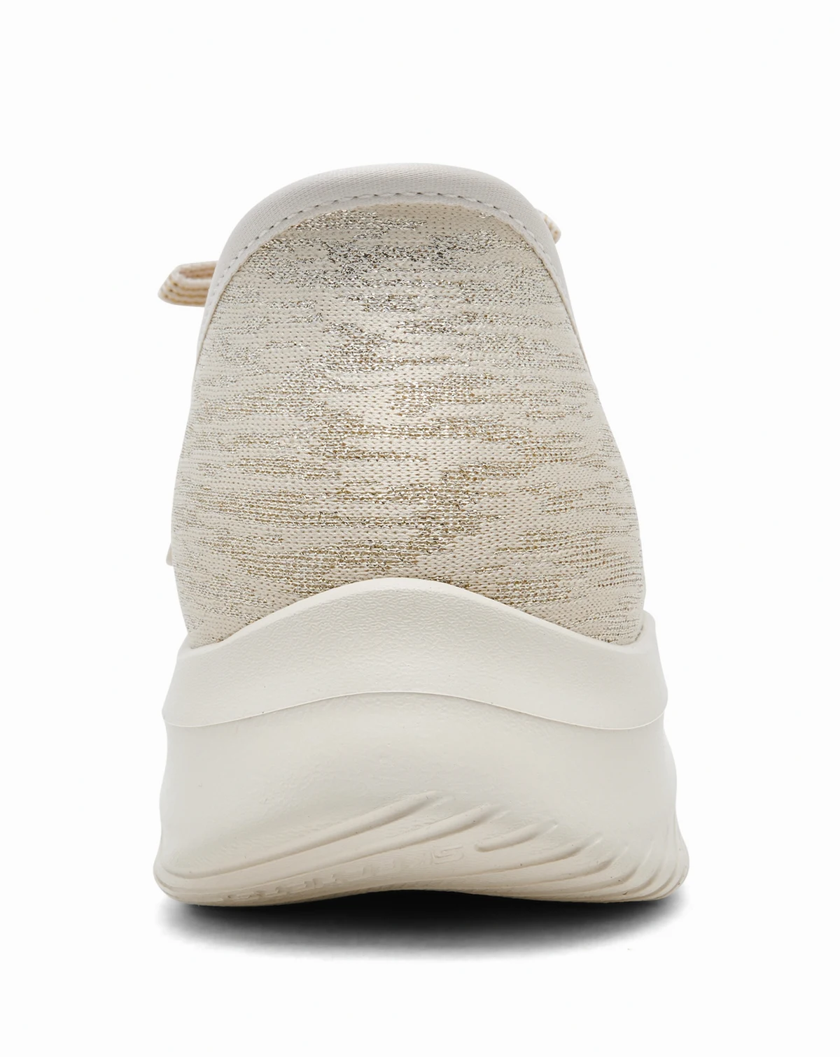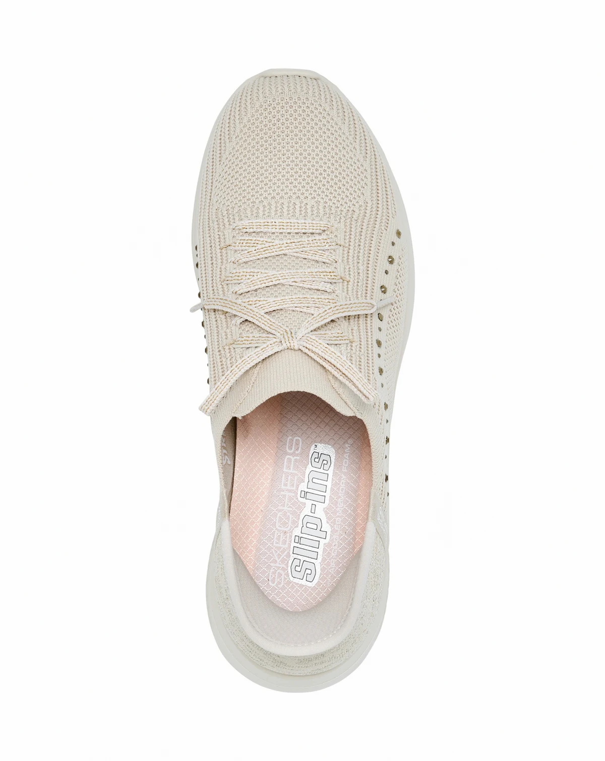 Radiate in every room you step foot in wearing these Skechers Women's Slip-ins: Ultra Flex 3.0 - Summer Stripe Slip-On Casual Sneakers. Crafted with bedazzled engineered knit uppers, this slip-on Stretch Fit silhouette equips cushy Skechers Air-Cooled Memory Foam® and a super flexible traction outsole, featuring a lustrous metallic heel detail for an added dose of glam.