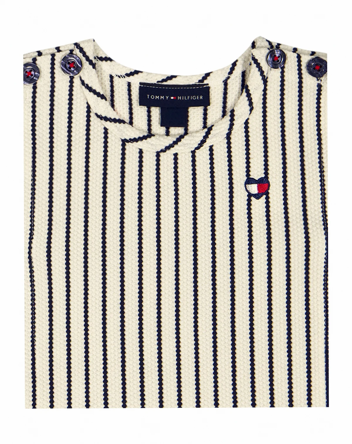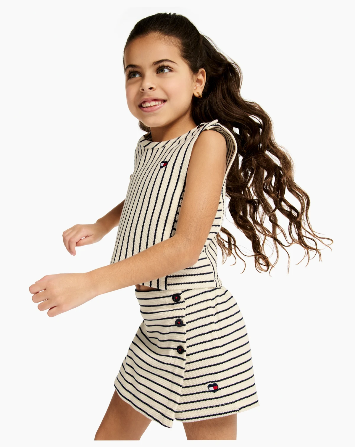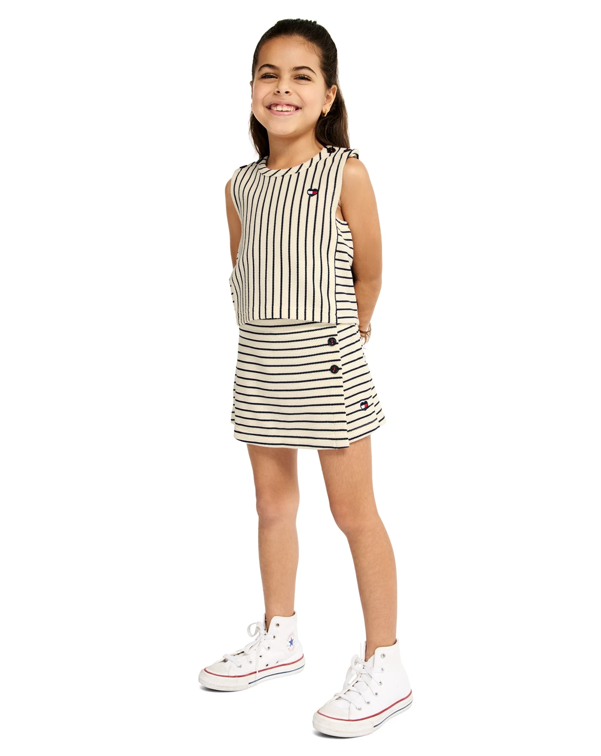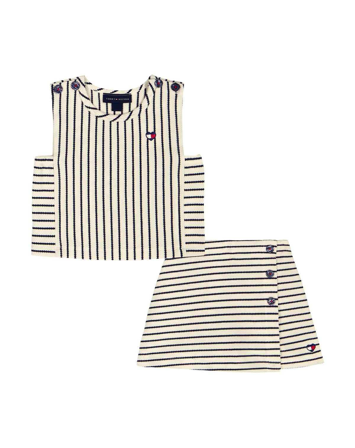 Keep her stylish and comfy in this Tommy Hilfiger outfit set, crafted from softly textured popcorn knit. The striped top pairs with a button-front wrap skort featuring shorts underneath and elastic edging for secure, carefree all-day play.