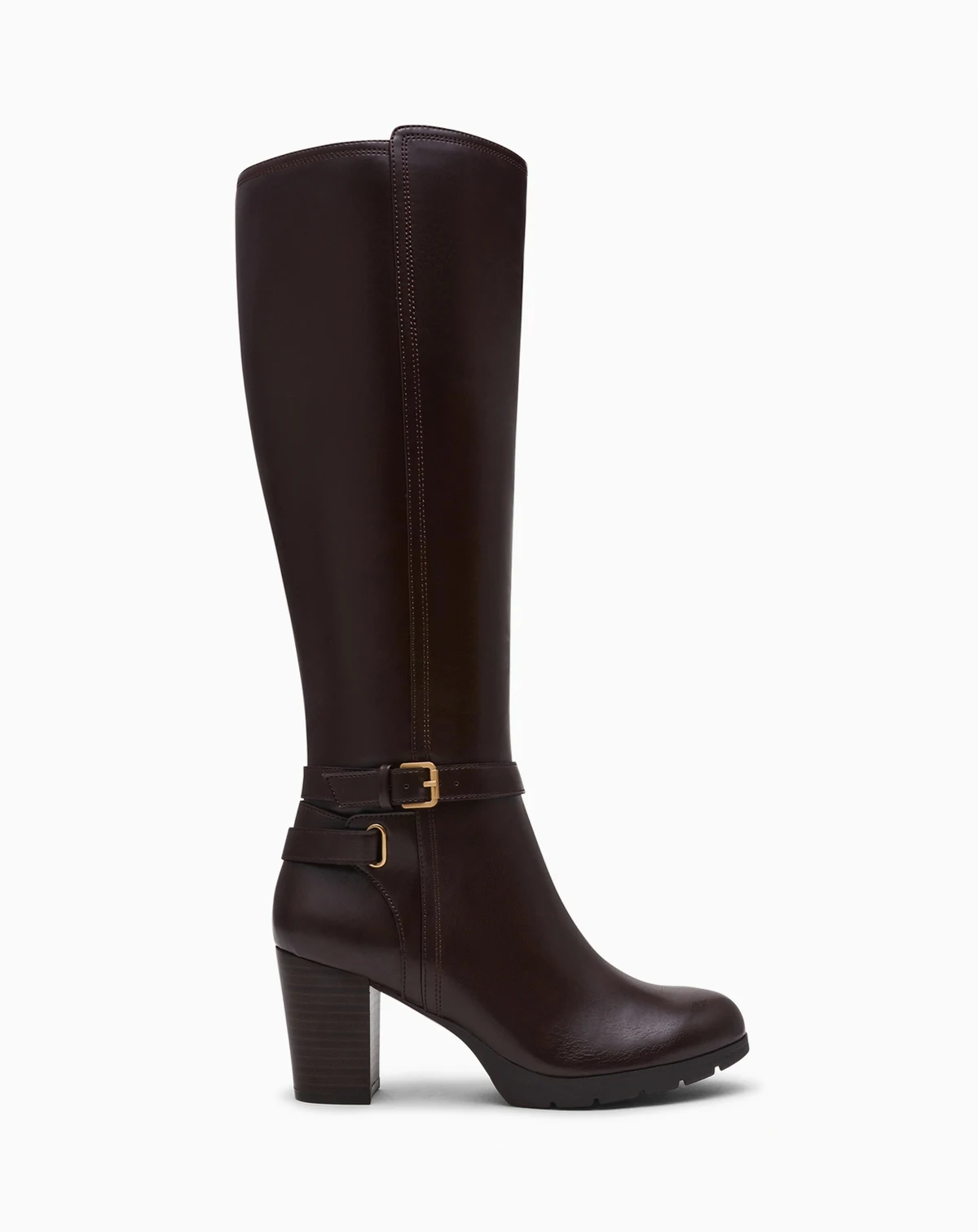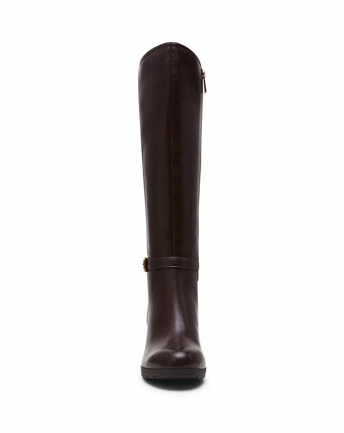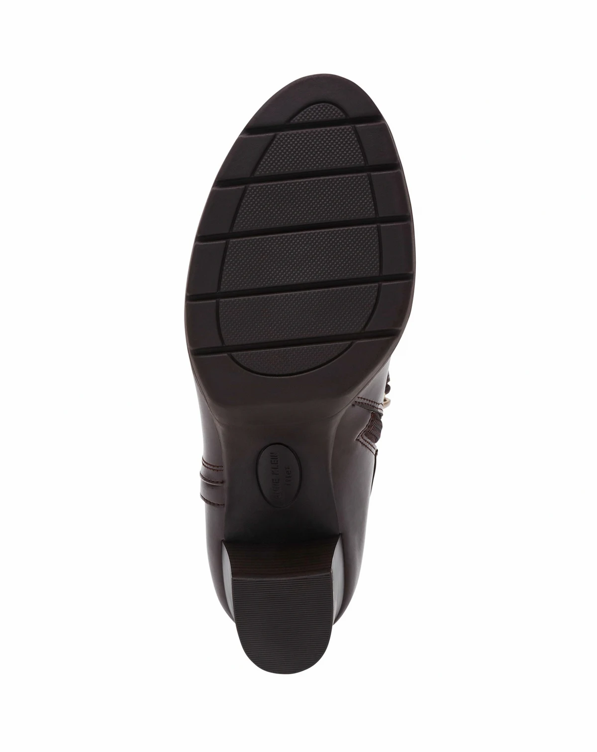 Experience effortless elegance with these Anne Klein knee-high boots, featuring a smooth polished finish and rounded toe. A modest heel and delicate metallic accent at the ankle add a refined touch to this versatile design.