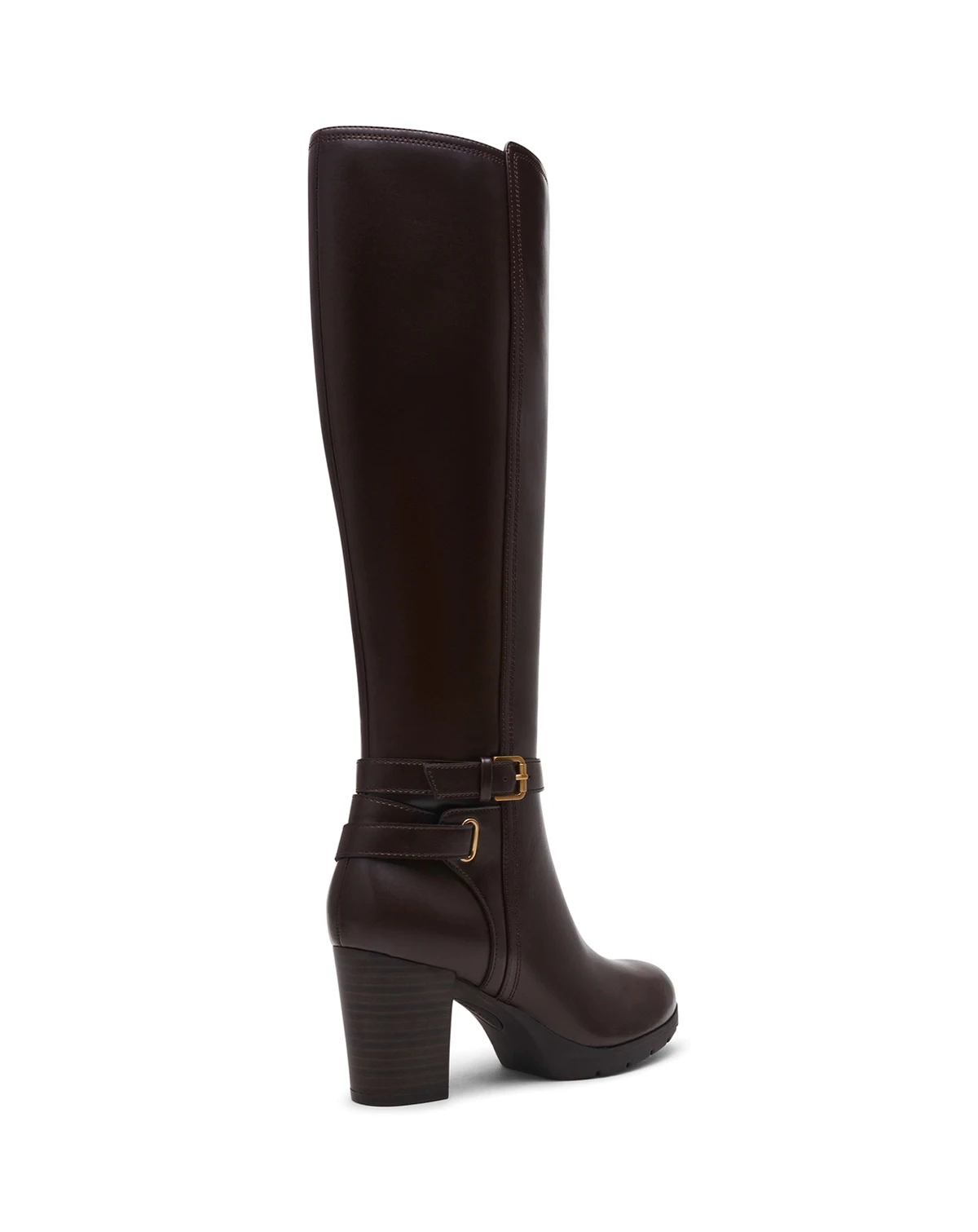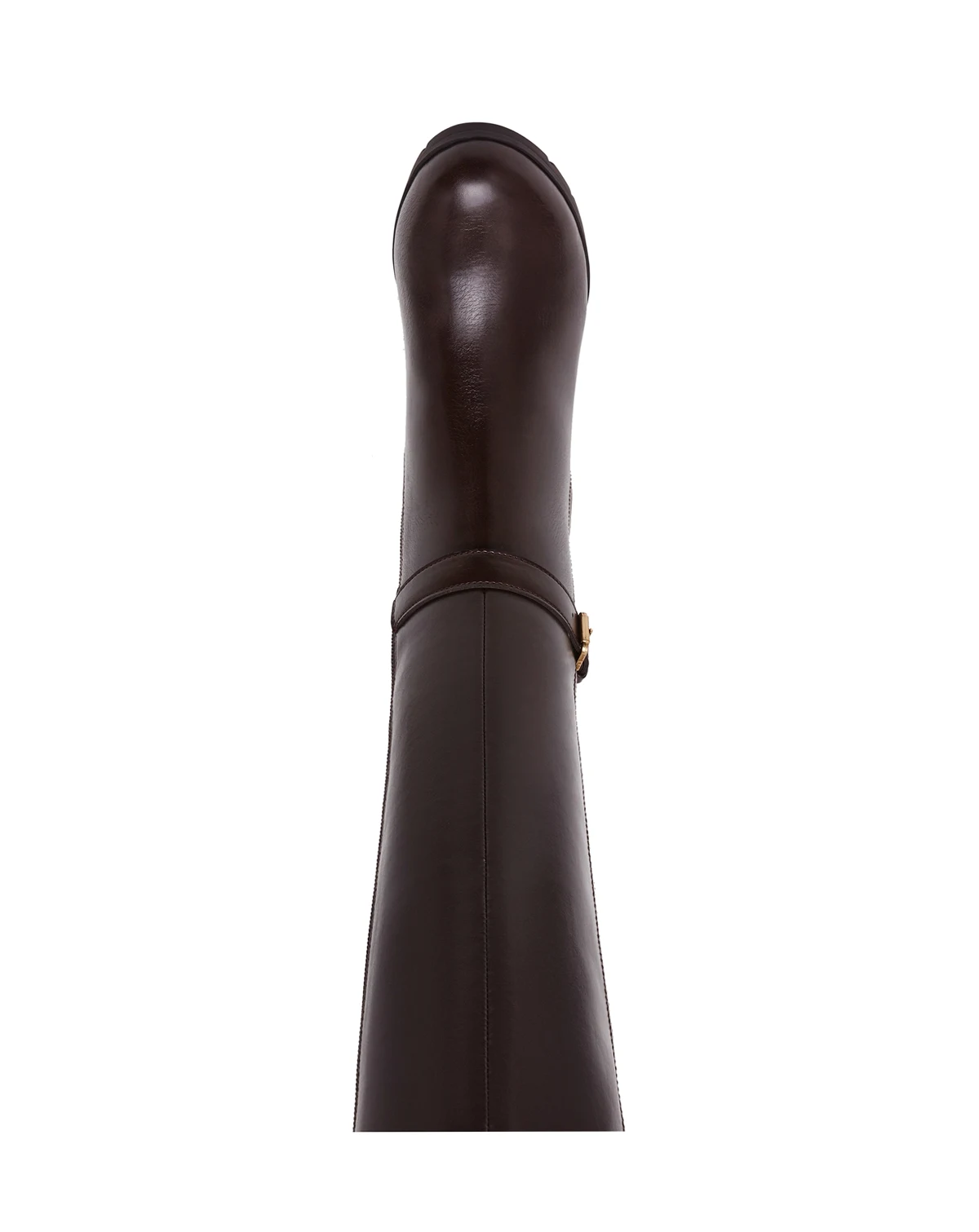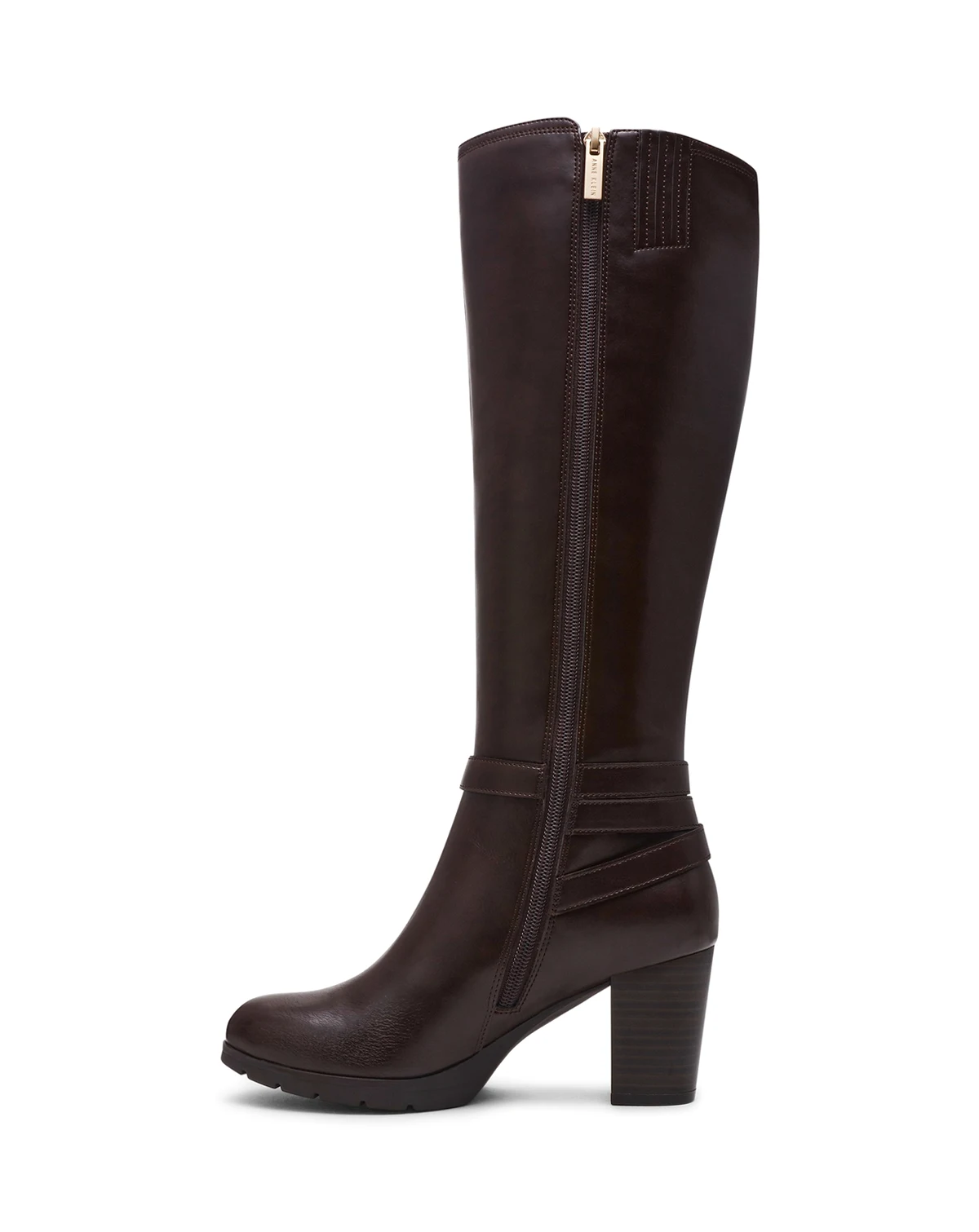 Experience effortless elegance with these Anne Klein knee-high boots, featuring a smooth polished finish and rounded toe. A modest heel and delicate metallic accent at the ankle add a refined touch to this versatile design.